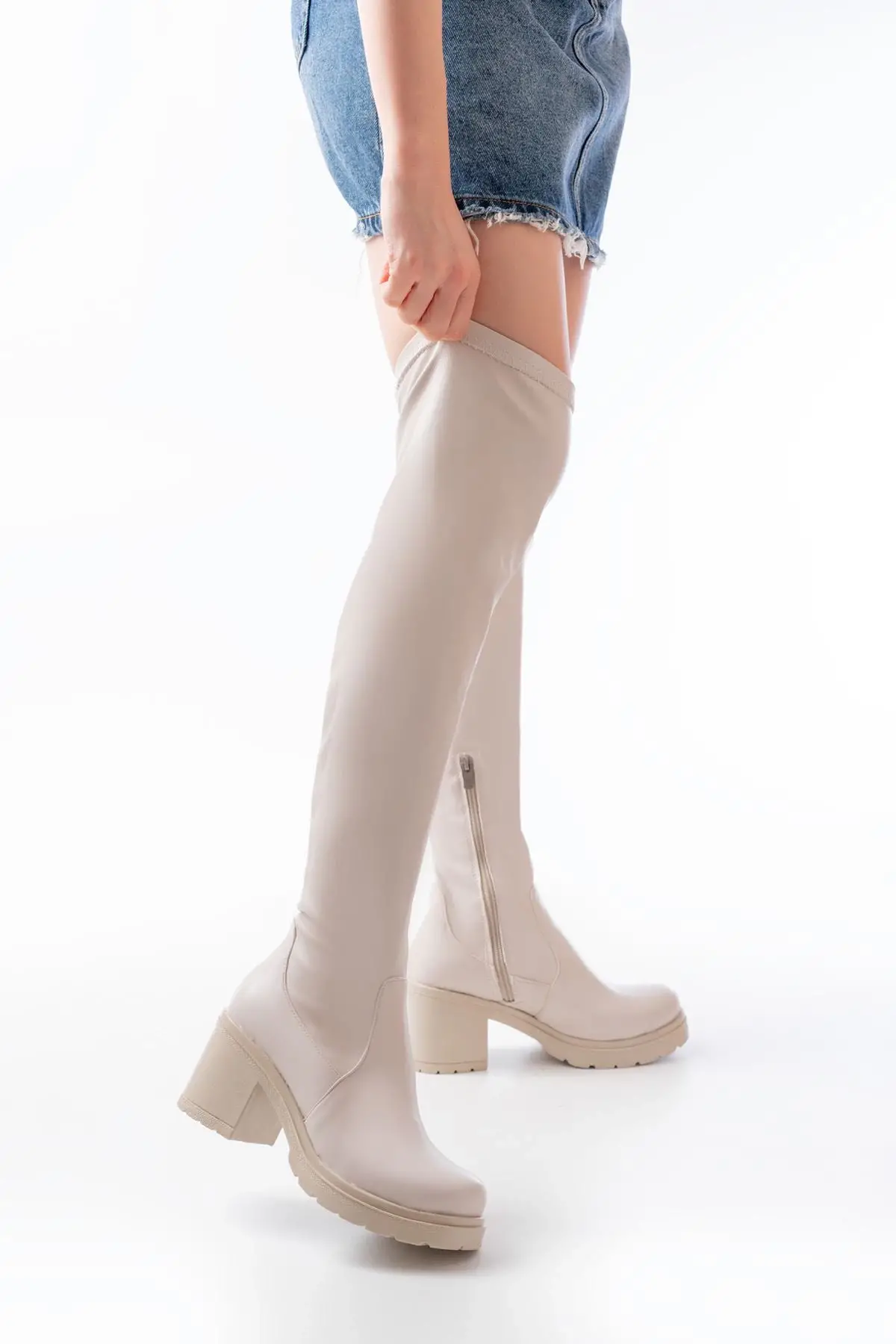 Bej Streç Günlük Kalın Topuklu Kadın Çizme