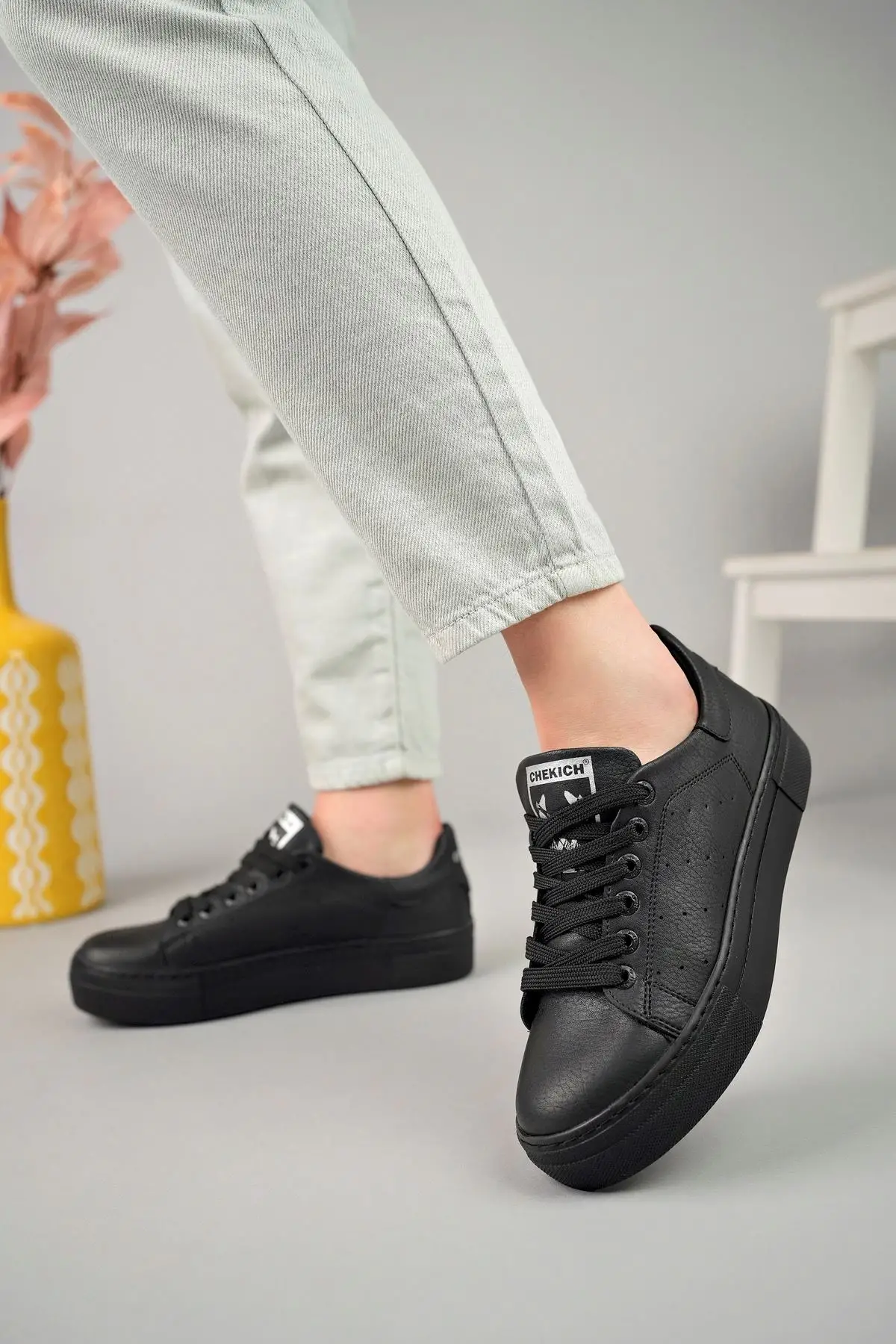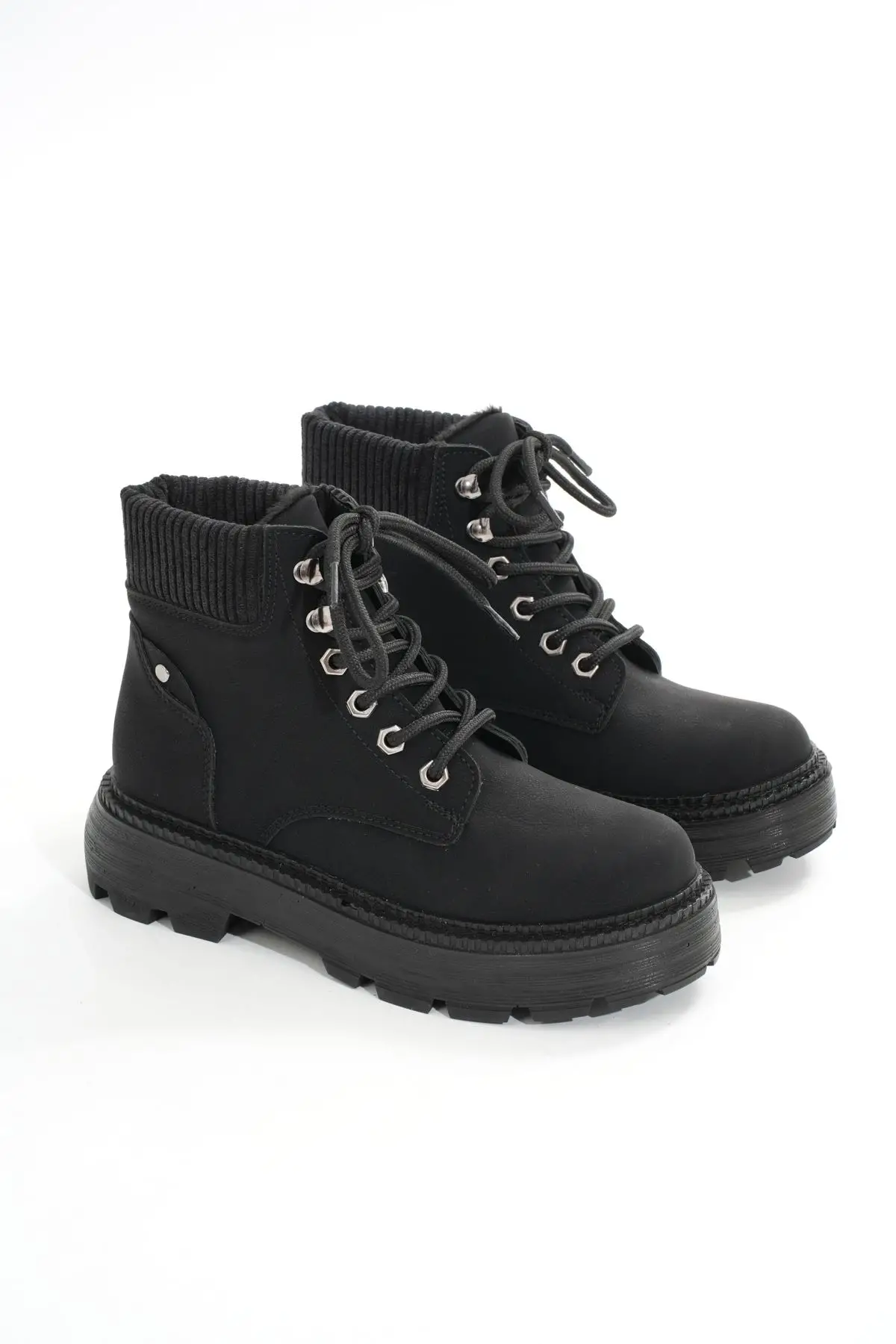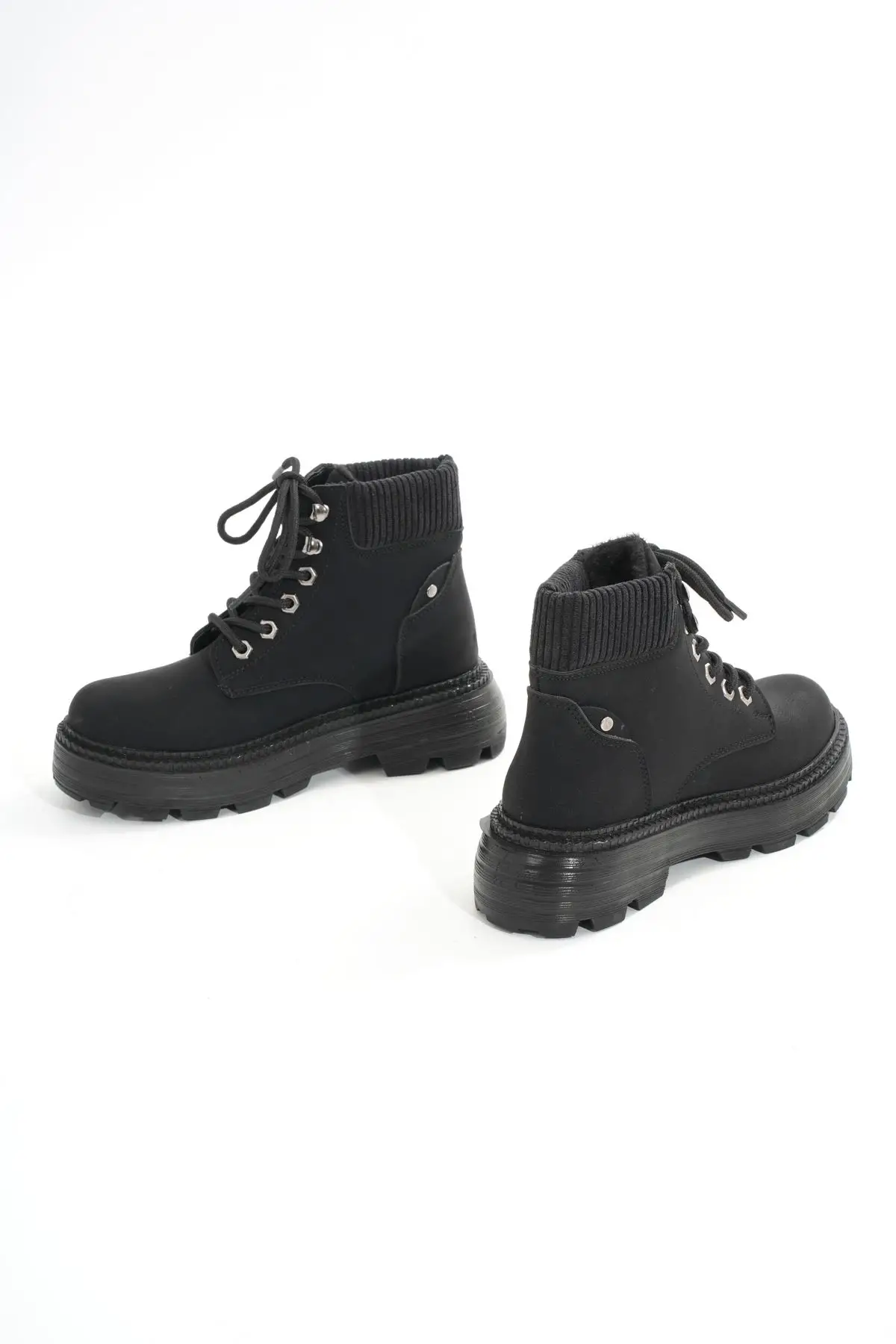 Kömür Siyahı Bağcıklı Kalın Taban Kadın Günlük Bot