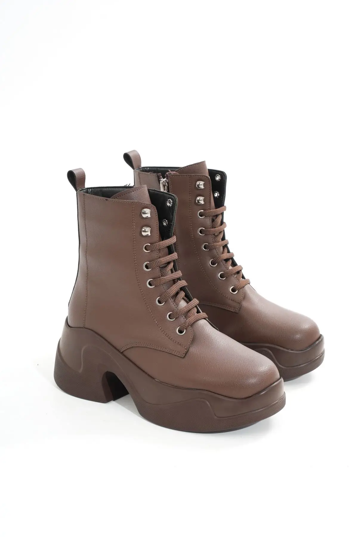 Kahverengi Yüksek Tabanlı Bağcıklı Fermuarlı Günlük Kadın Bot