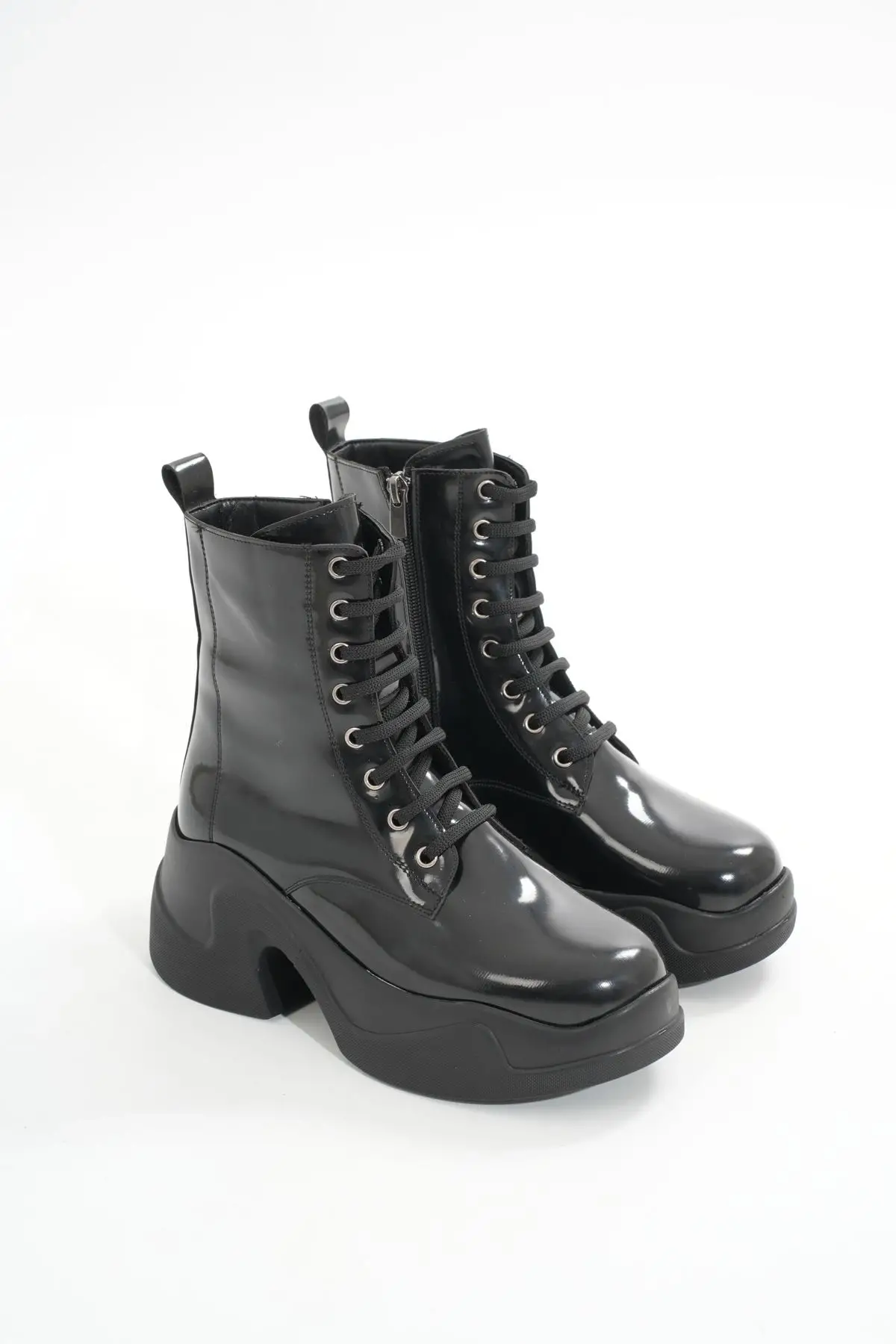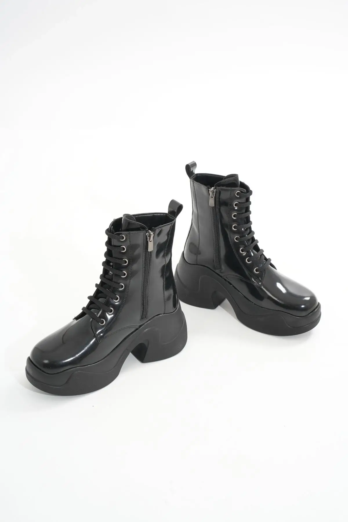 Siyah Rugan Yüksek Tabanlı Bağcıklı Fermuarlı Günlük Kadın Bot