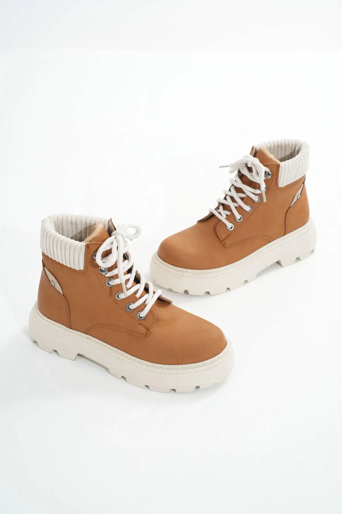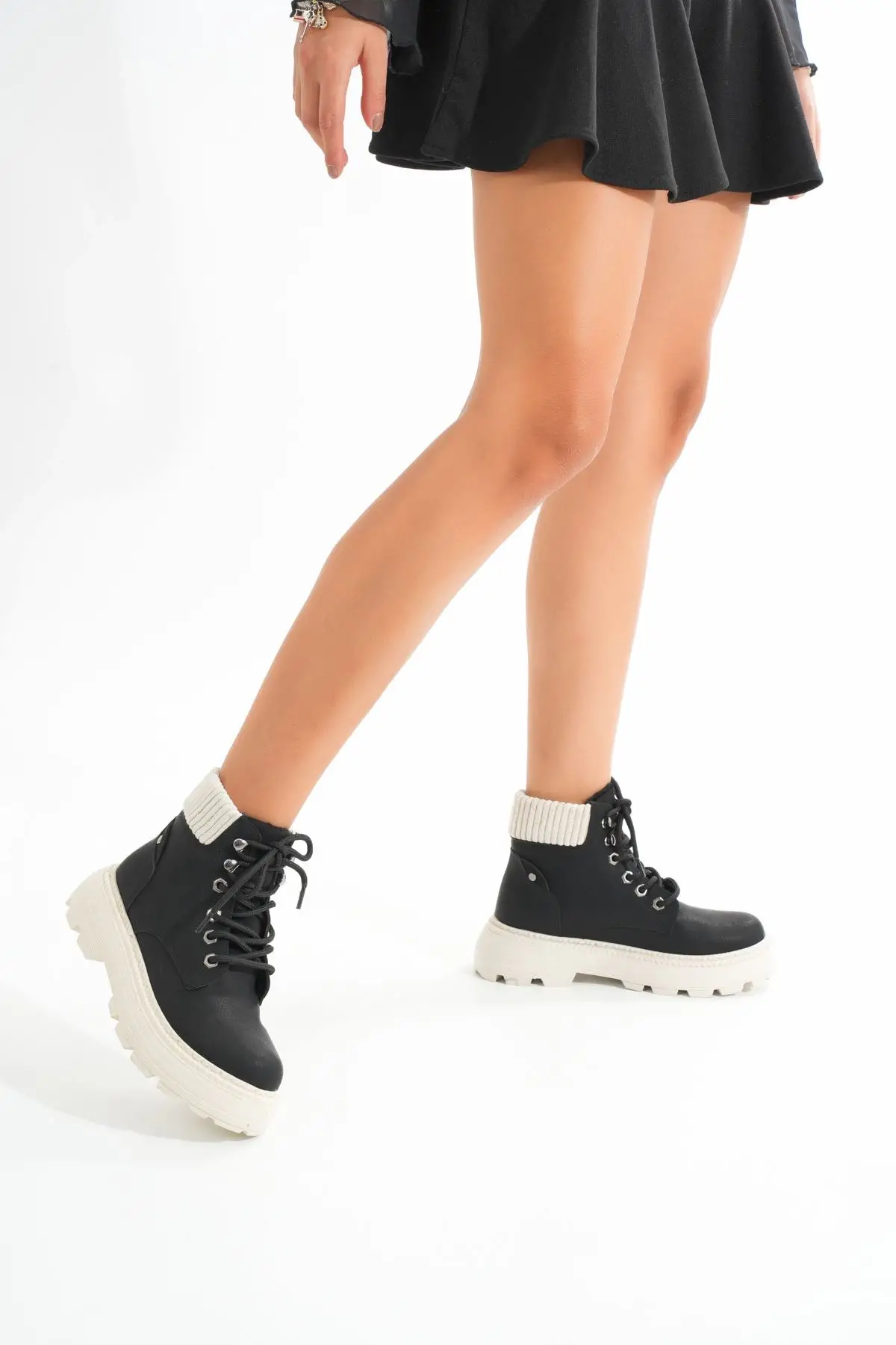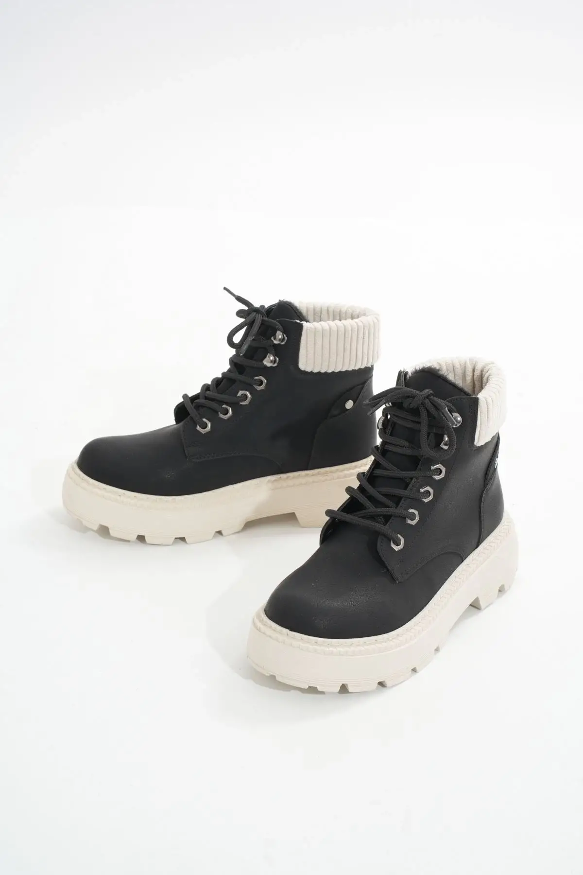 Siyah-Bej Bağcıklı Kalın Taban Kadın Günlük Bot