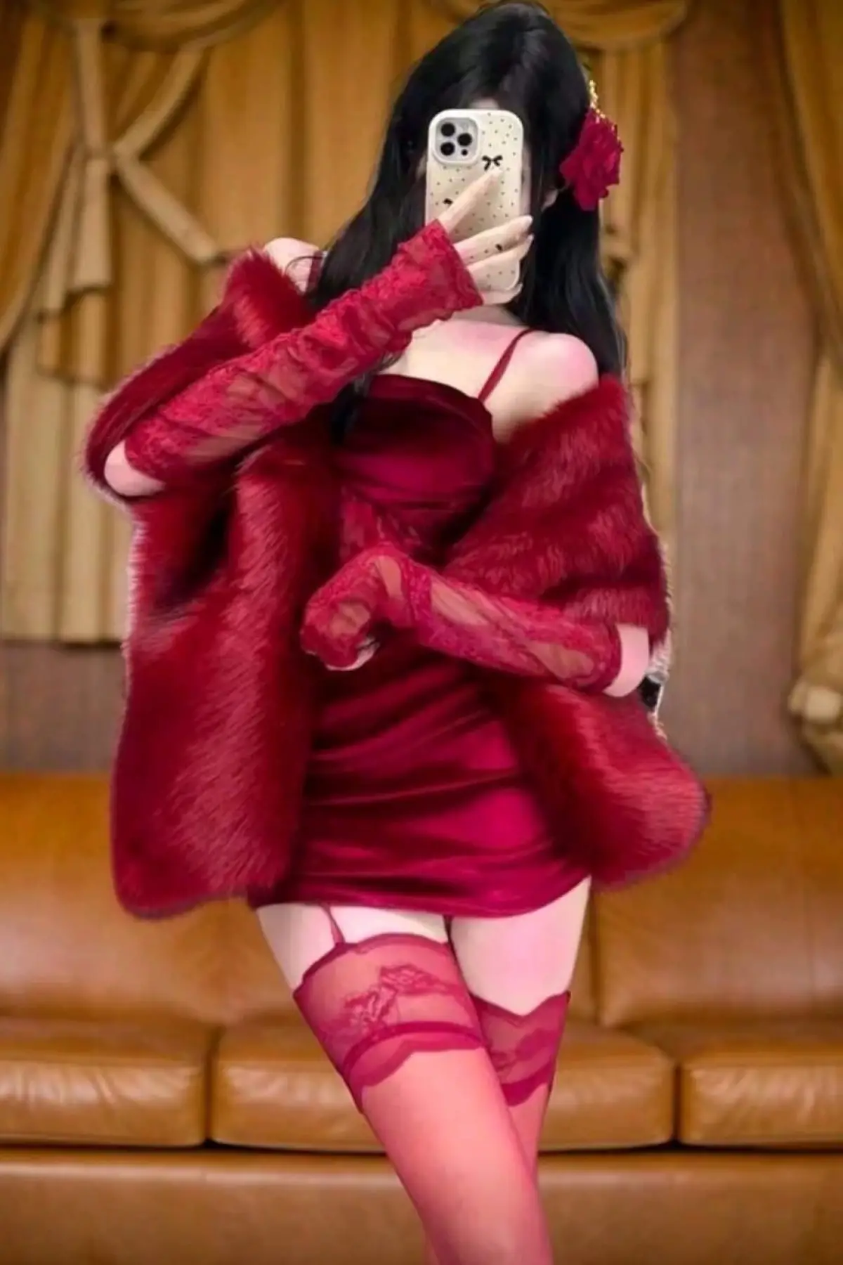 Göğüs Ucu Ponponlu Yılbaşı Kırmızı Fantazi Kostüm, Kadın Seksi Gecelik,jartiyer Takım,çorap Dahildir