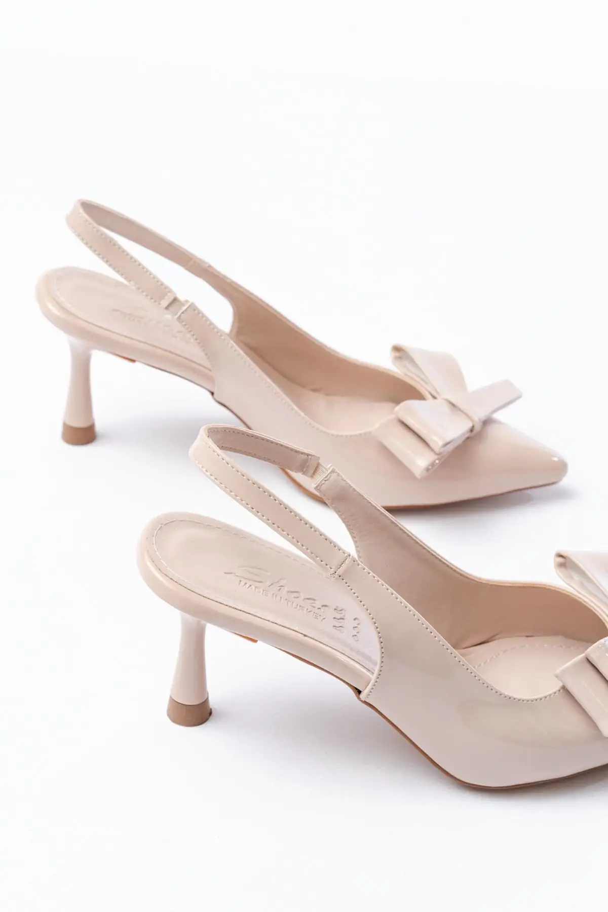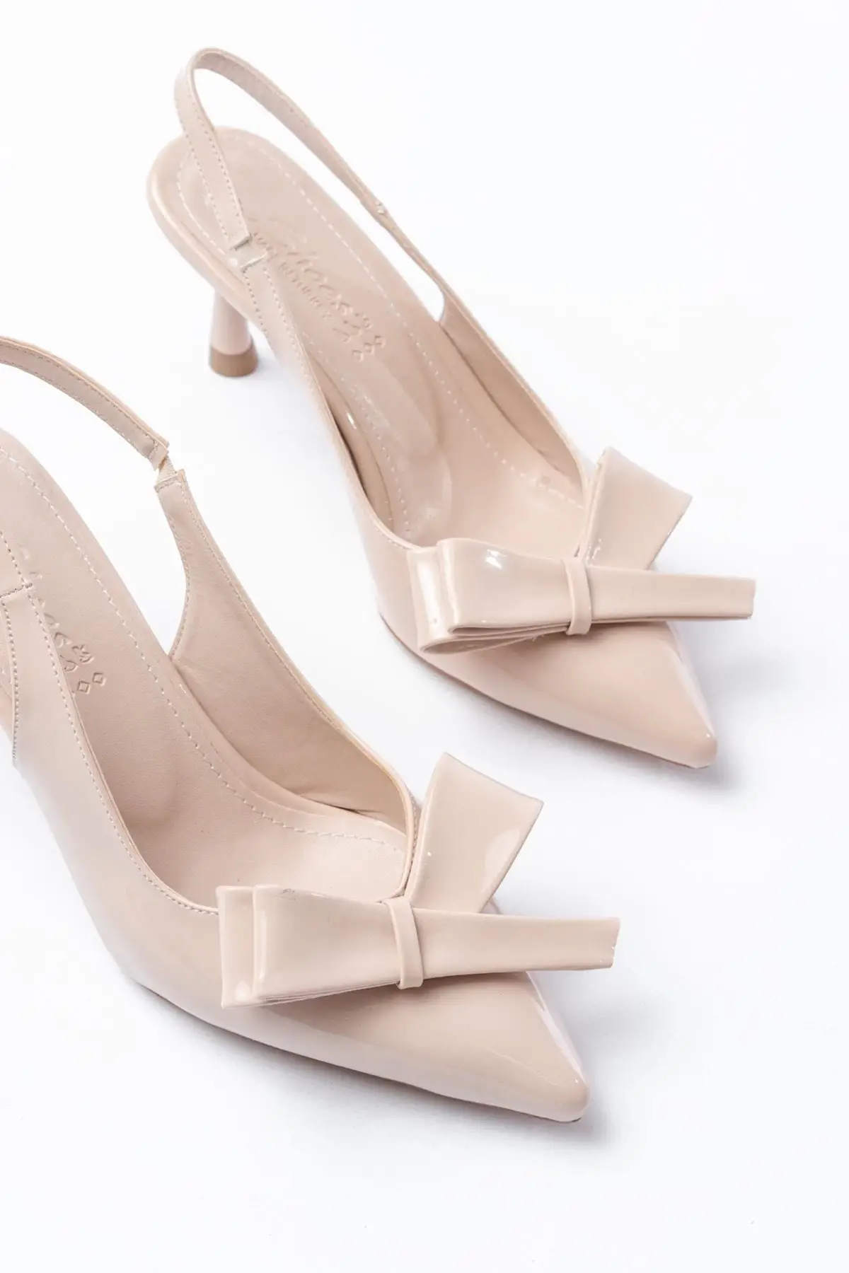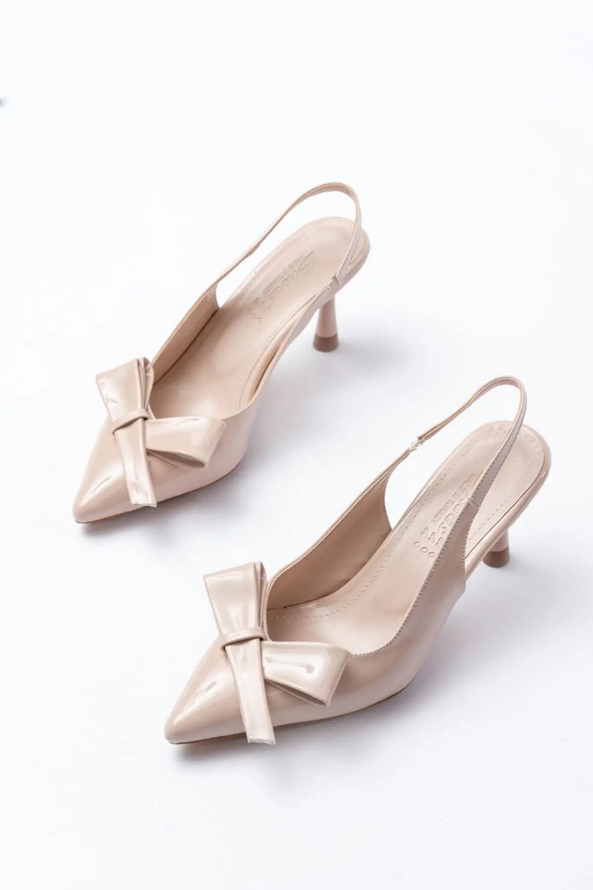 İNF-4501 Bej Rugan Günlük Arkası Açık Fiyonklu Topuklu Bayan Ayakkabı