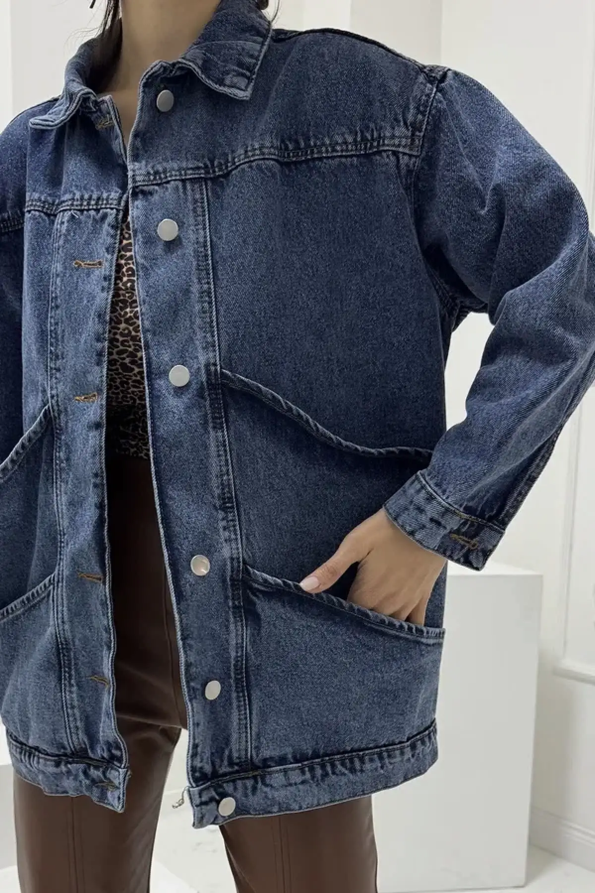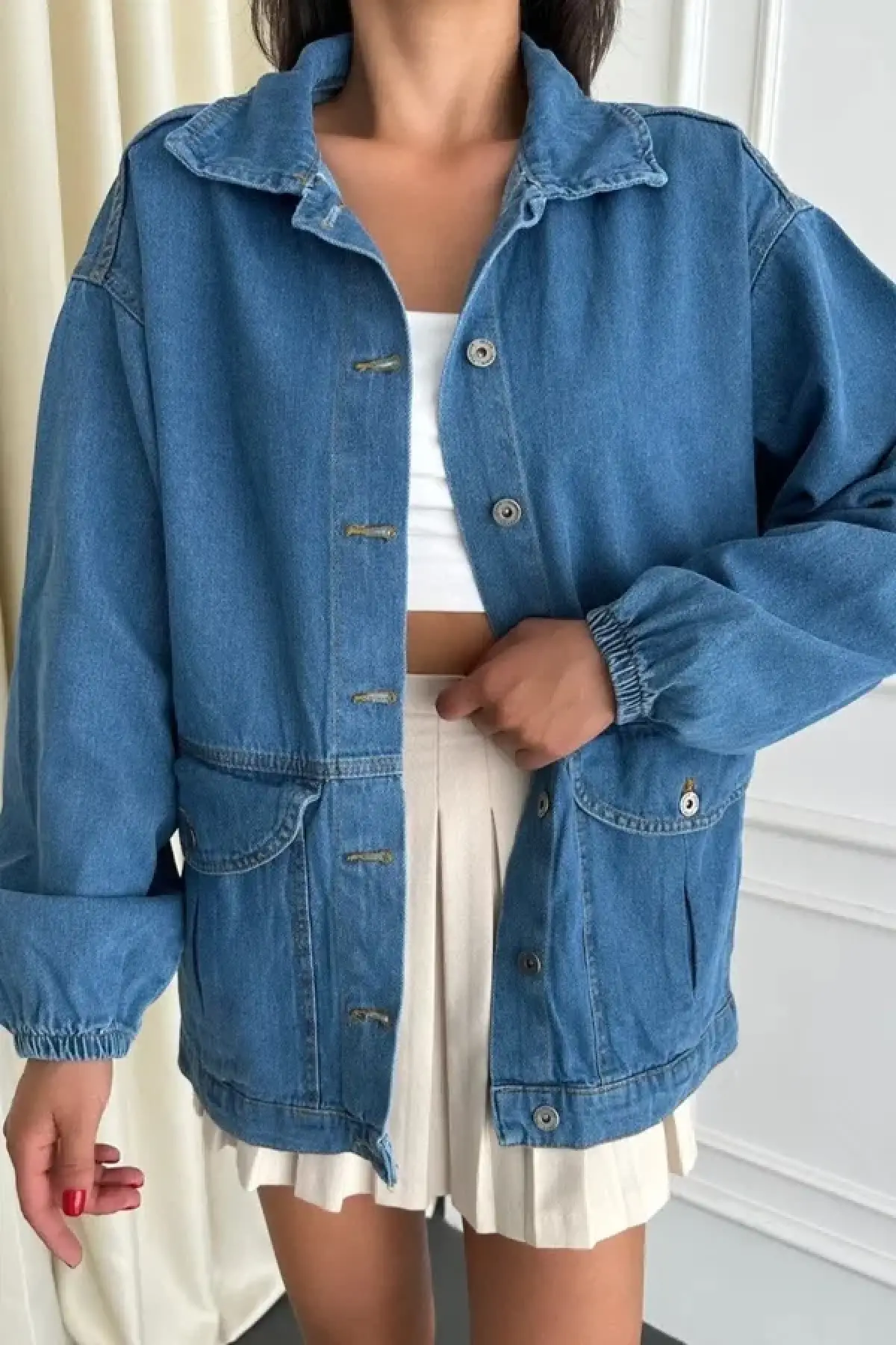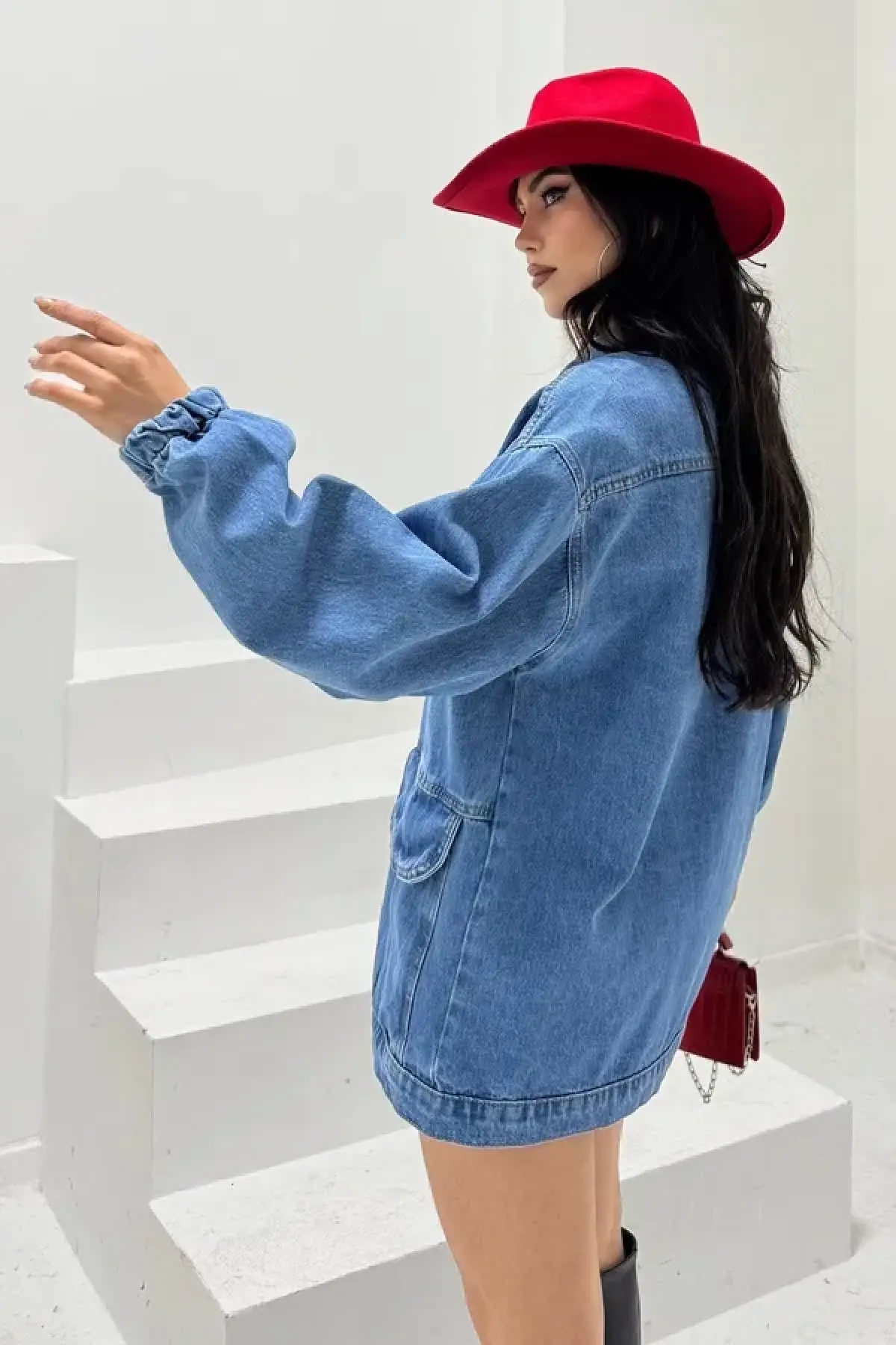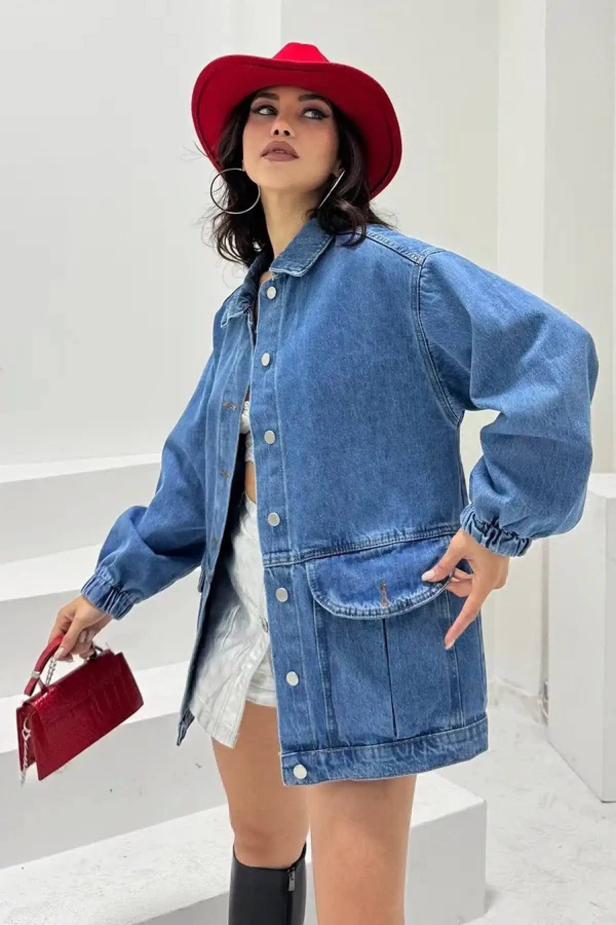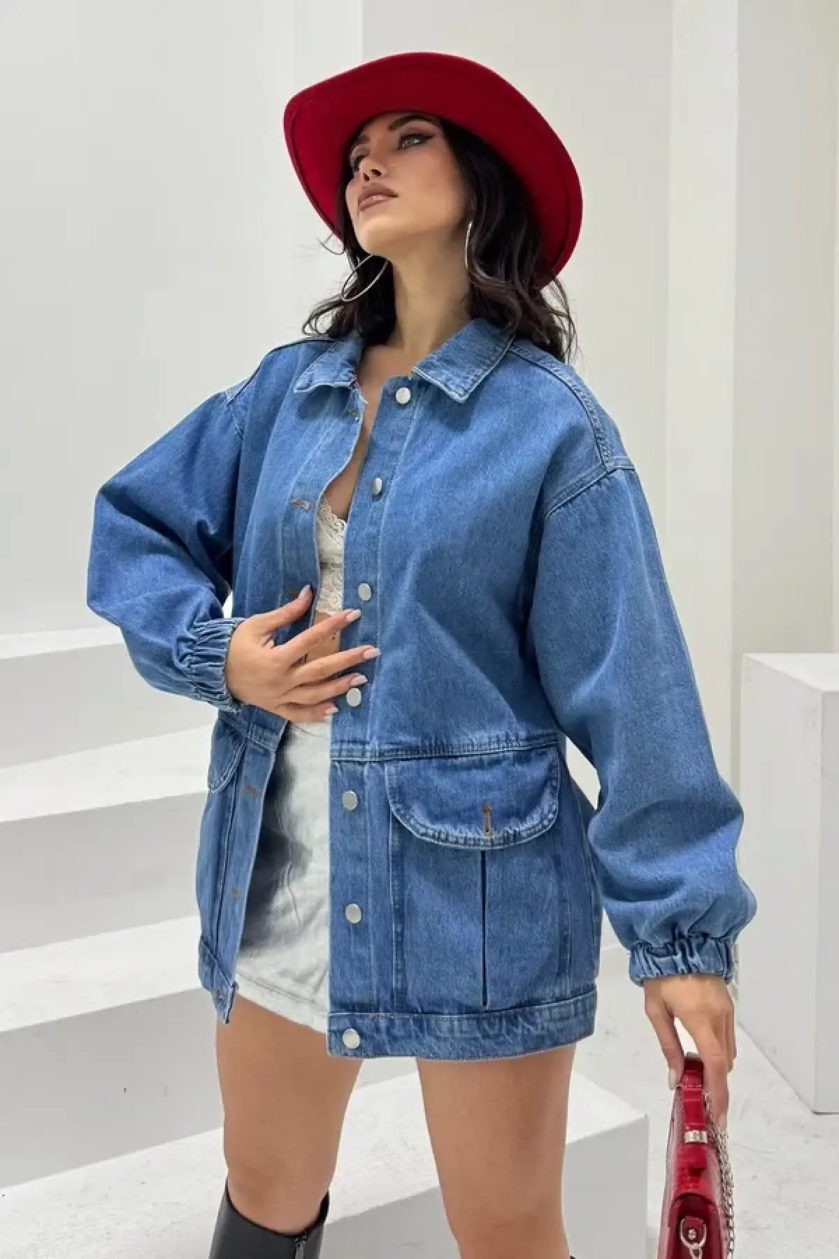 Düz Orta Kadın Mavi Cepli Kot Ceket