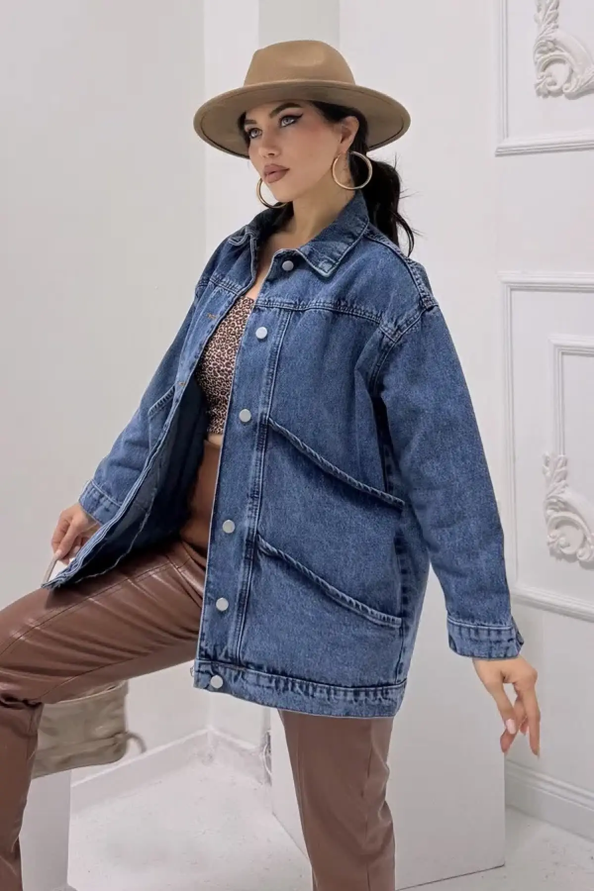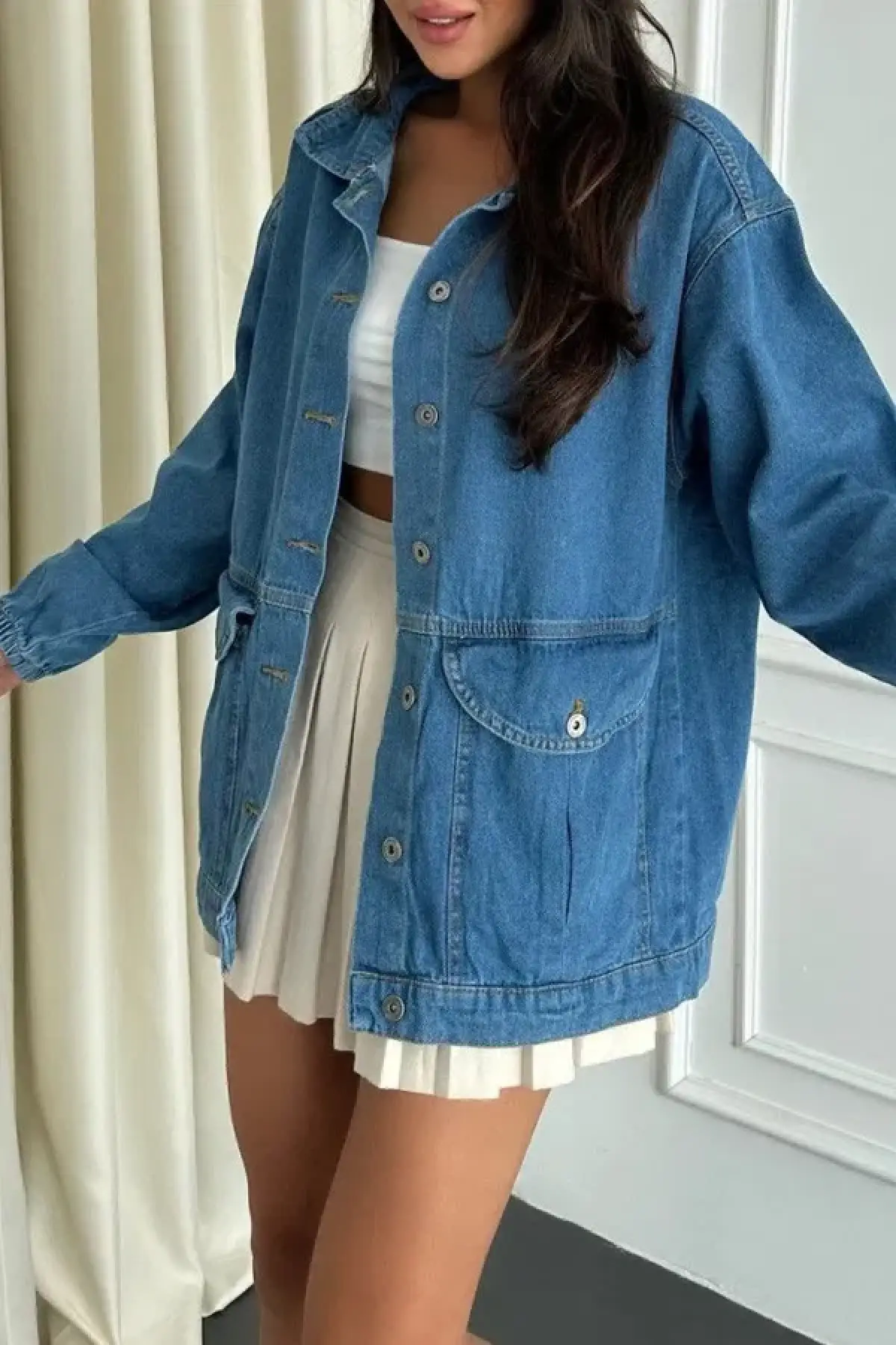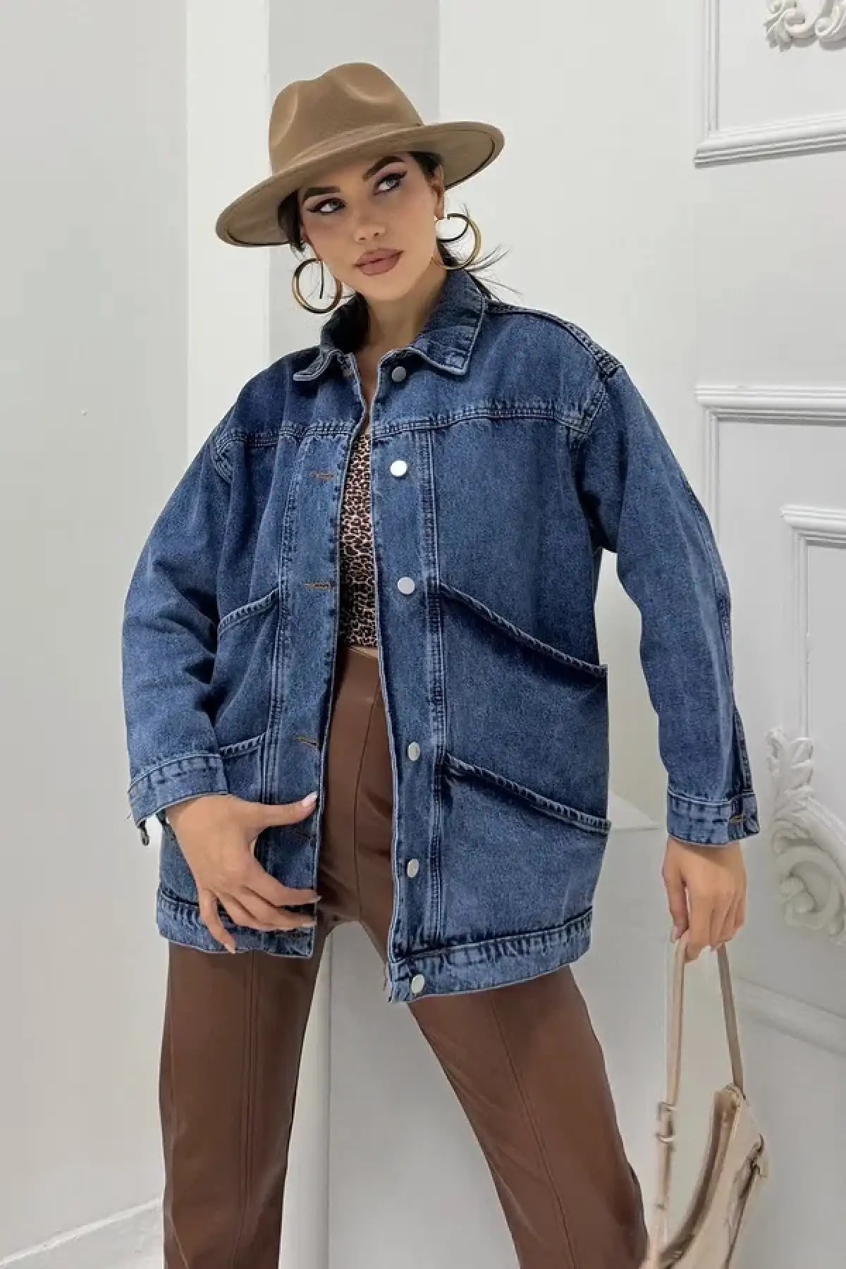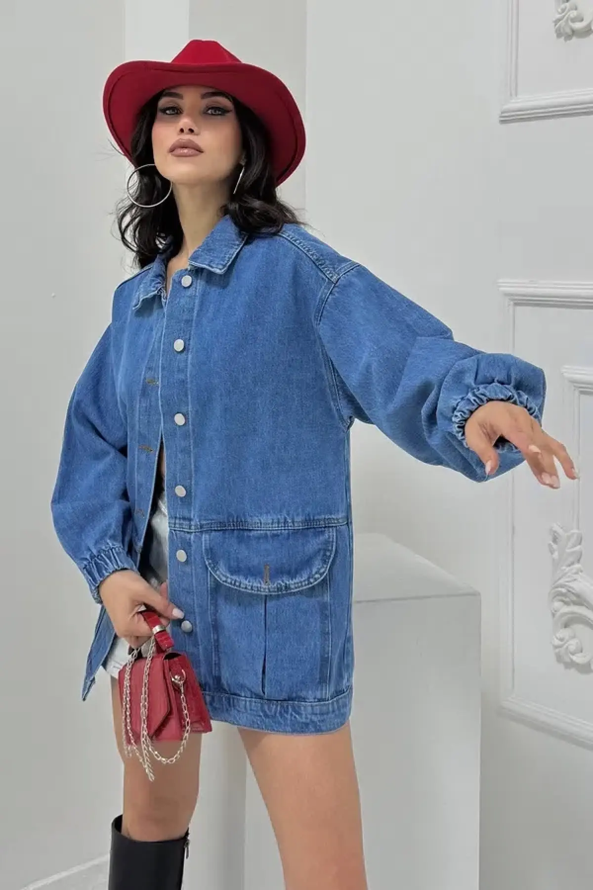 Düz Orta Kadın Mavi Cepli Kot Ceket