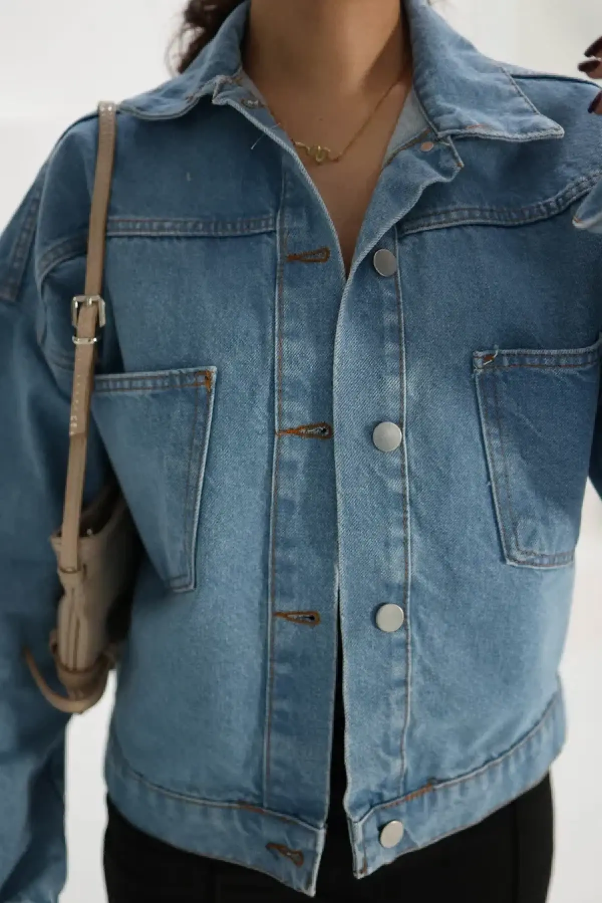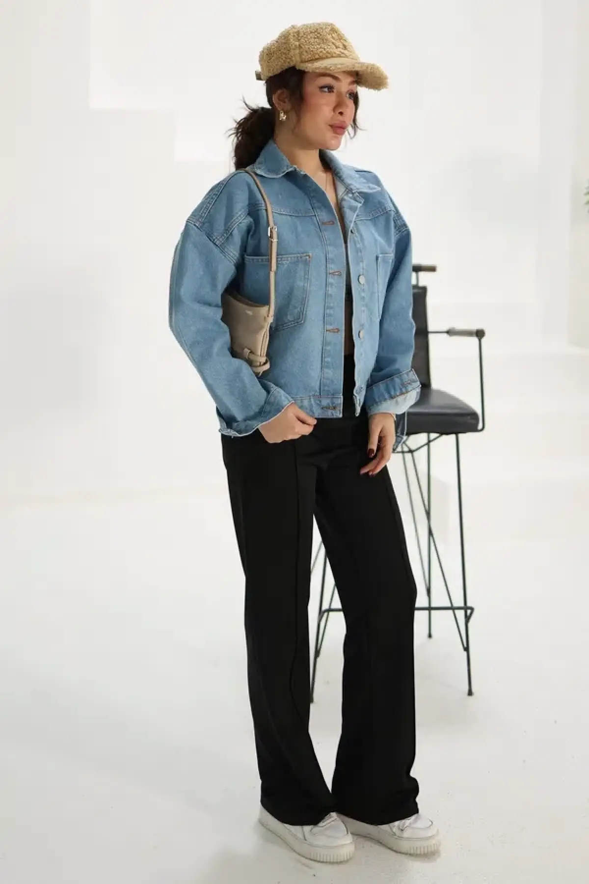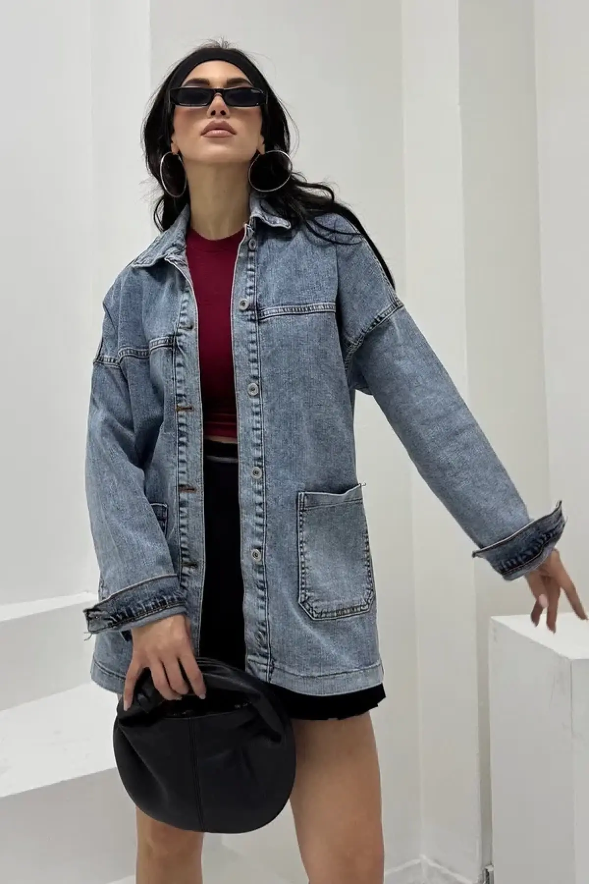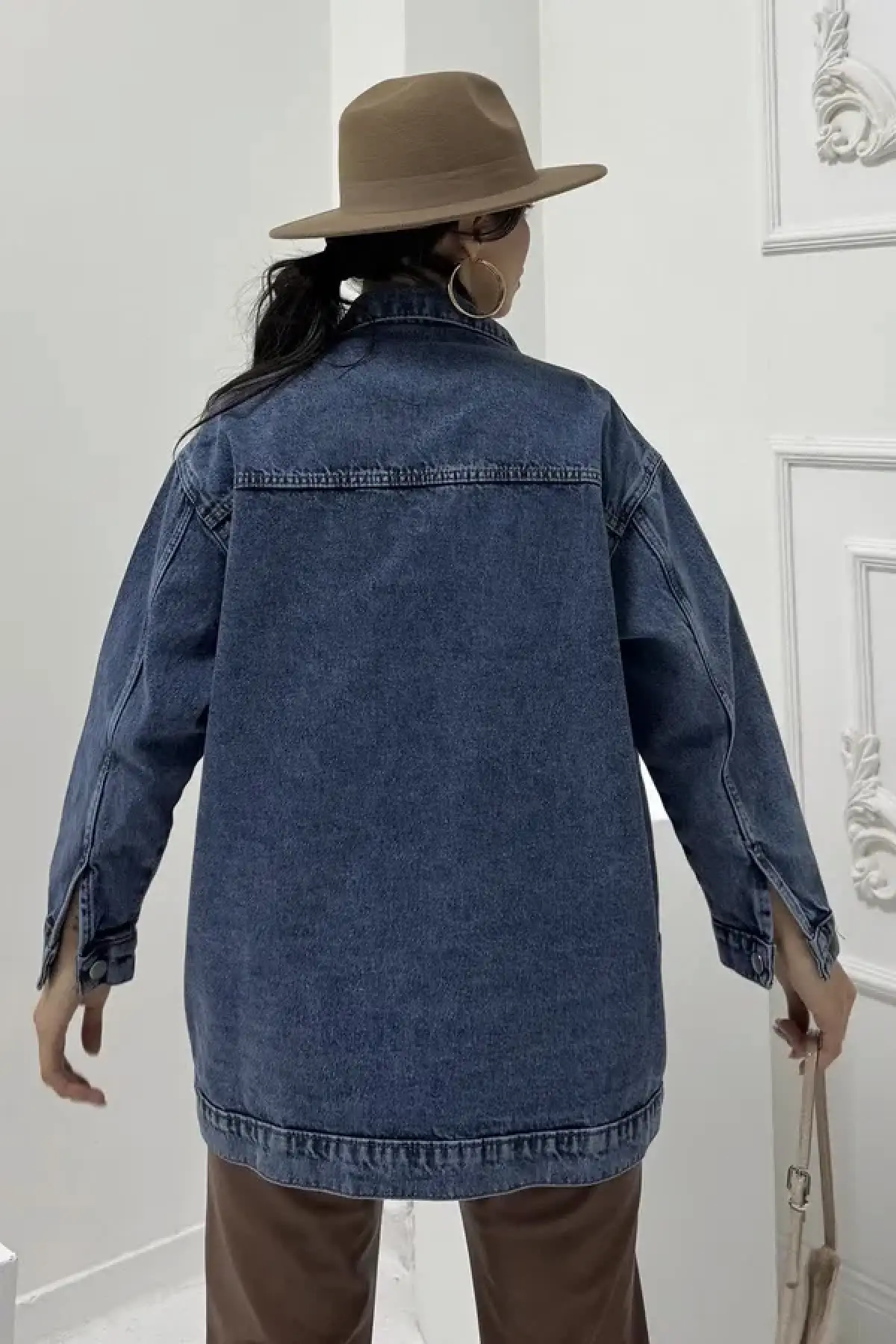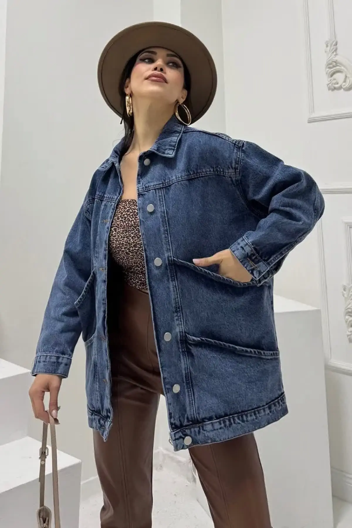 Düz Orta Kadın Mavi Cepli Kot Ceket