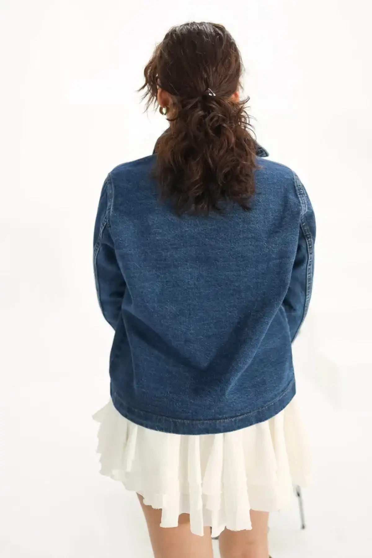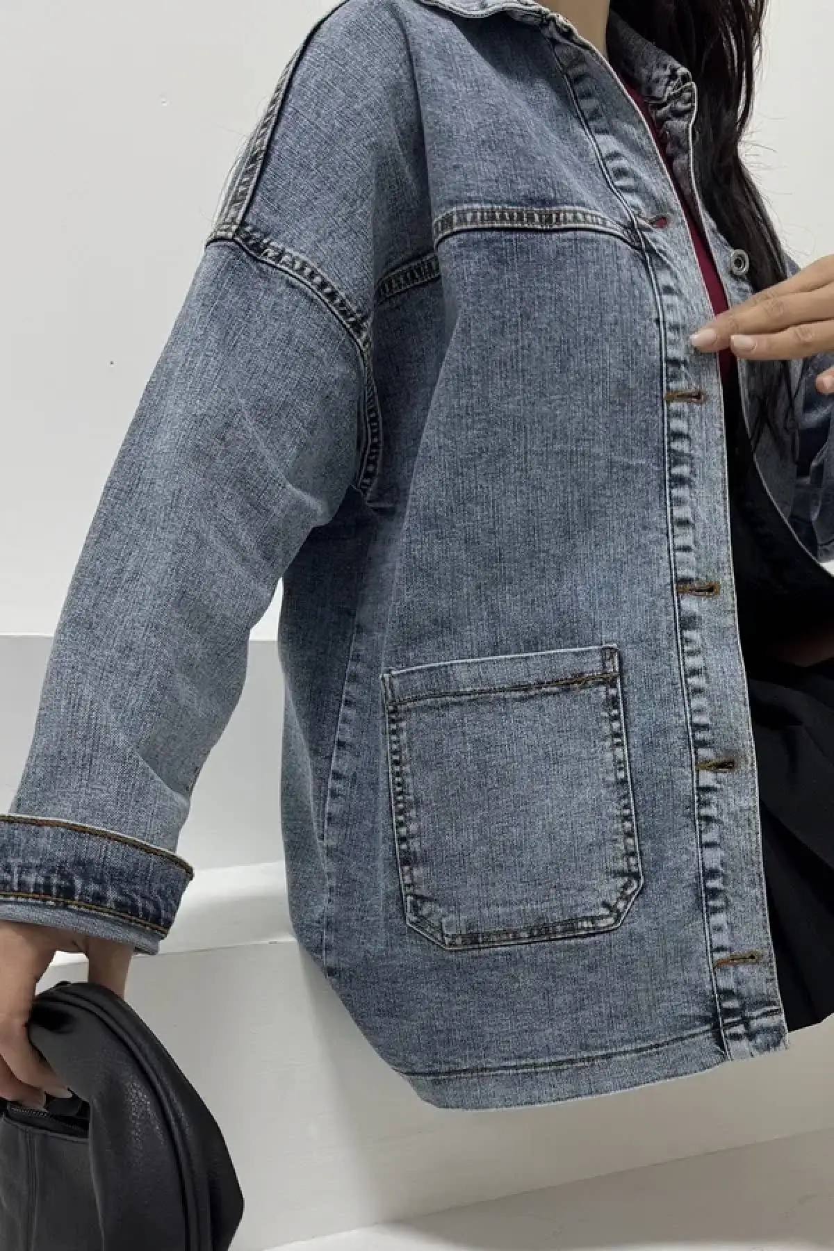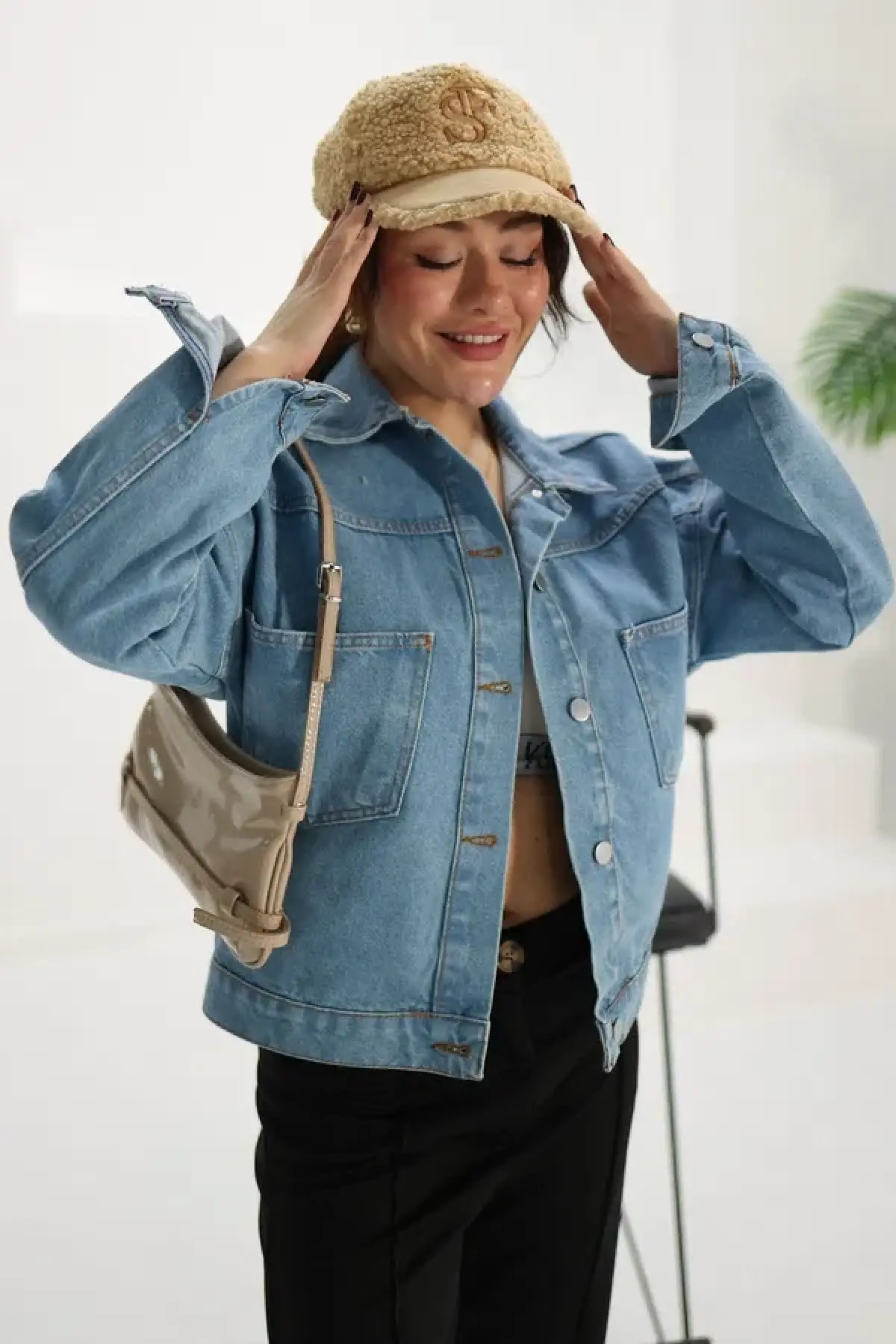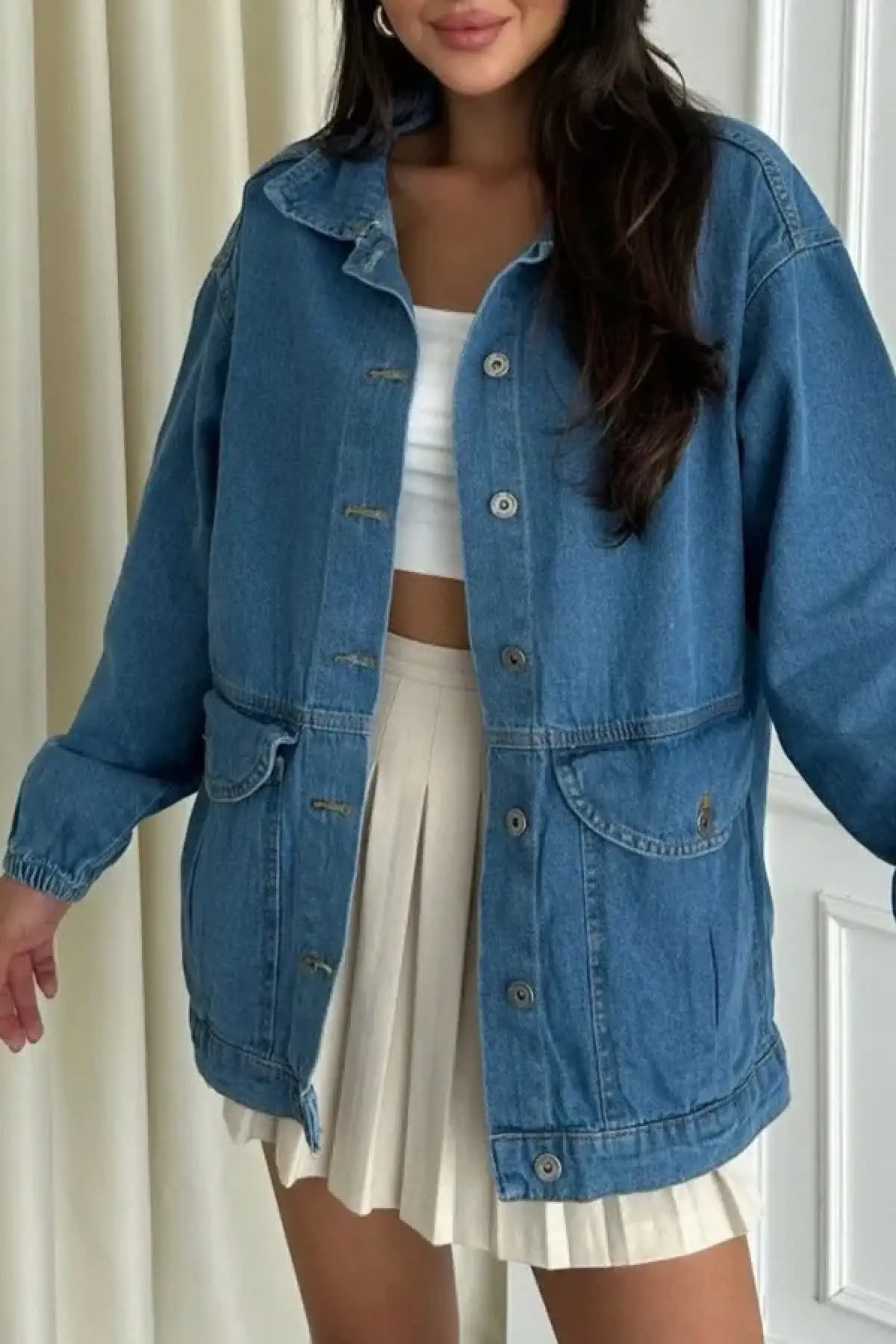 Düz Orta Kadın Mavi Cepli Kot Ceket