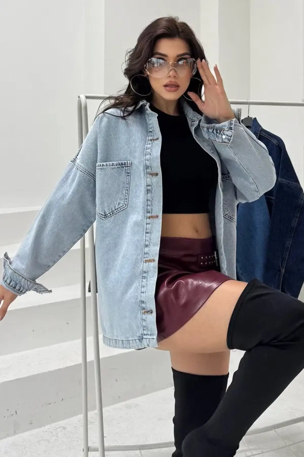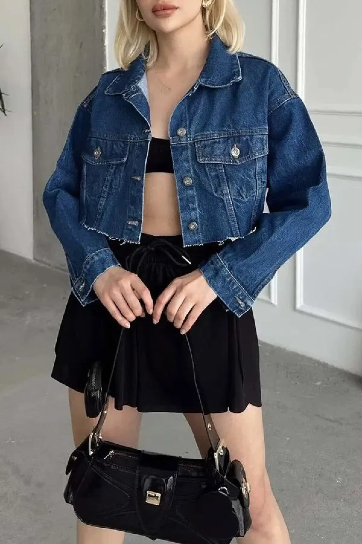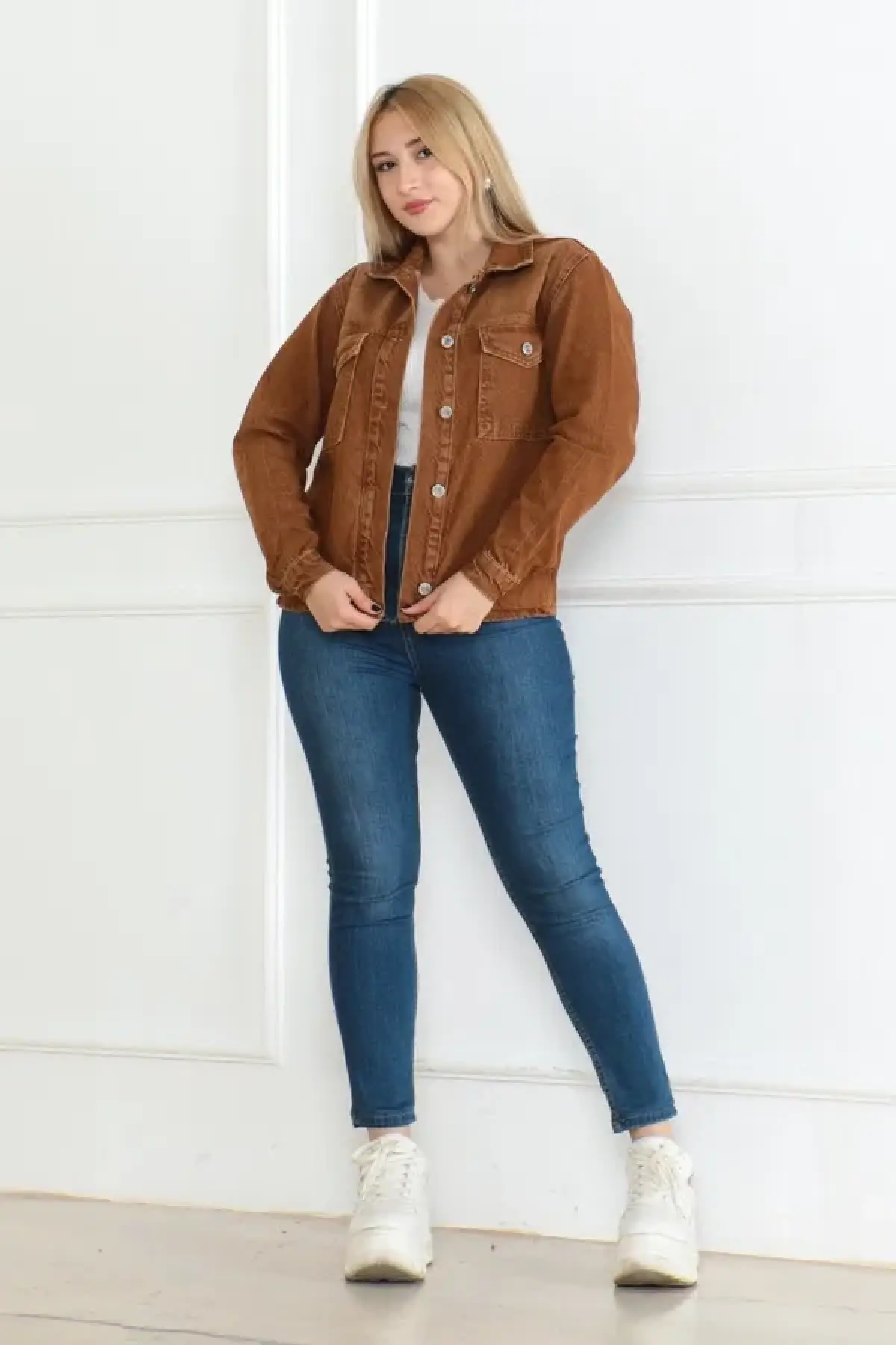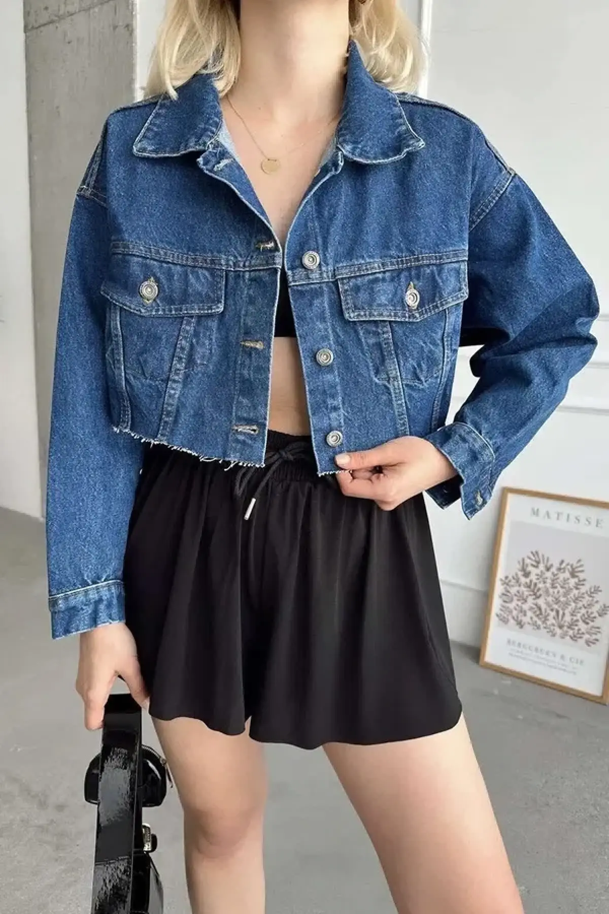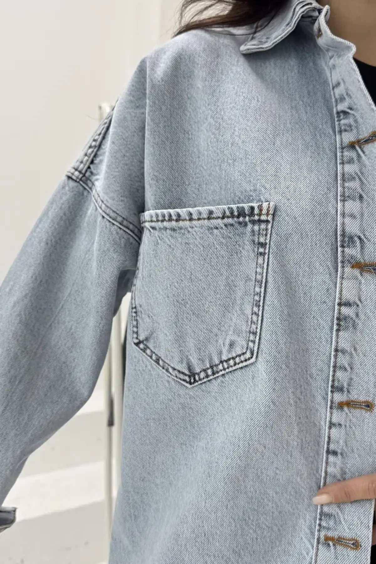 Düz Orta Kadın Mavi Cepli Kot Ceket