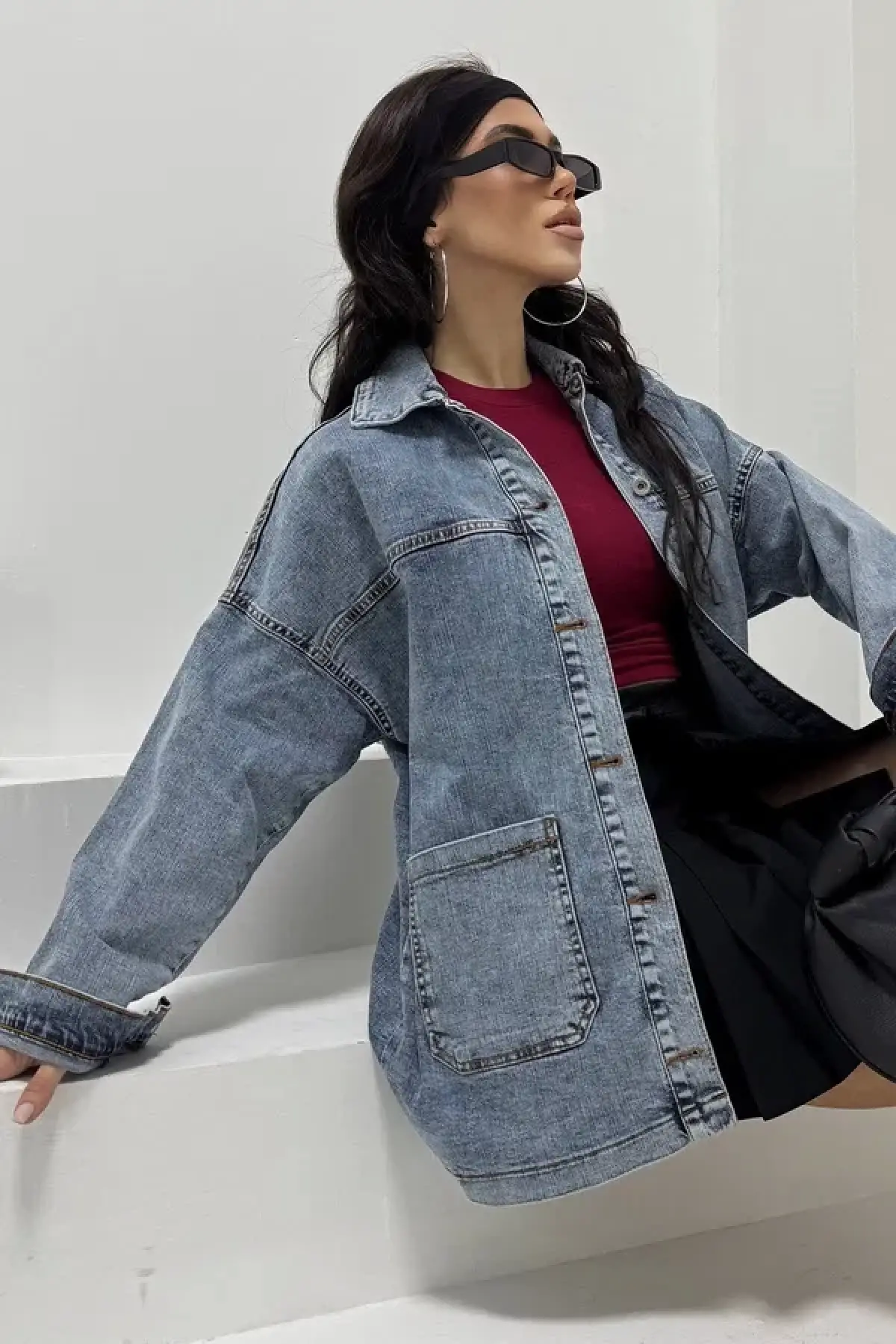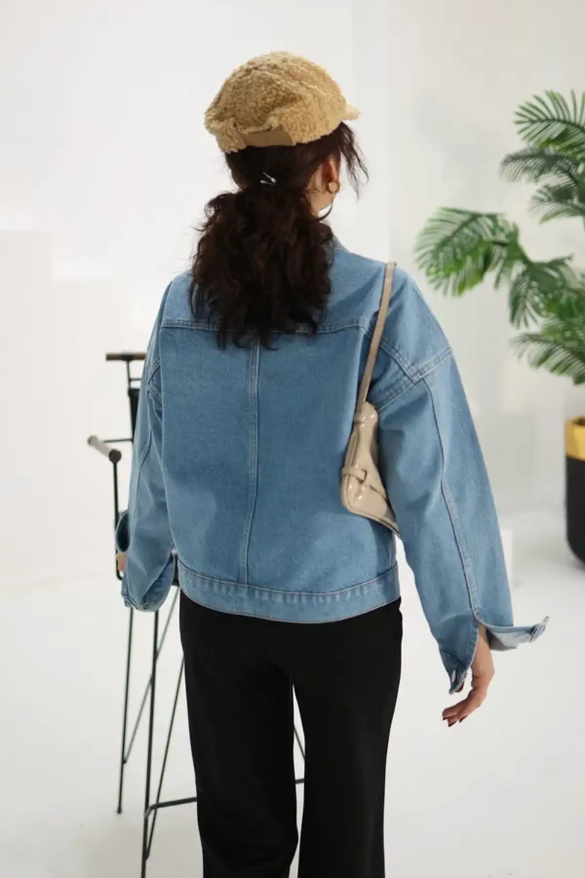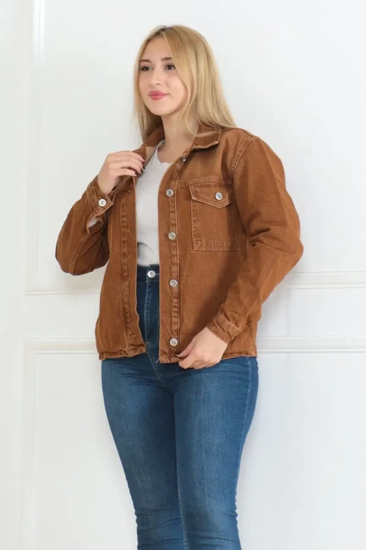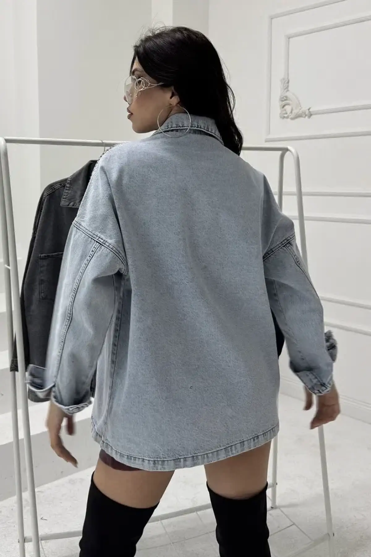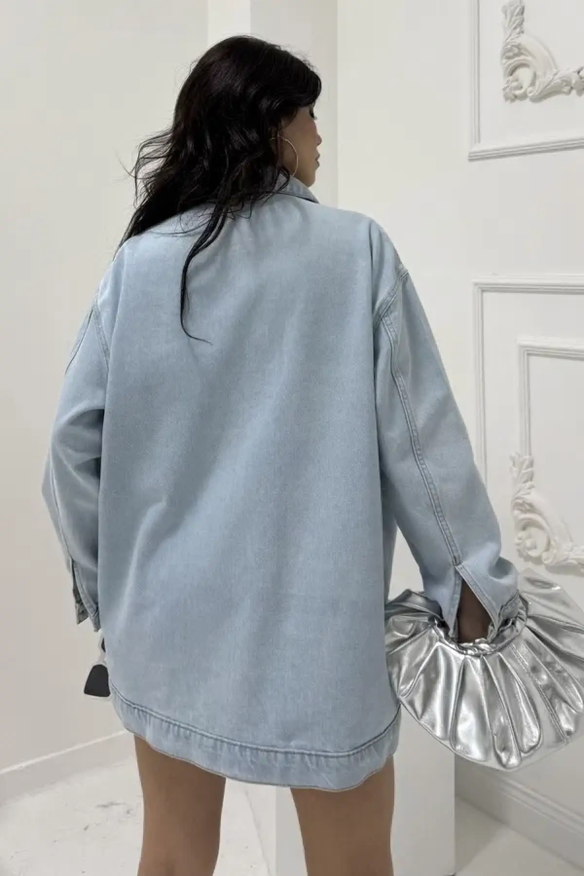 Düz Orta Kadın Mavi Cepli Kot Ceket