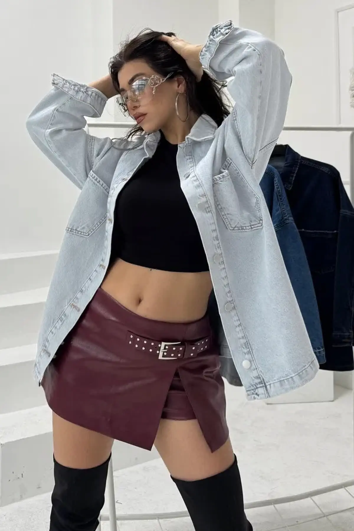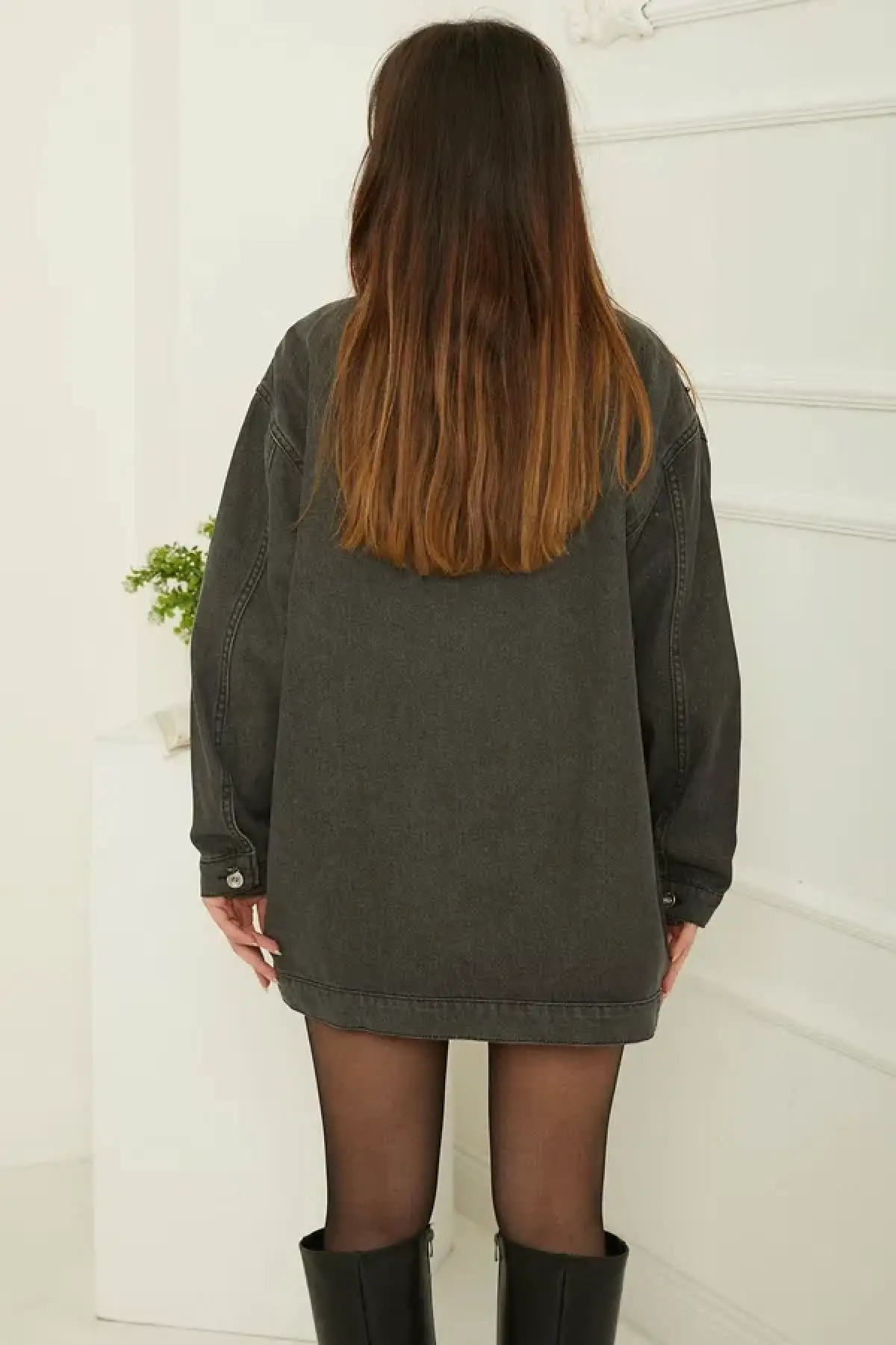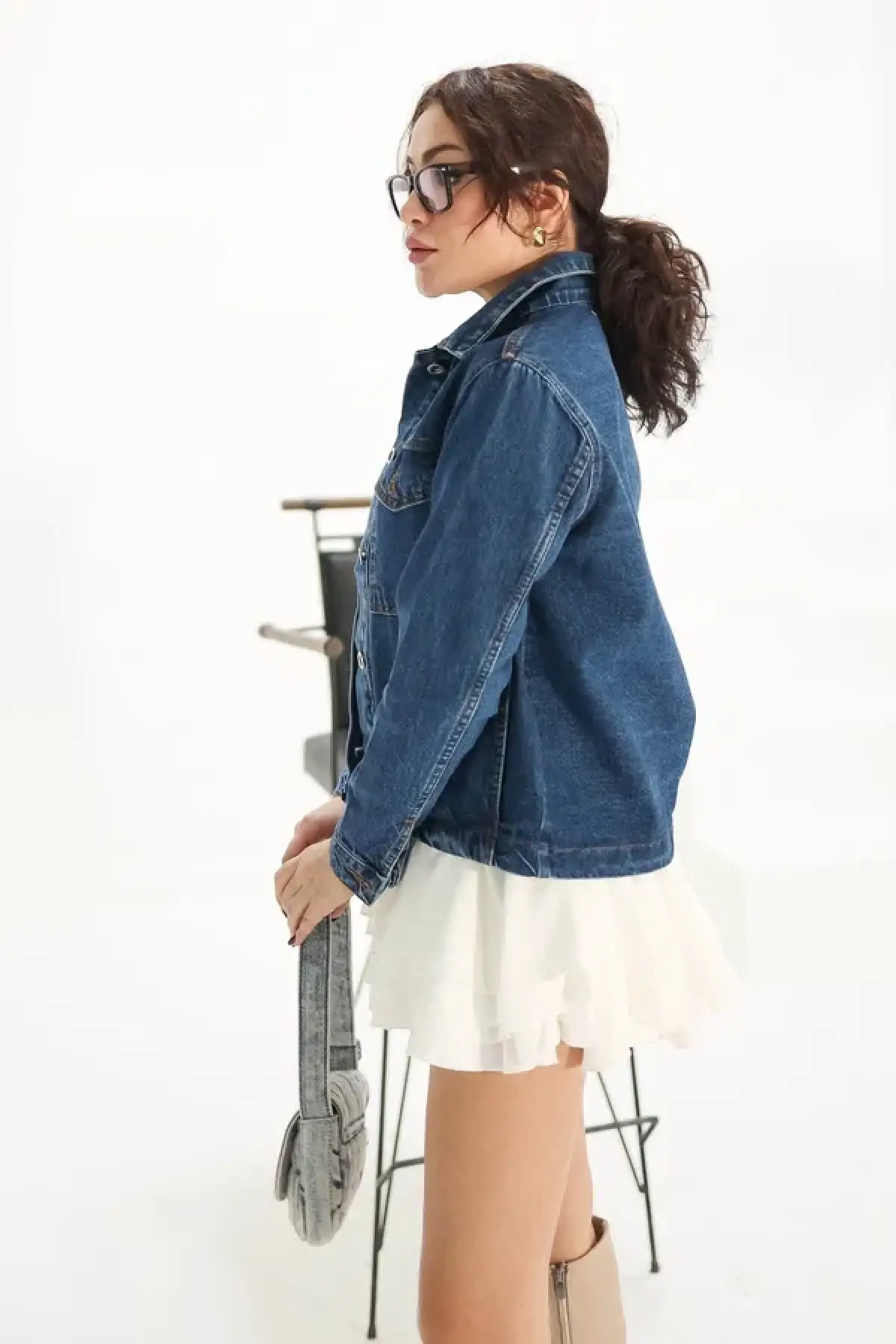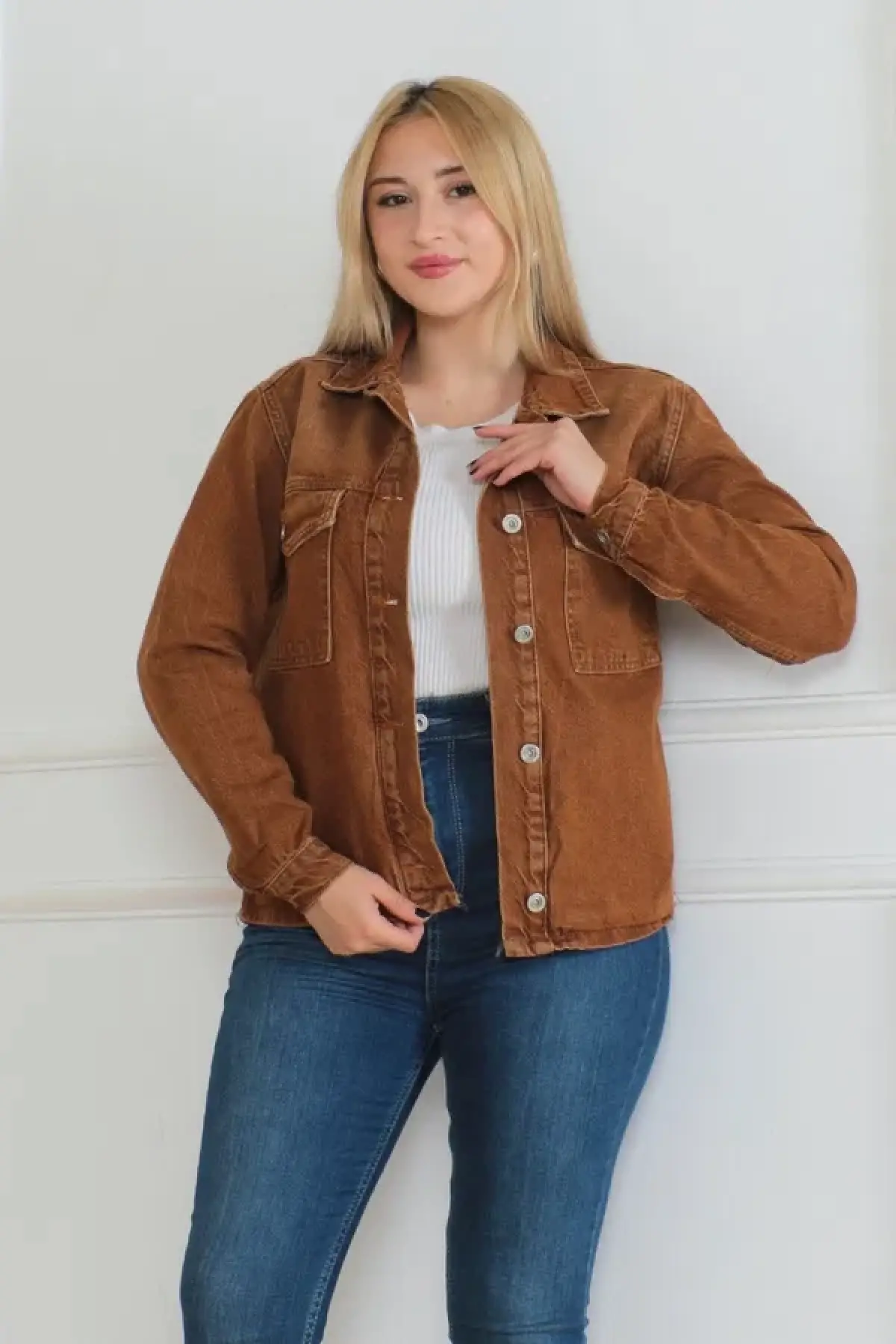 Düz Orta Kadın Mavi Cepli Kot Ceket