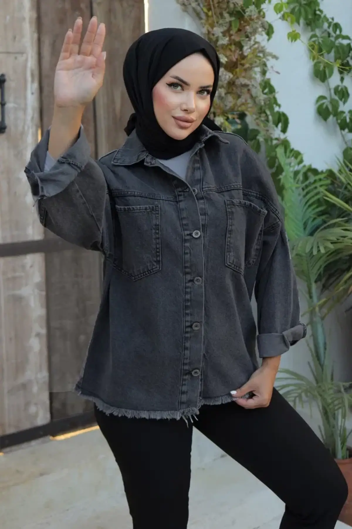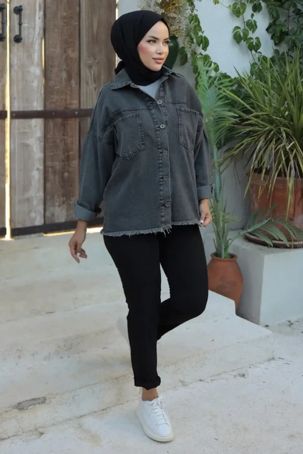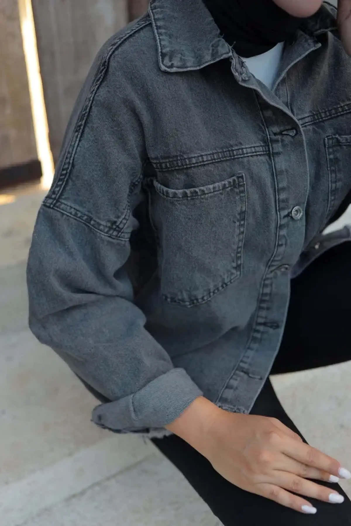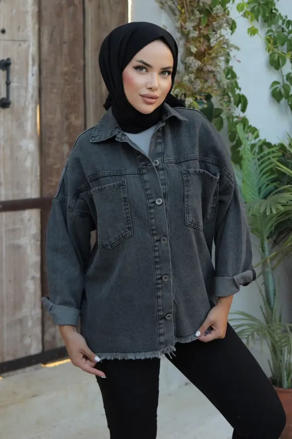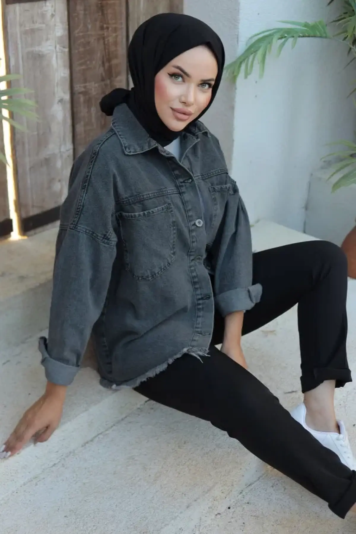 Düz Orta Kadın Mavi Cepli Kot Ceket