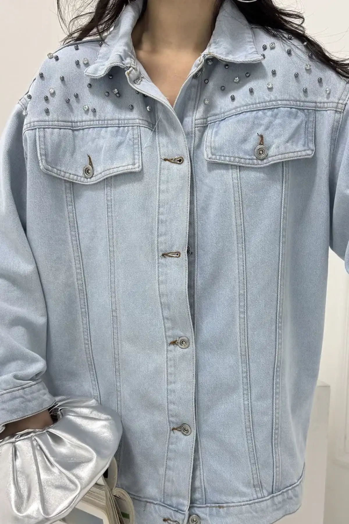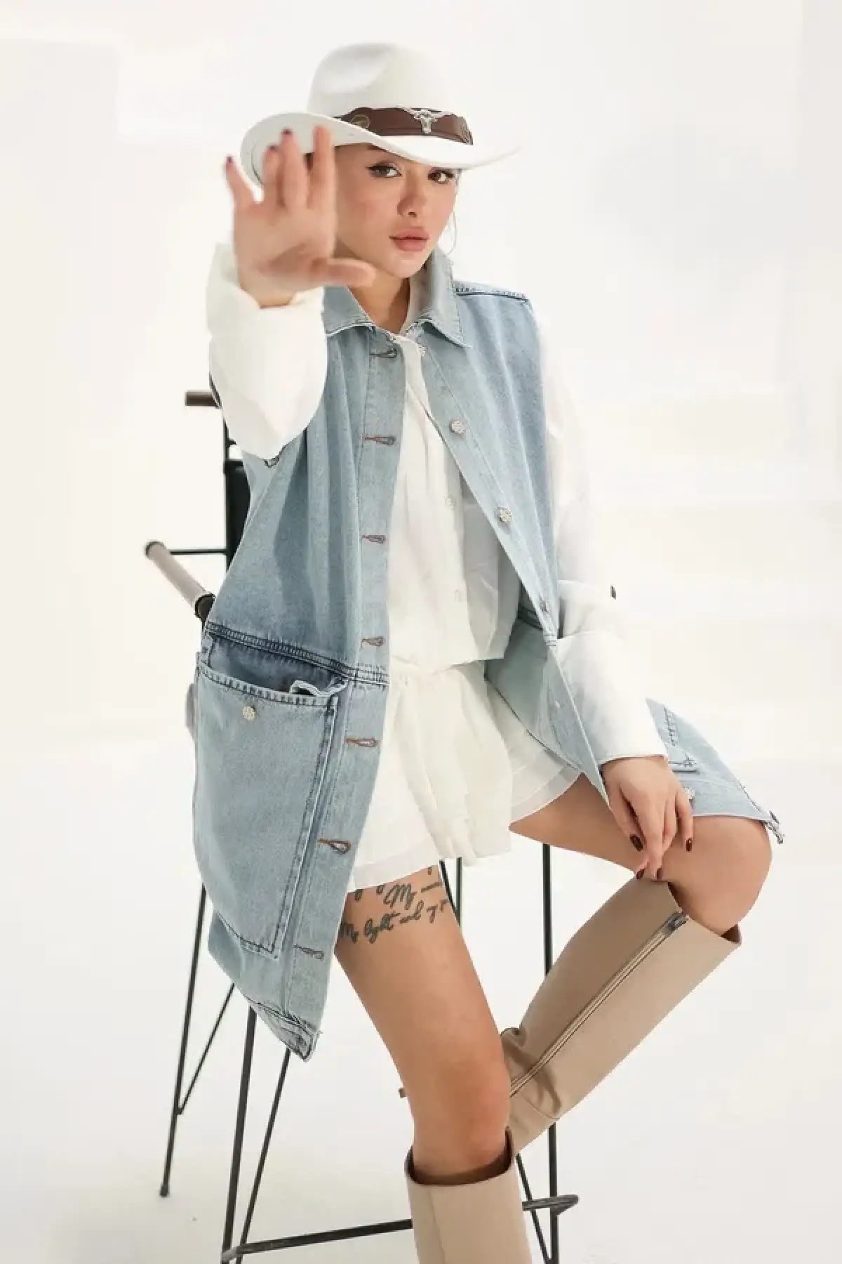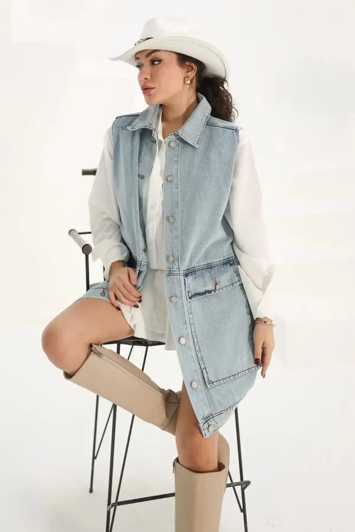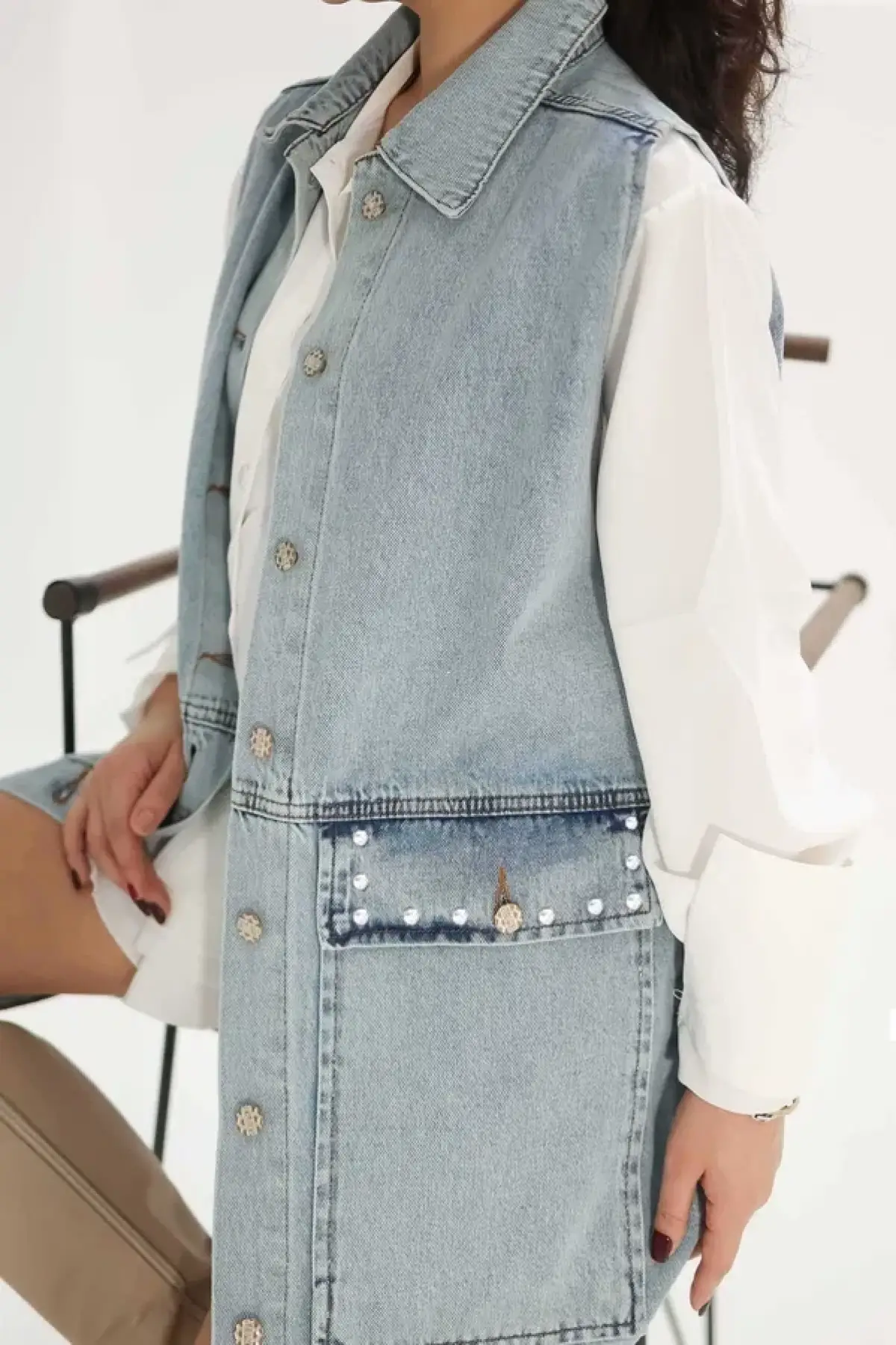 Kadın Mavi Cebi Taşlı Kot Yelek