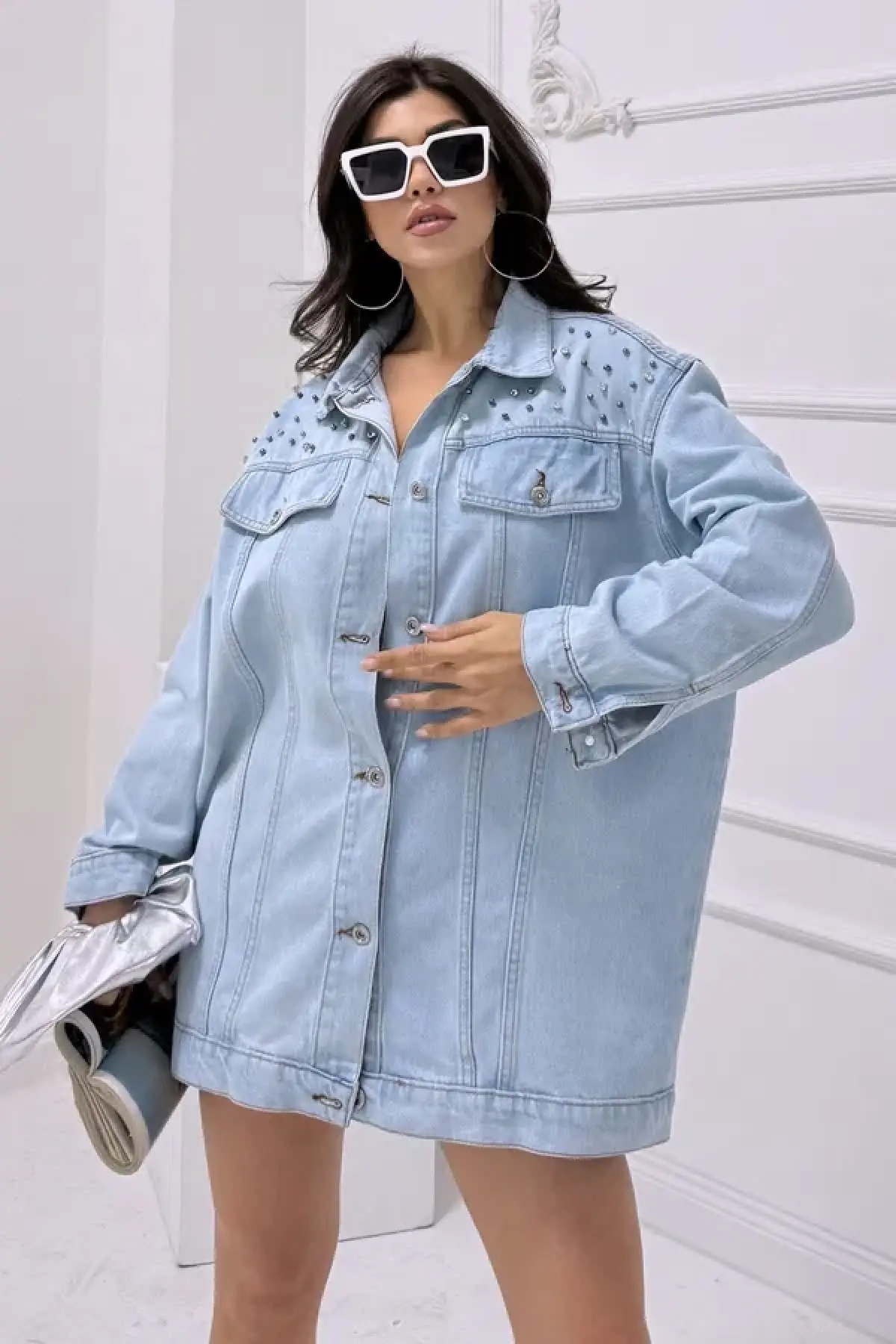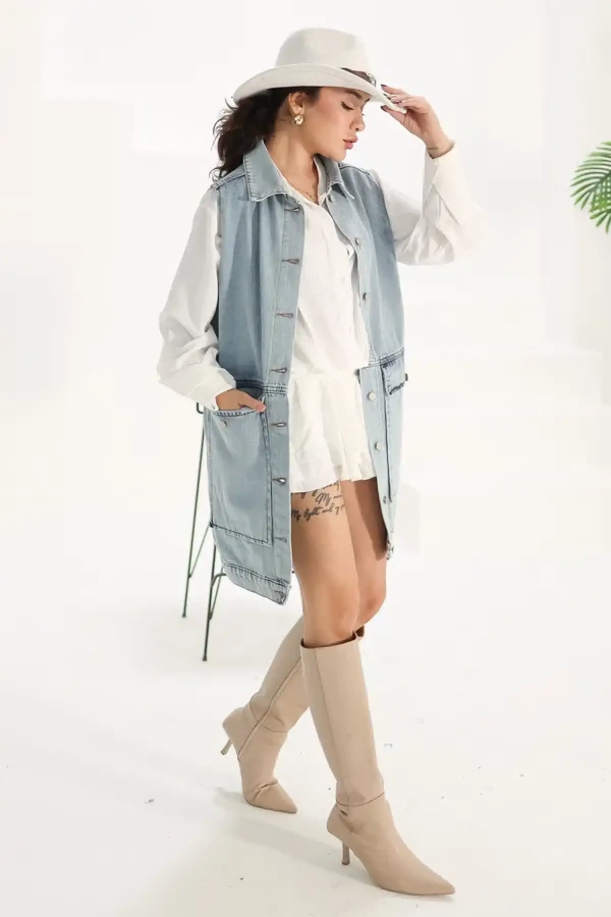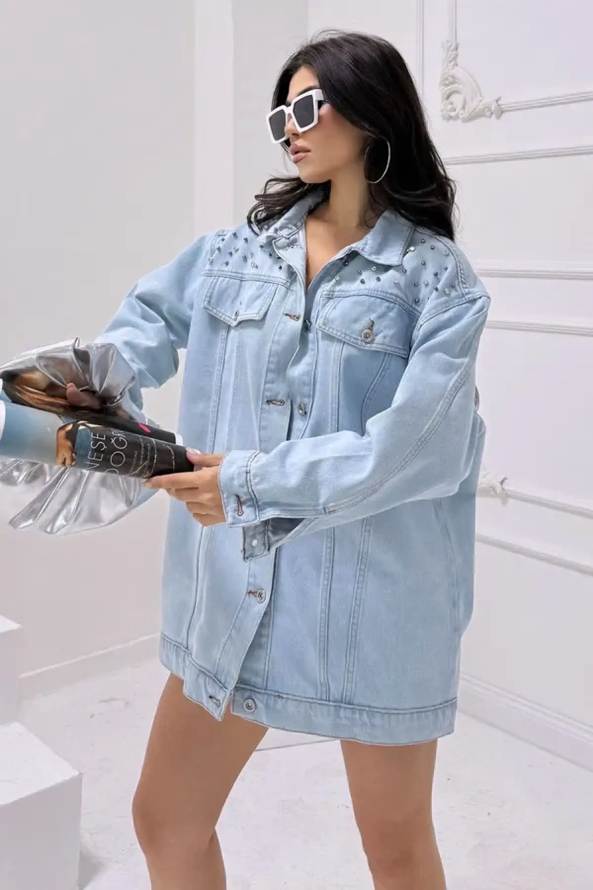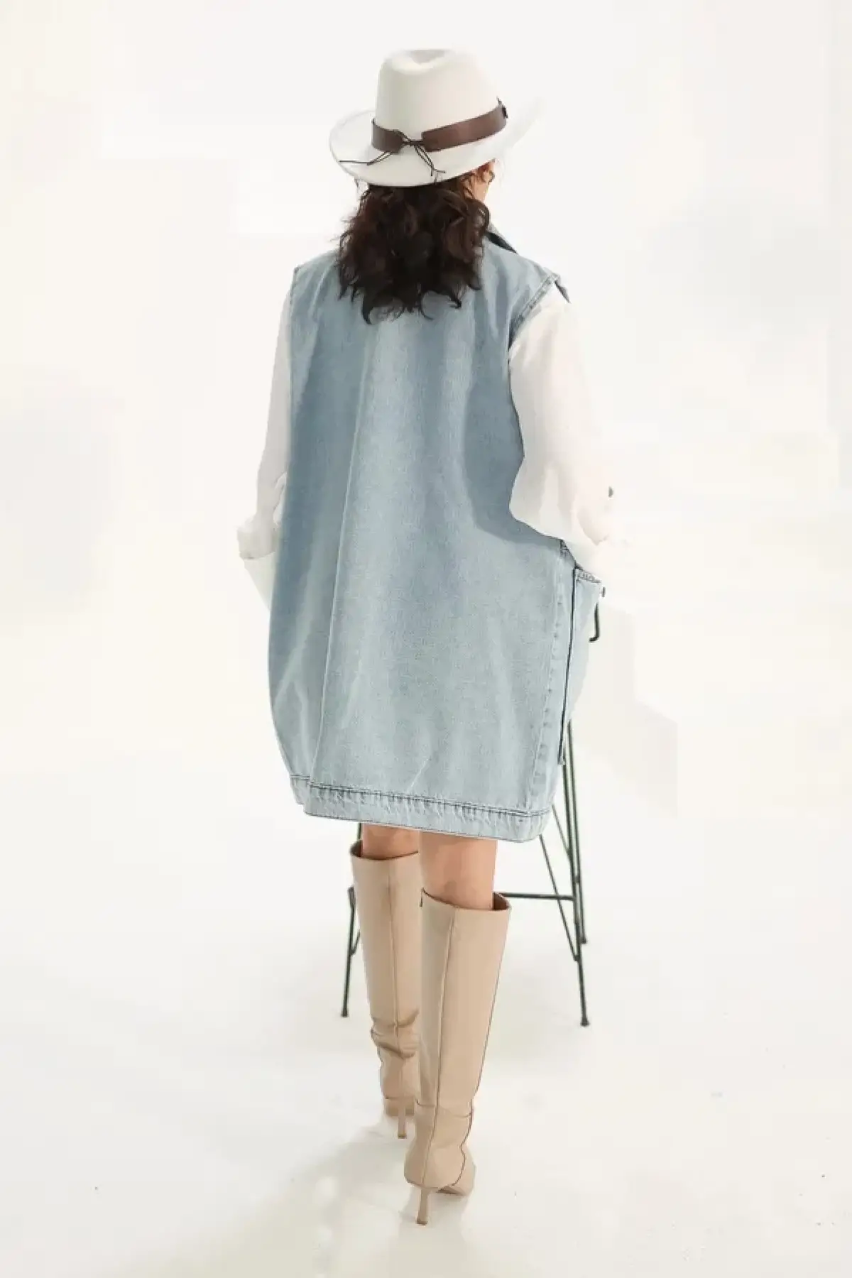 Kadın Mavi Cebi Taşlı Kot Yelek