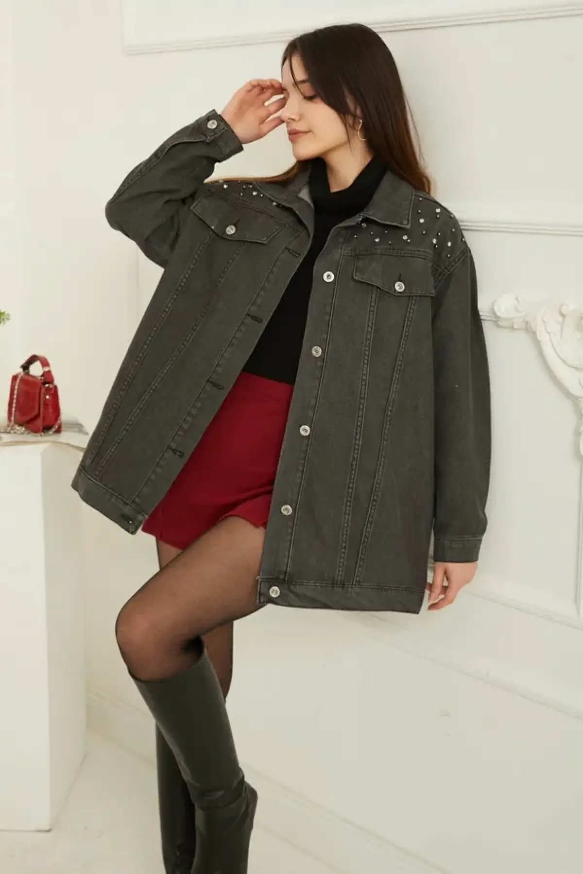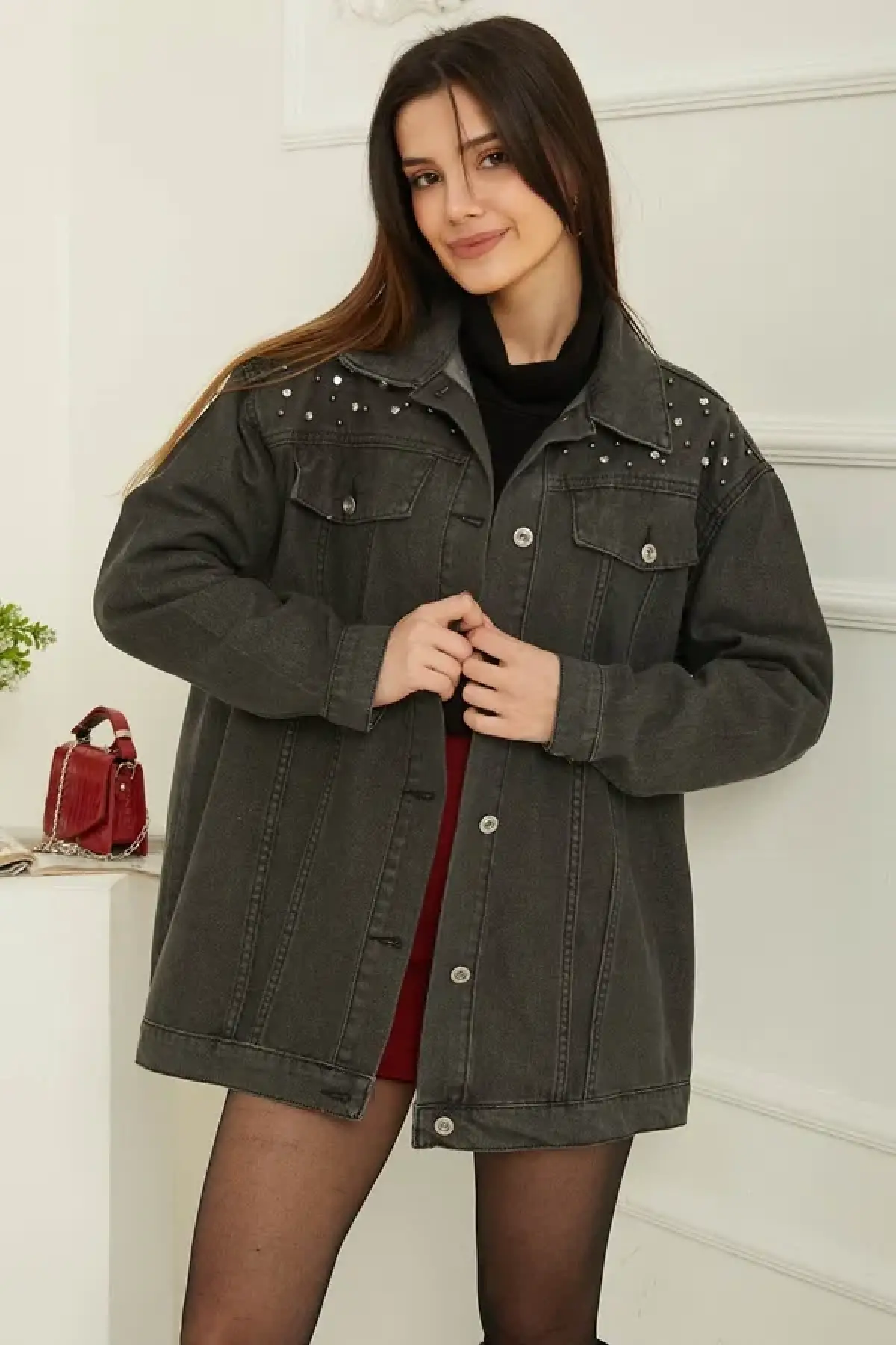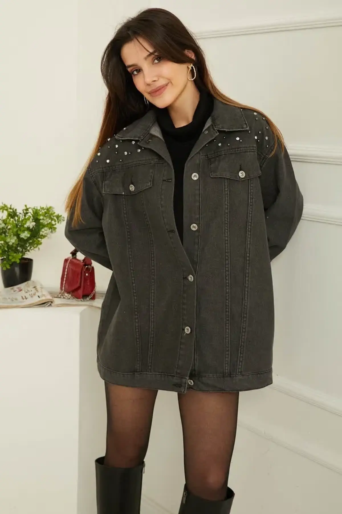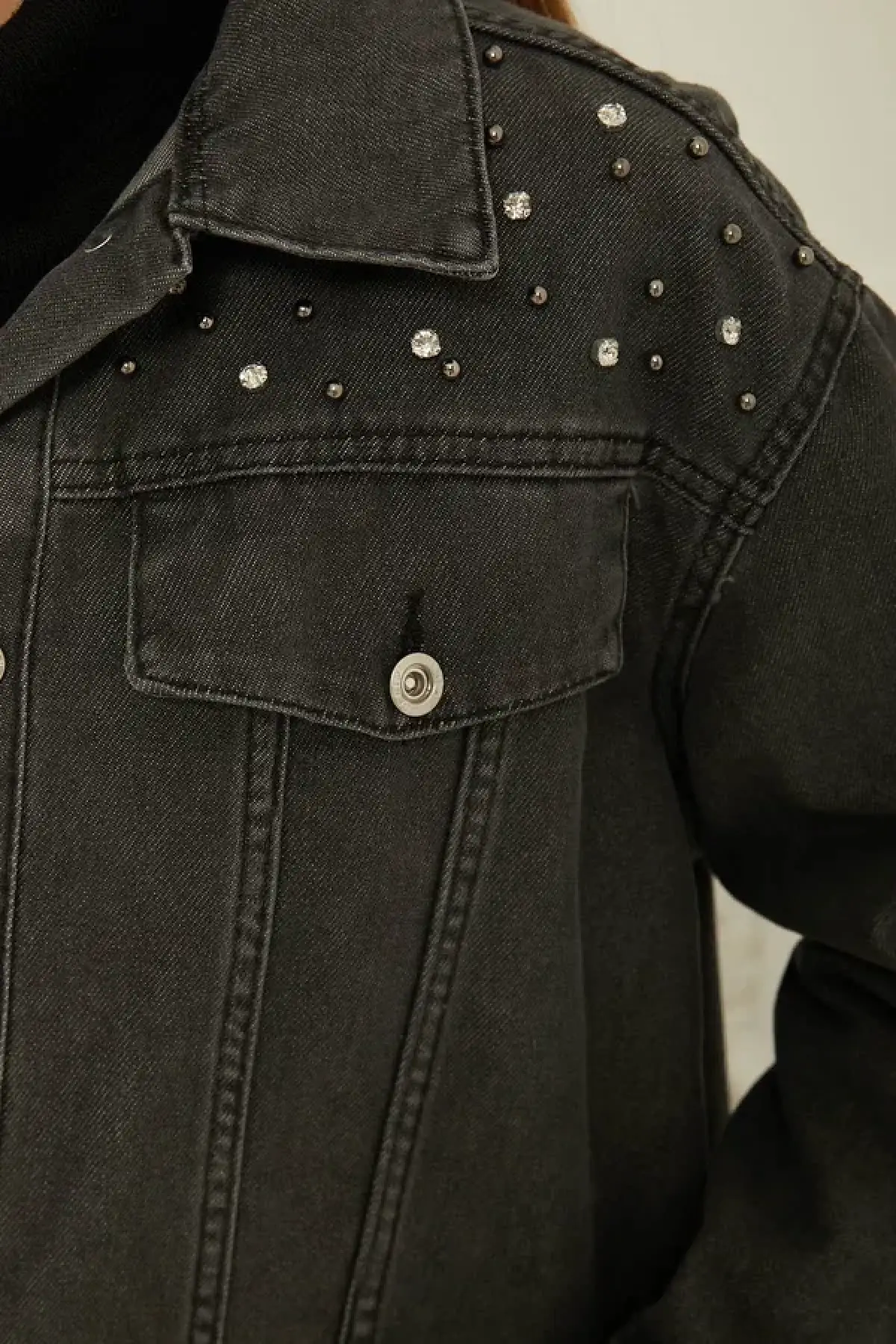 Kadın Mavi Cebi Taşlı Kot Yelek