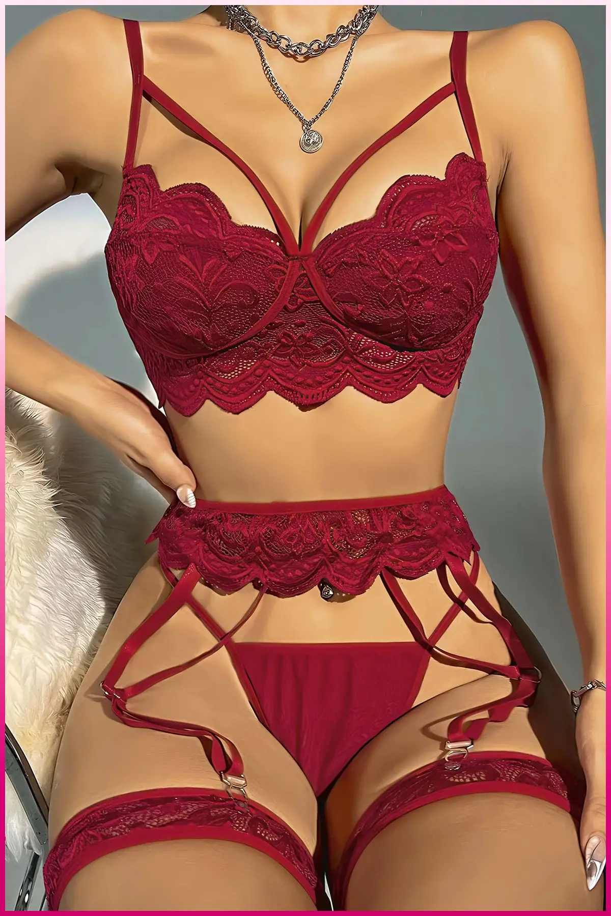 Kırmızı Dantel Sırt Kalp Aksesuar Seksi Sütyen Külot Takım