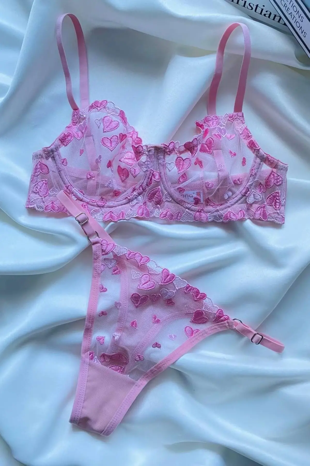 Kadın Kalpli Pembe Dantelli Balenli Sütyen Külot Takım