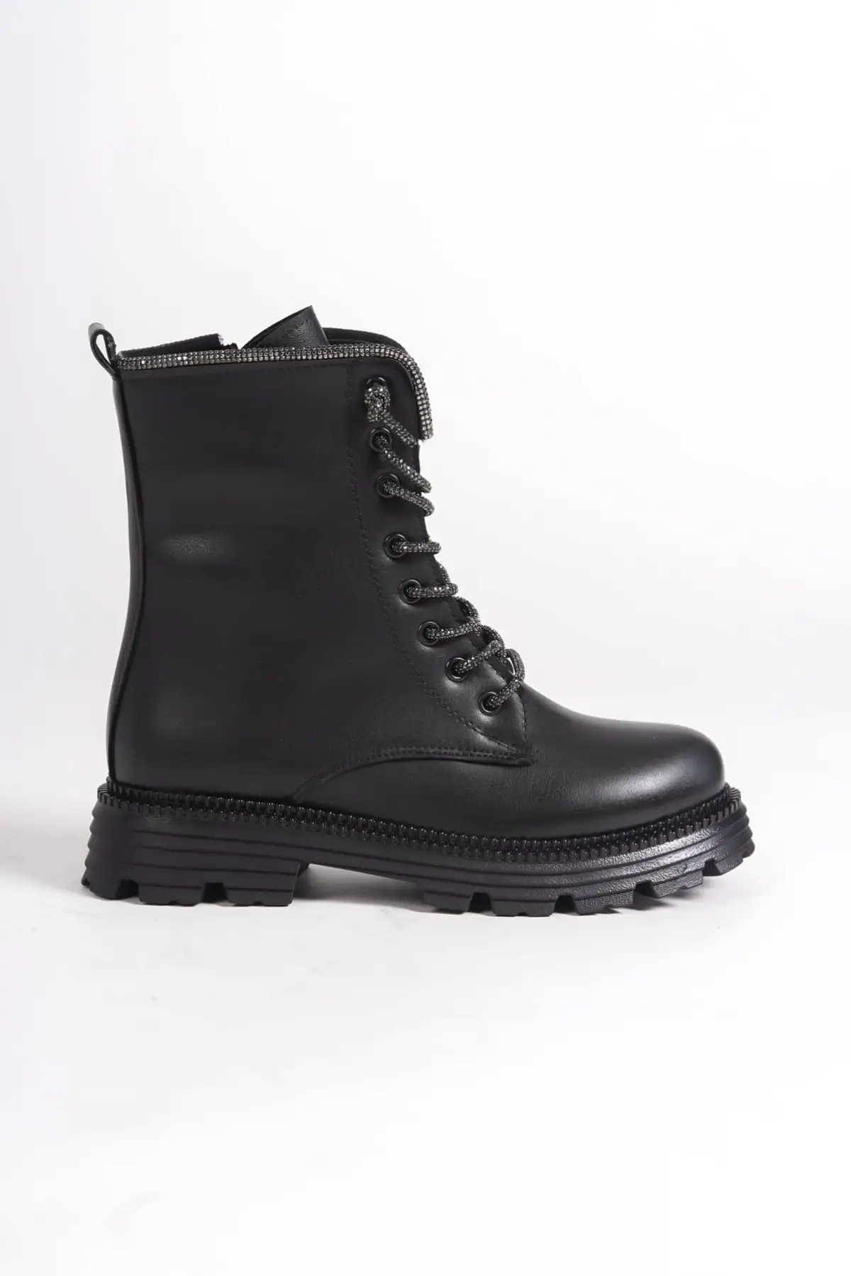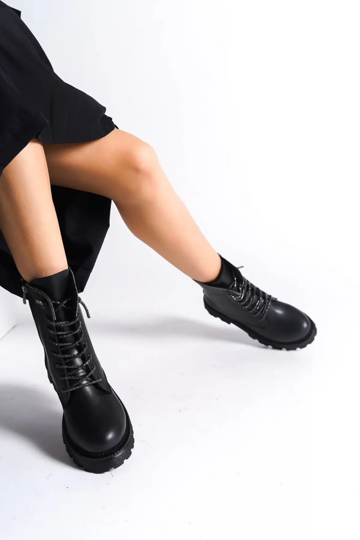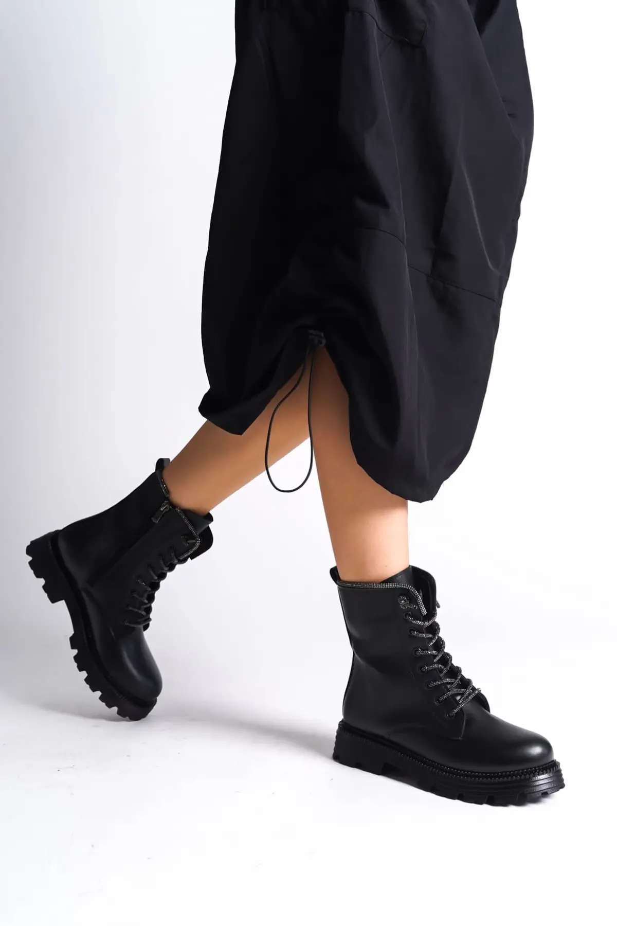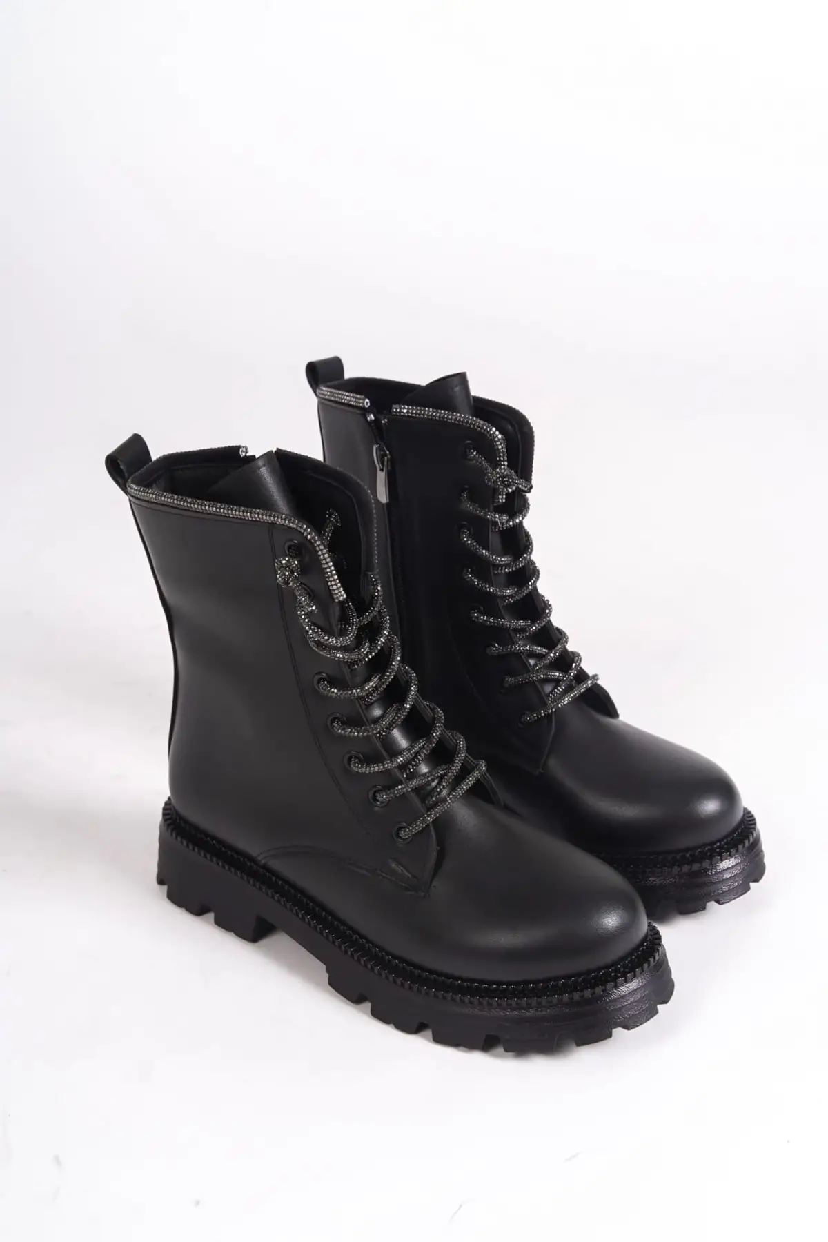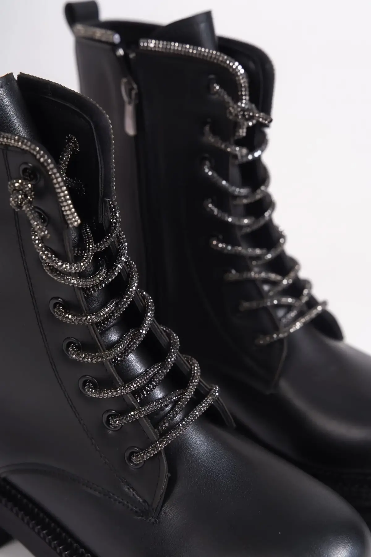 Pamela Bağcıklı Fermuarlı Ortopedik Taban Taşlı Kadın Bot St - Siyah
