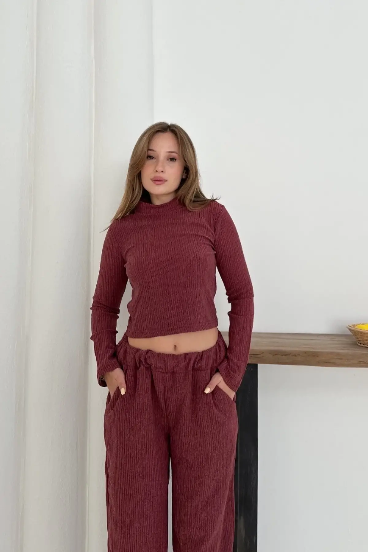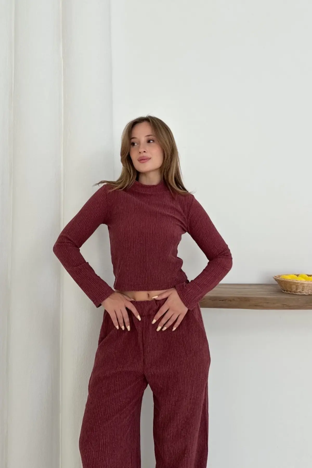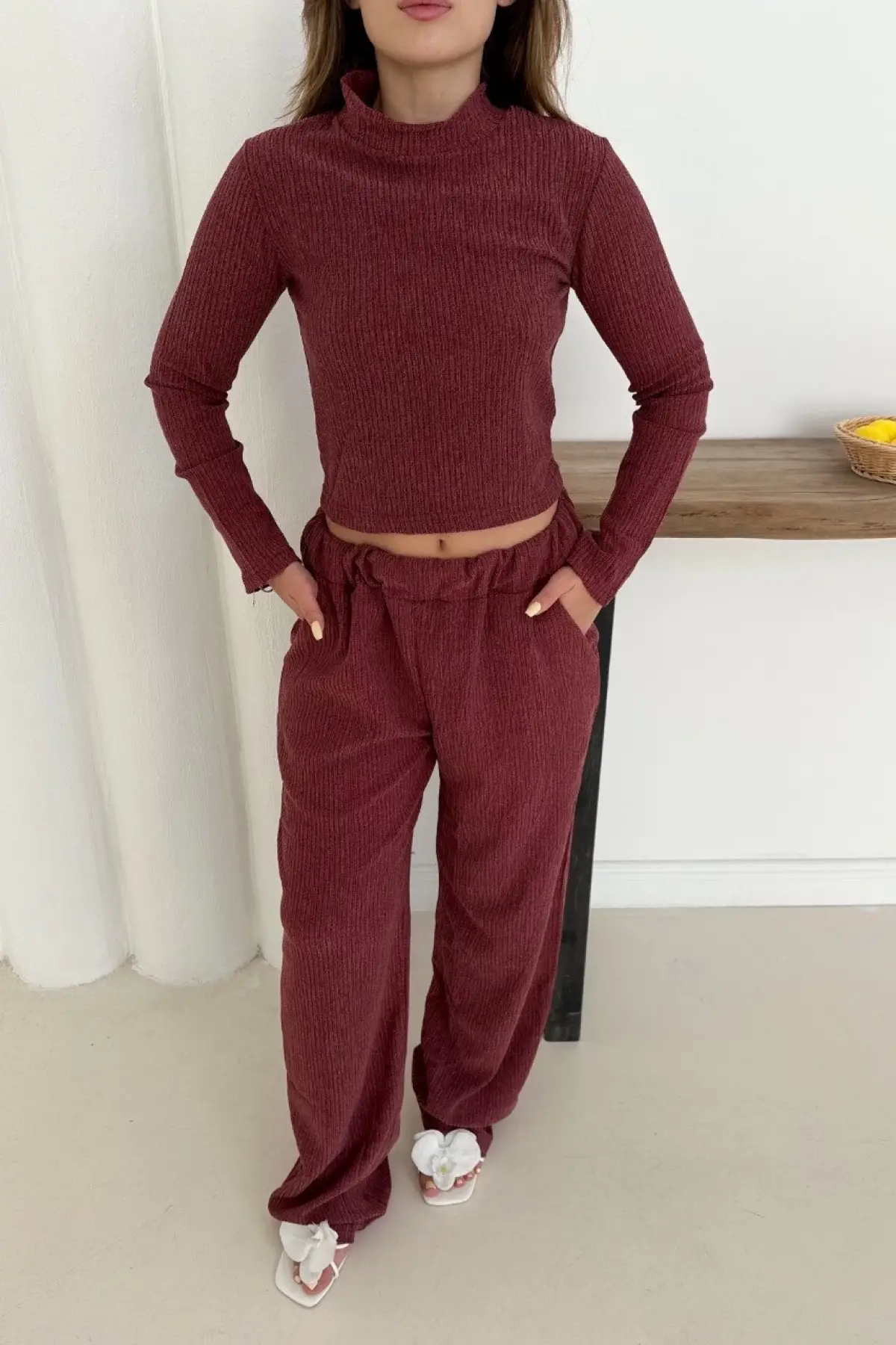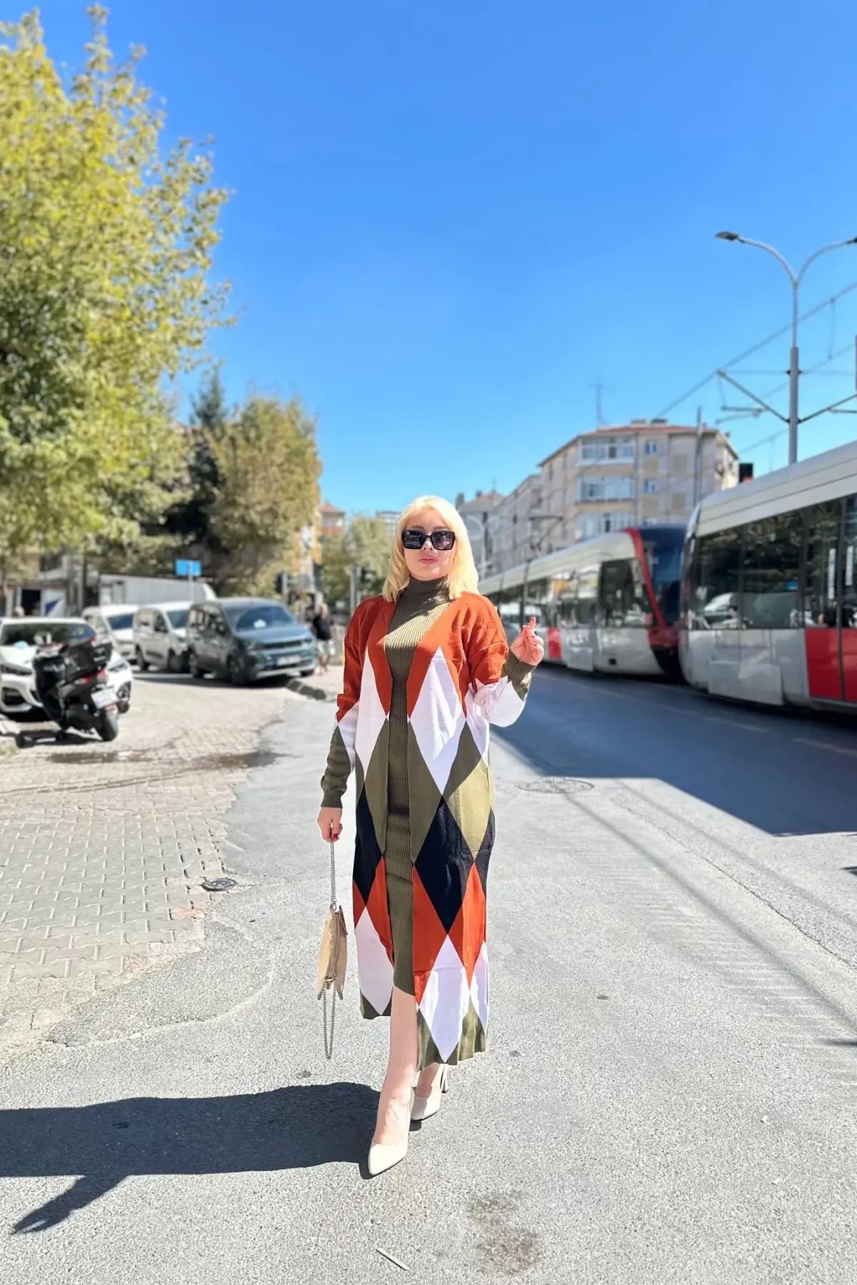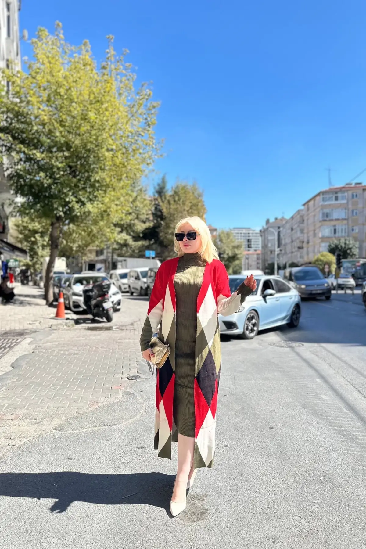 Triko Hırka Elbise İkili Takım, feminen ve şık bir görünüm sunar. KırmızıSiyah renk kombinasyonuyla dikkat çeker.
