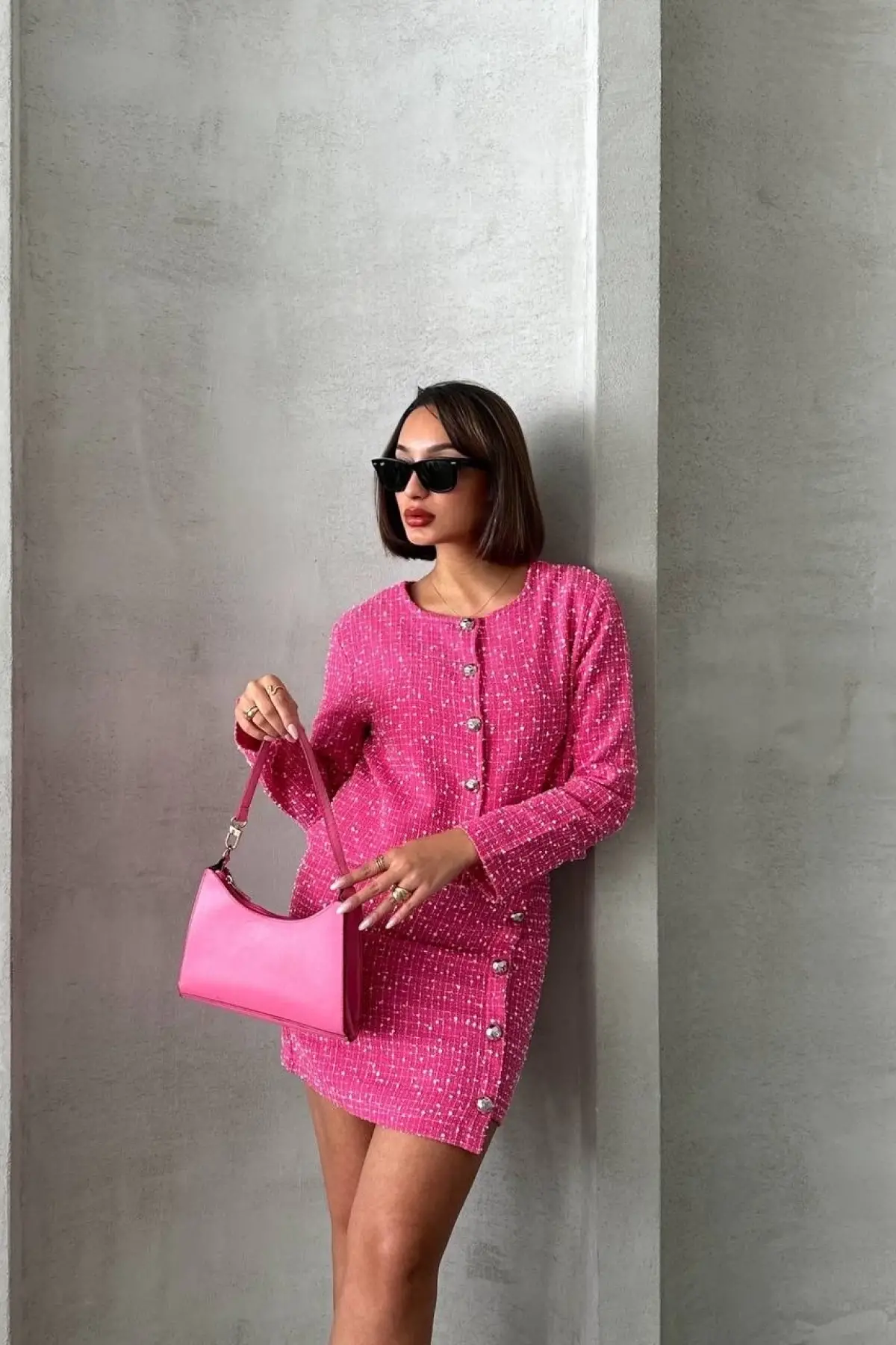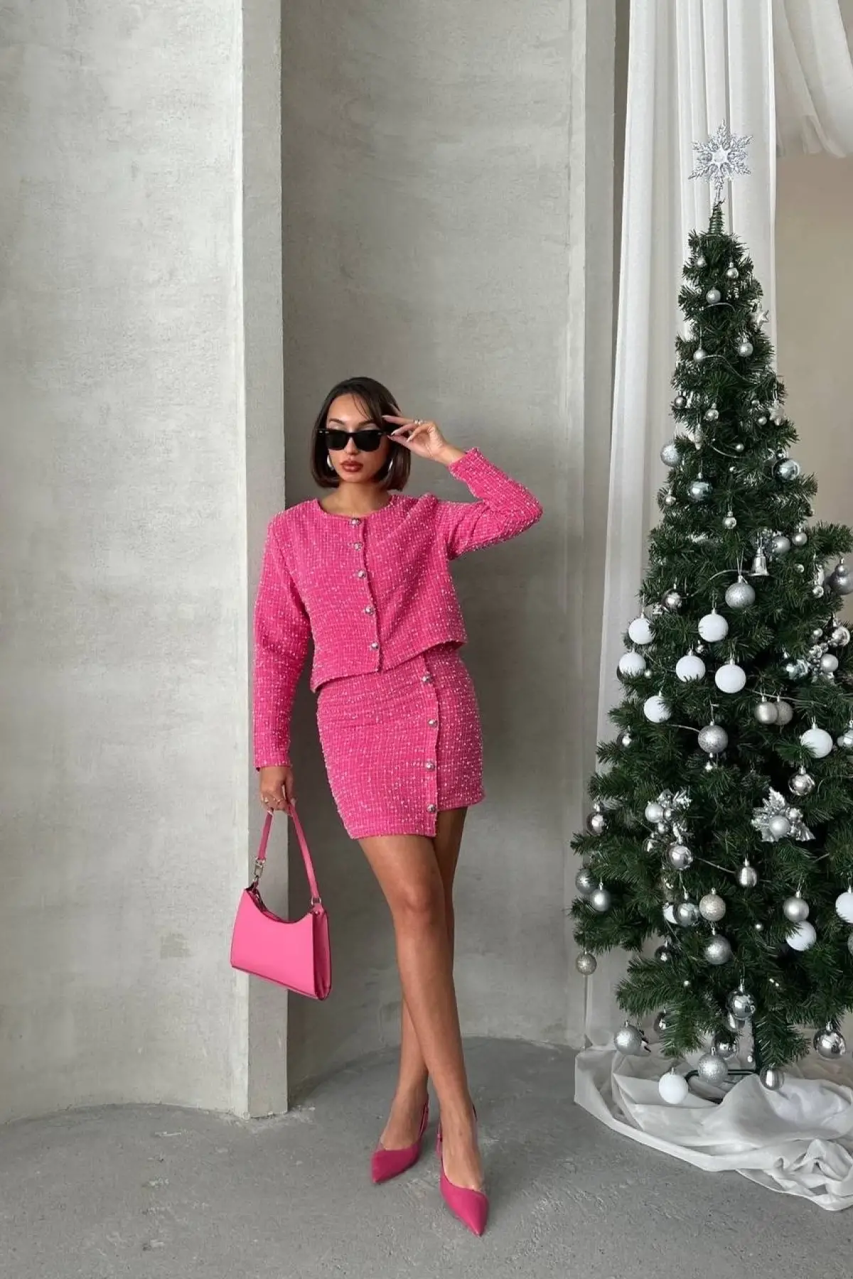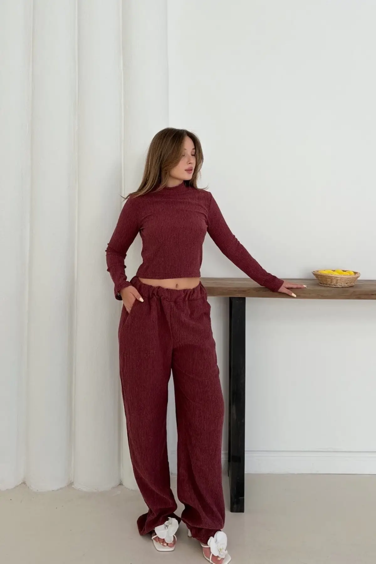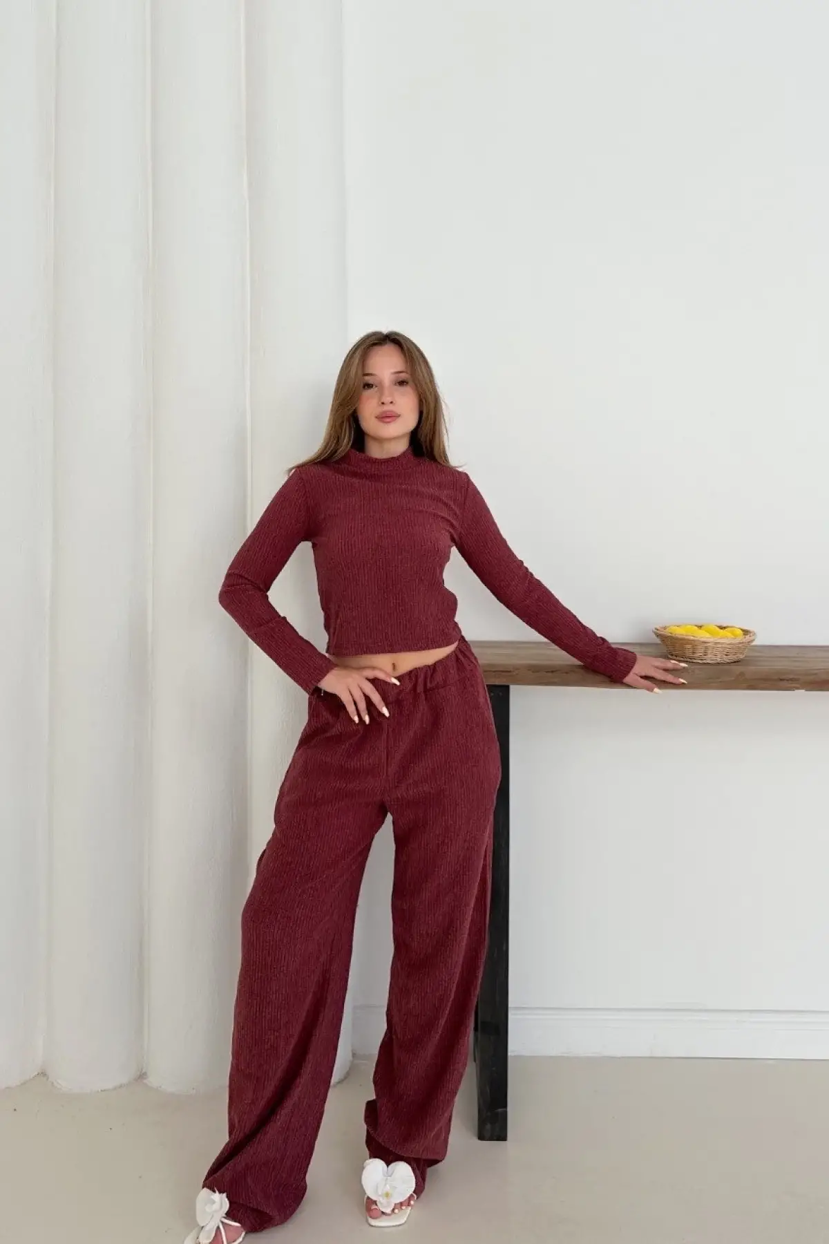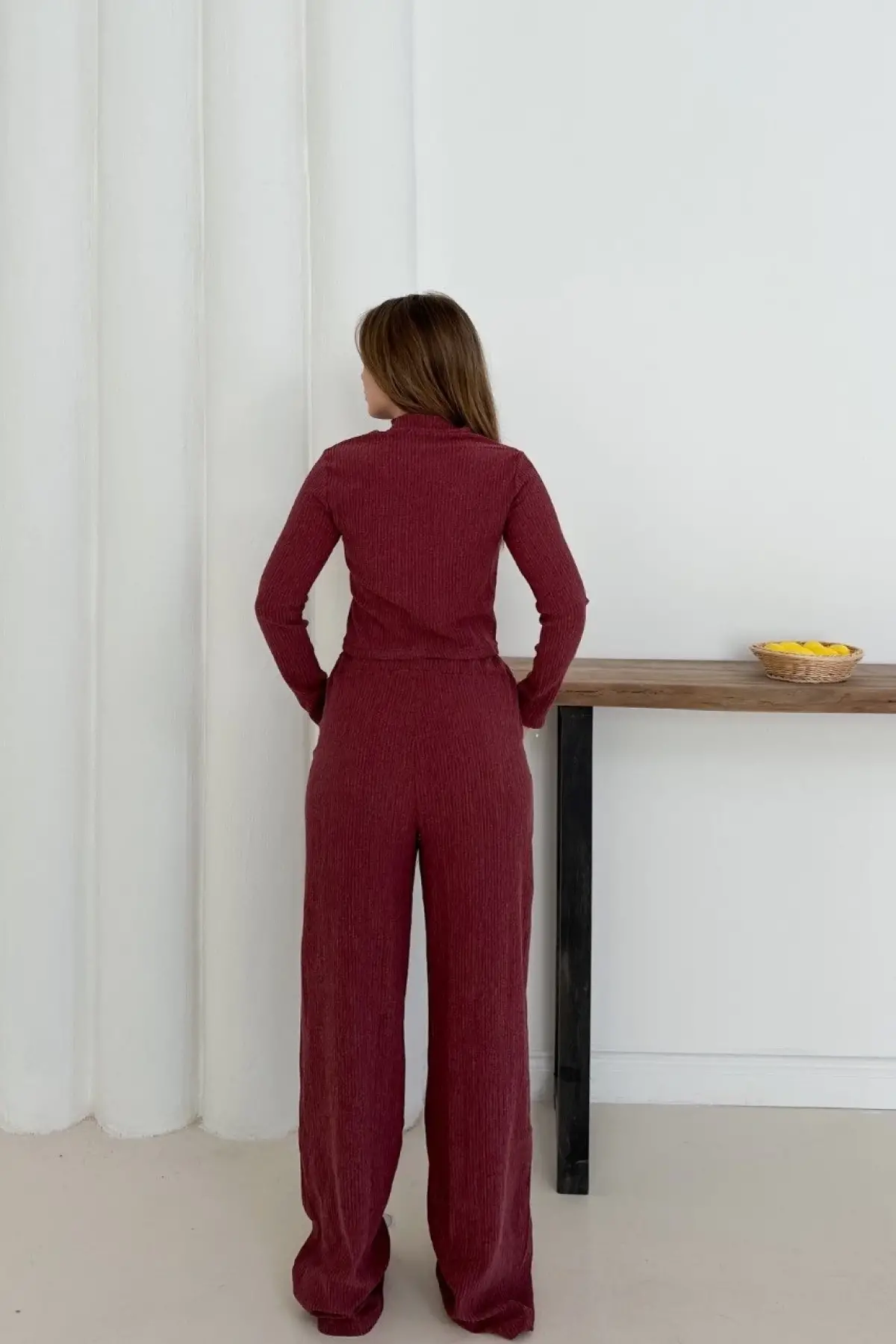 Triko Hırka Elbise İkili Takım, feminen ve şık bir görünüm sunar. KırmızıSiyah renk kombinasyonuyla dikkat çeker.