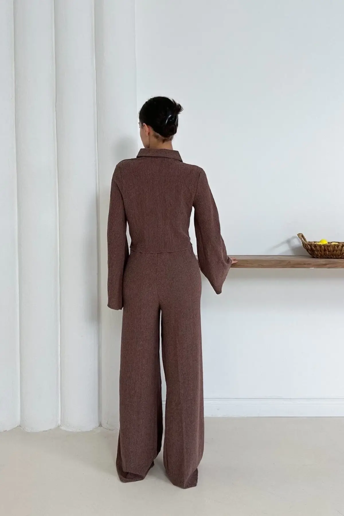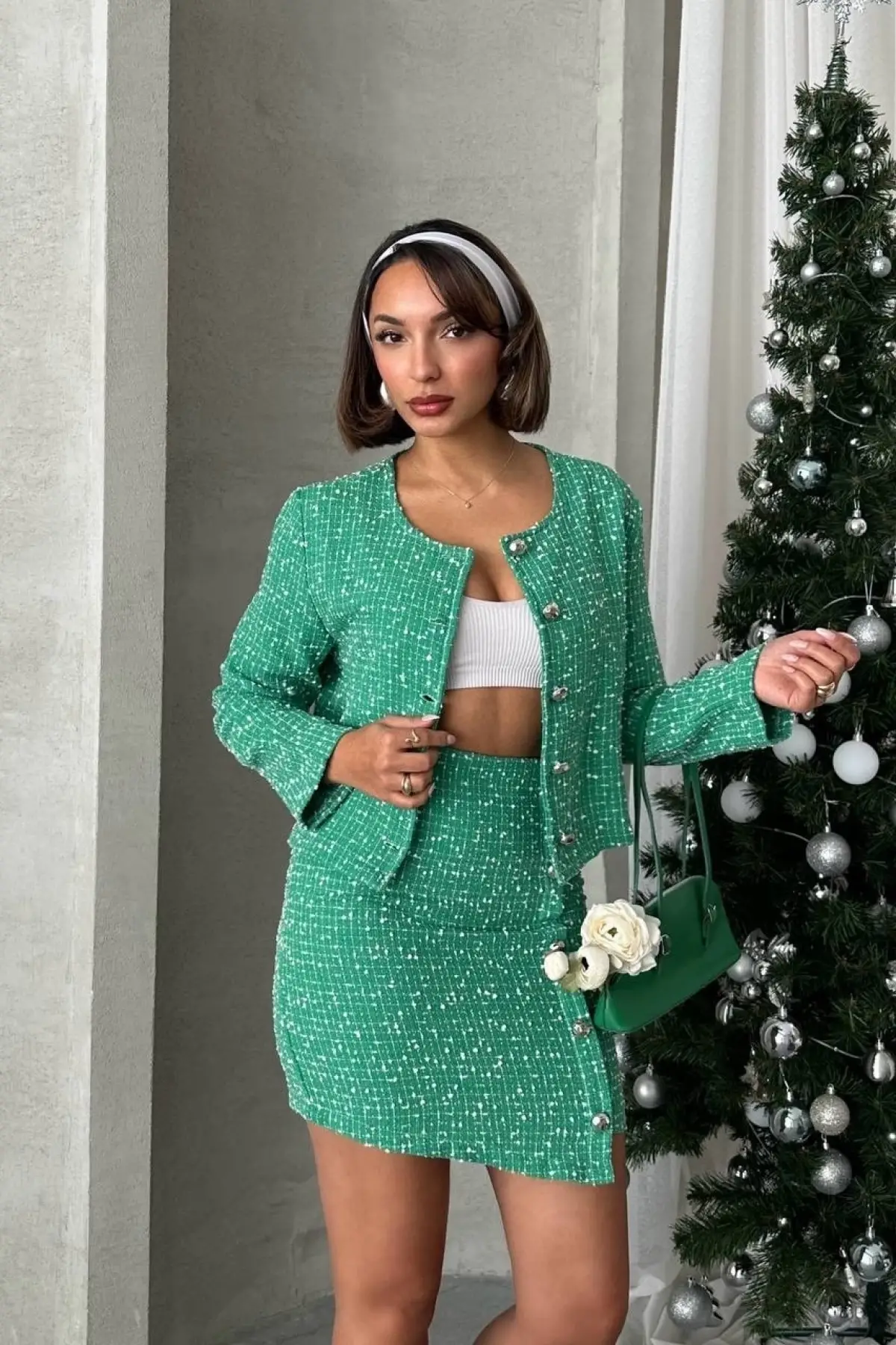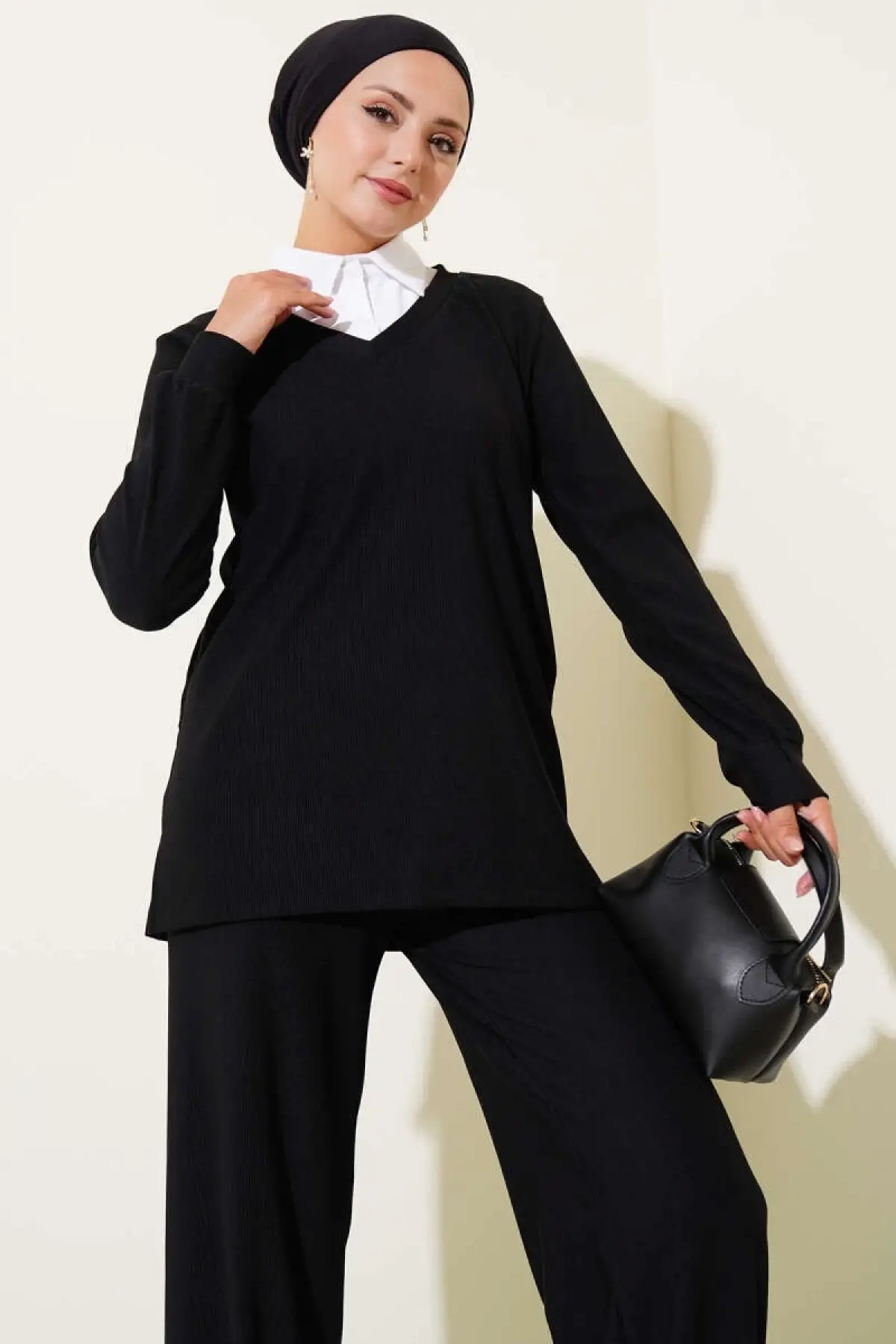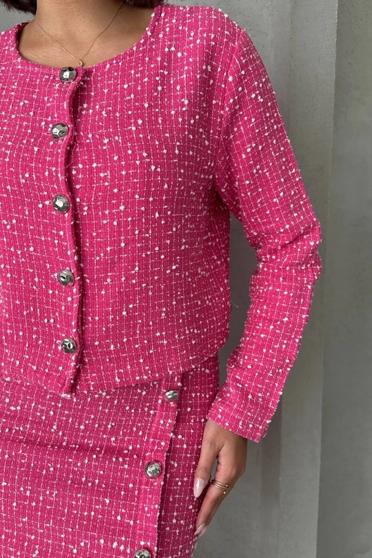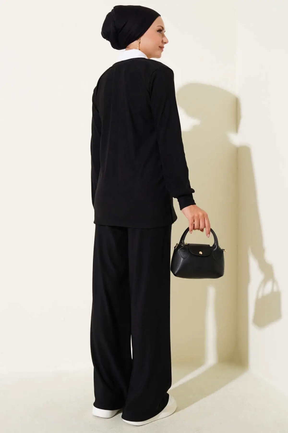 Triko Hırka Elbise İkili Takım, feminen ve şık bir görünüm sunar. KırmızıSiyah renk kombinasyonuyla dikkat çeker.