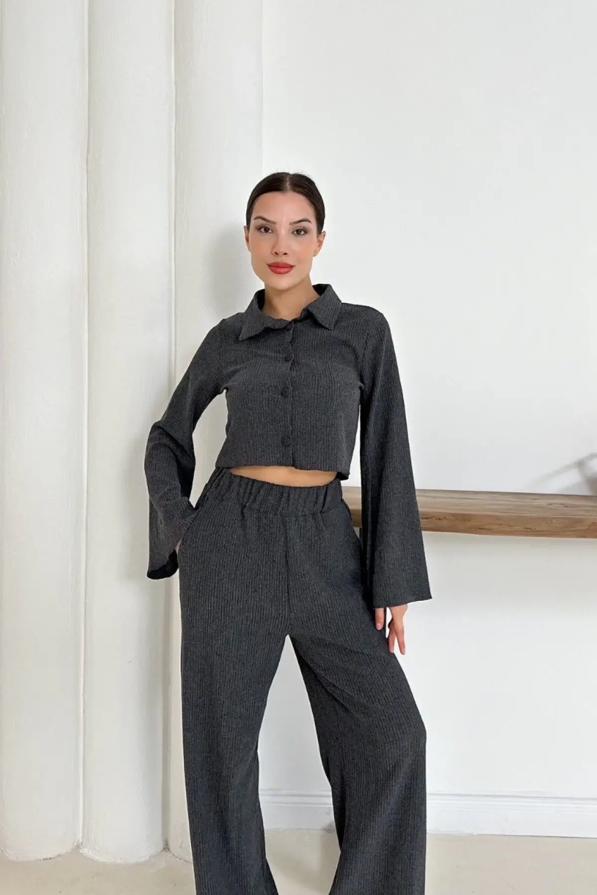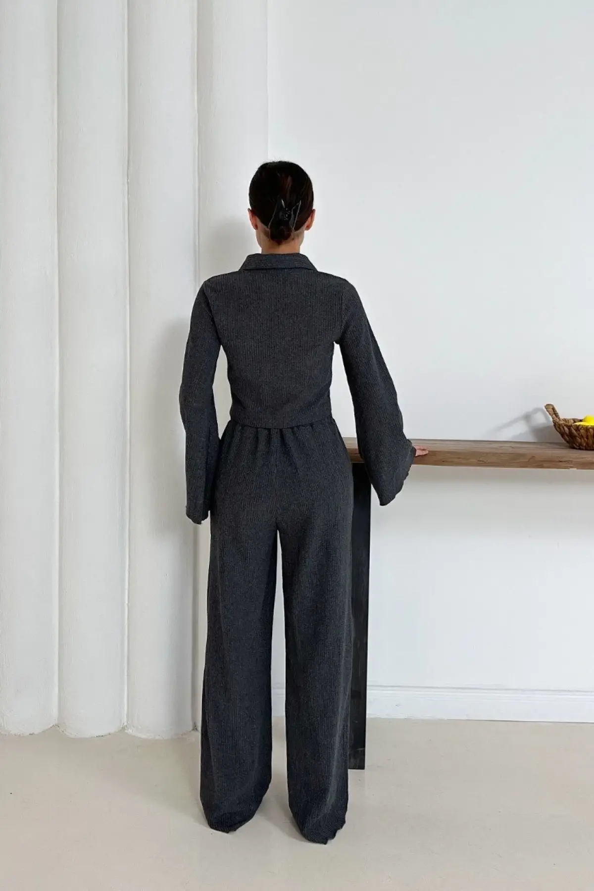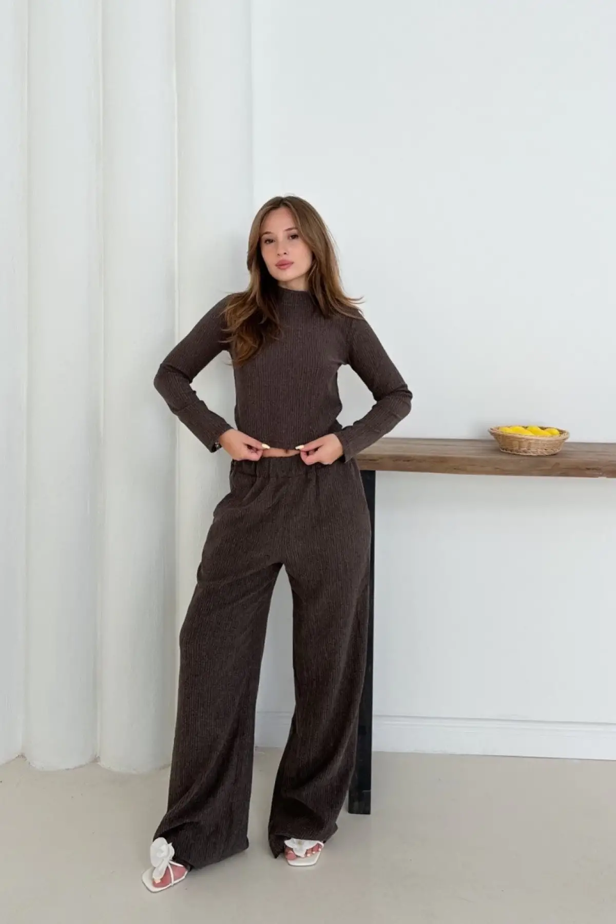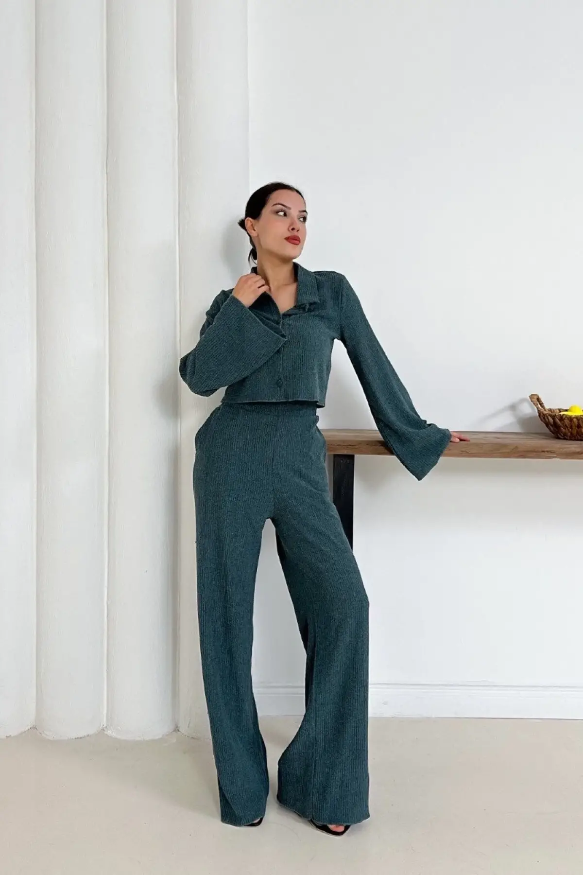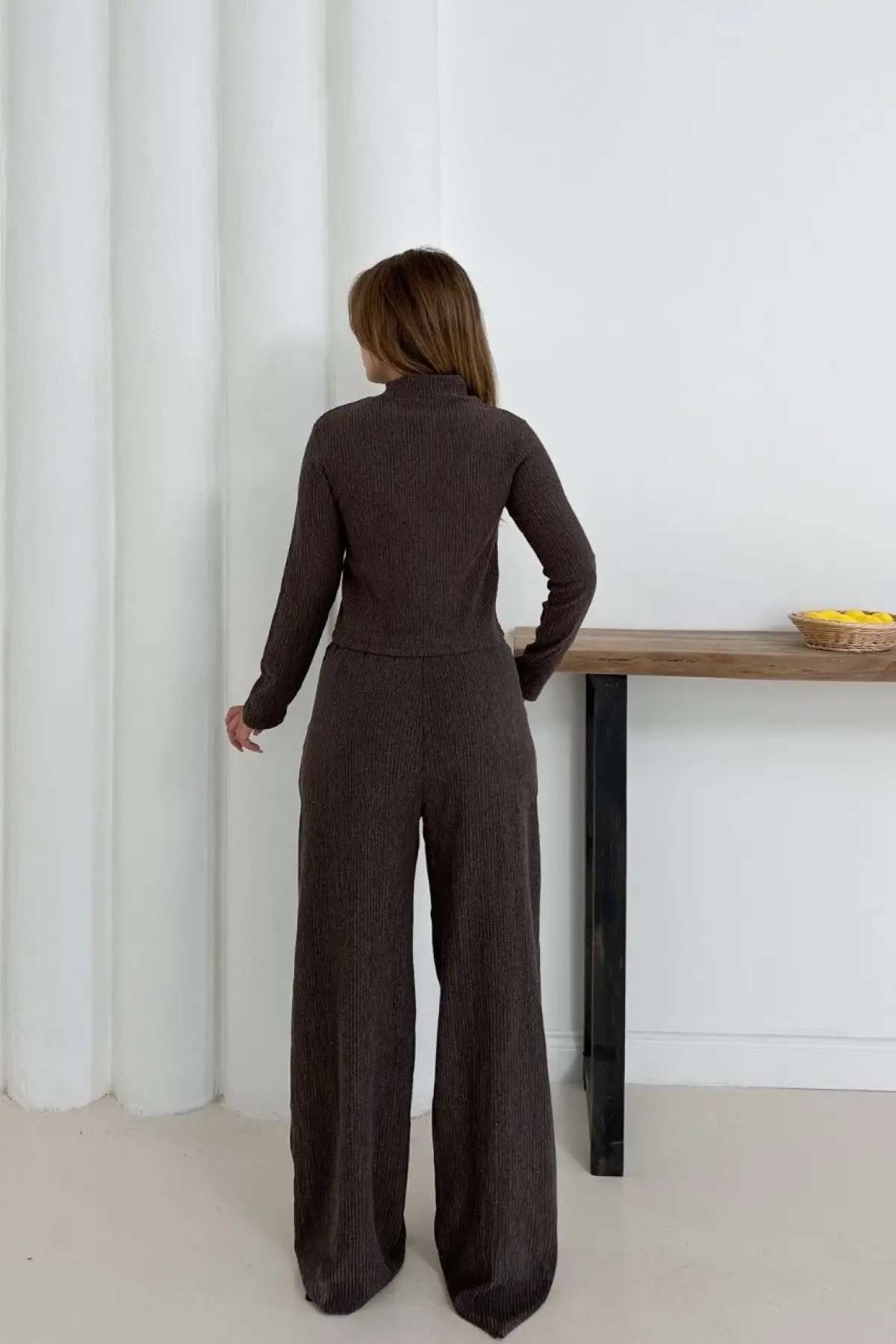 Triko Hırka Elbise İkili Takım, feminen ve şık bir görünüm sunar. KırmızıSiyah renk kombinasyonuyla dikkat çeker.