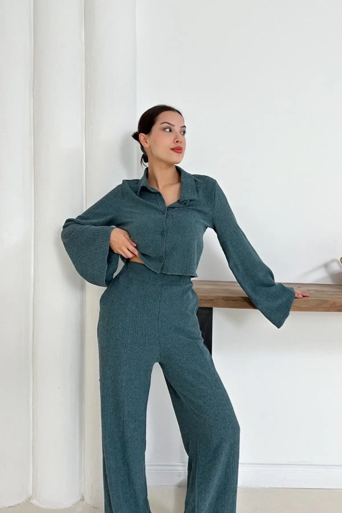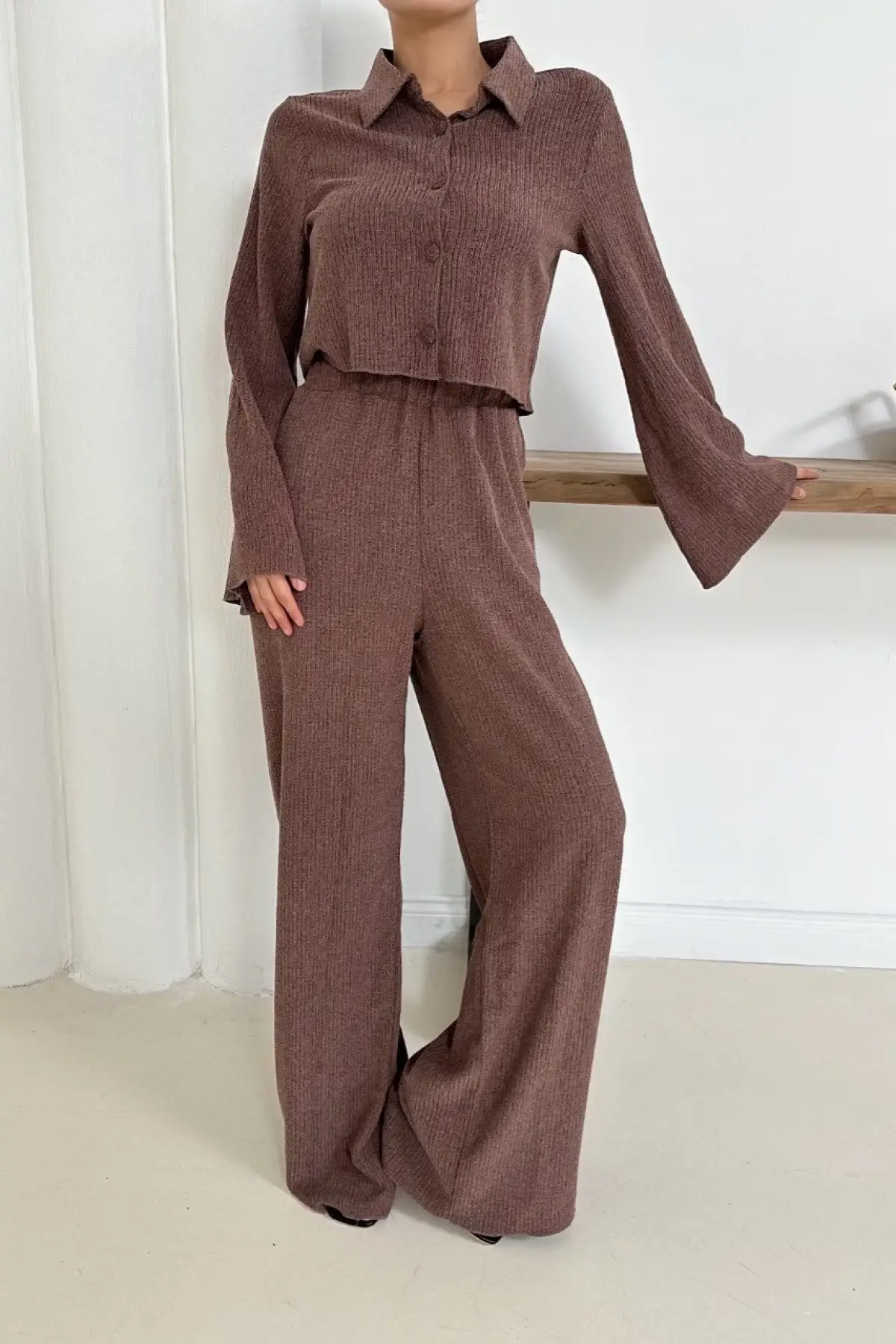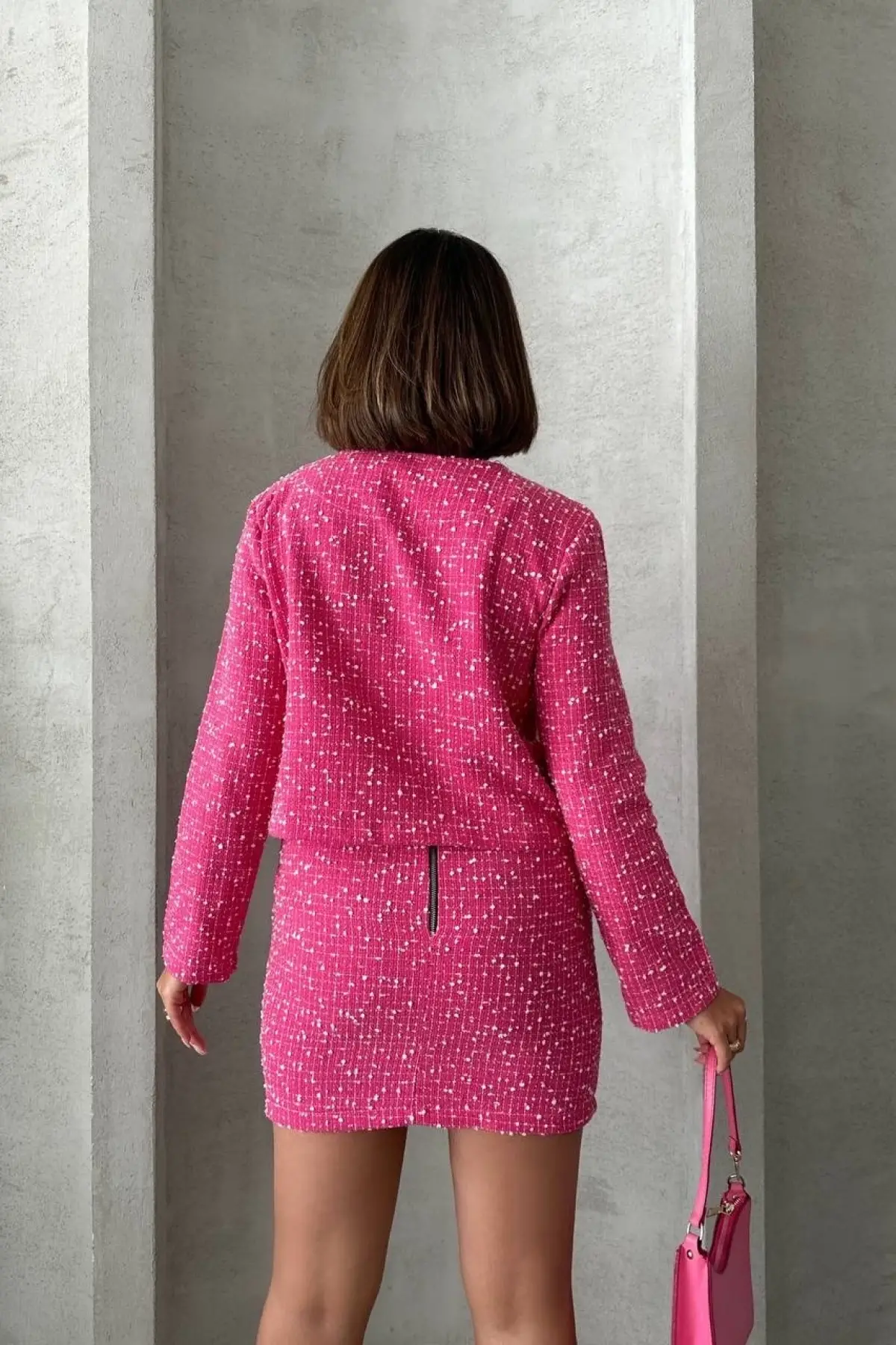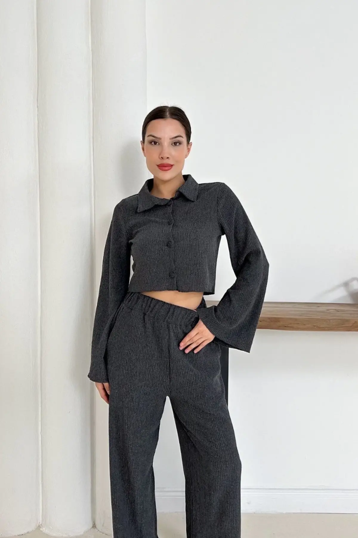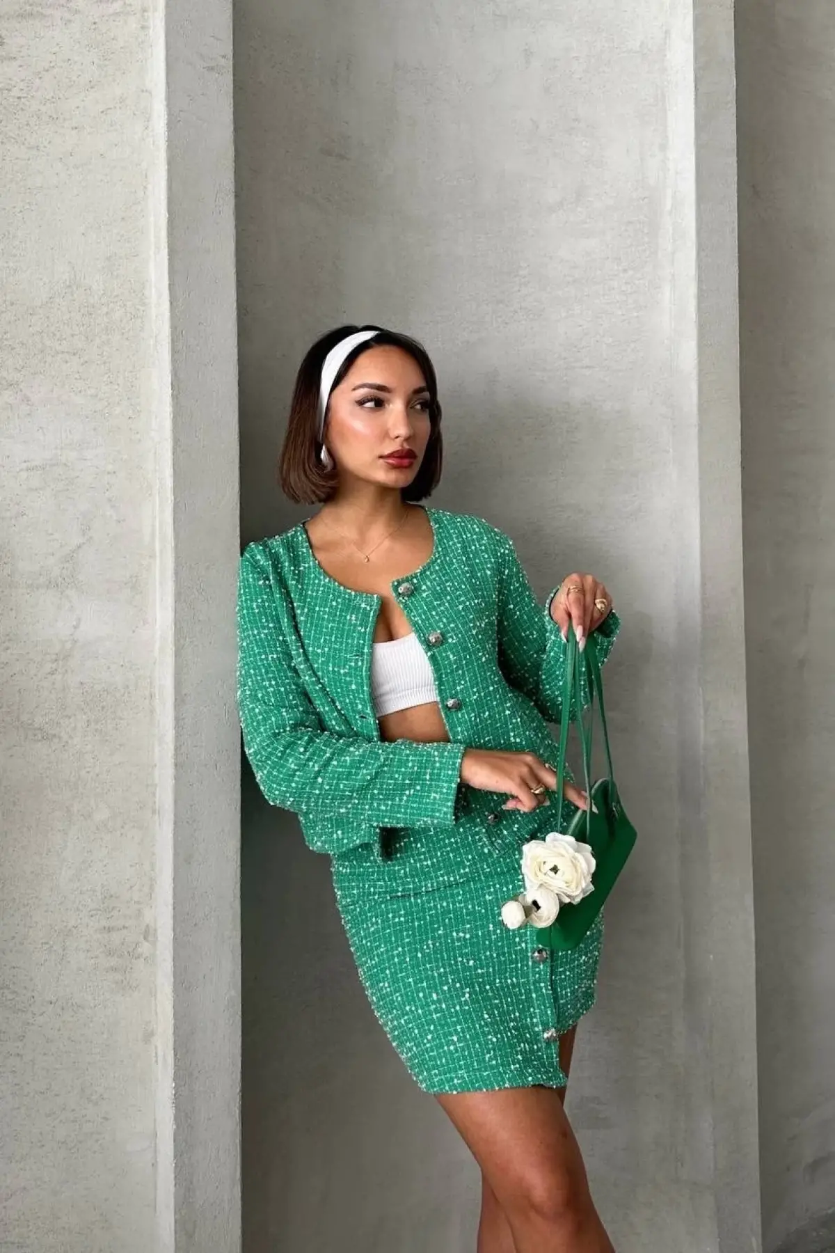 Triko Hırka Elbise İkili Takım, feminen ve şık bir görünüm sunar. KırmızıSiyah renk kombinasyonuyla dikkat çeker.
