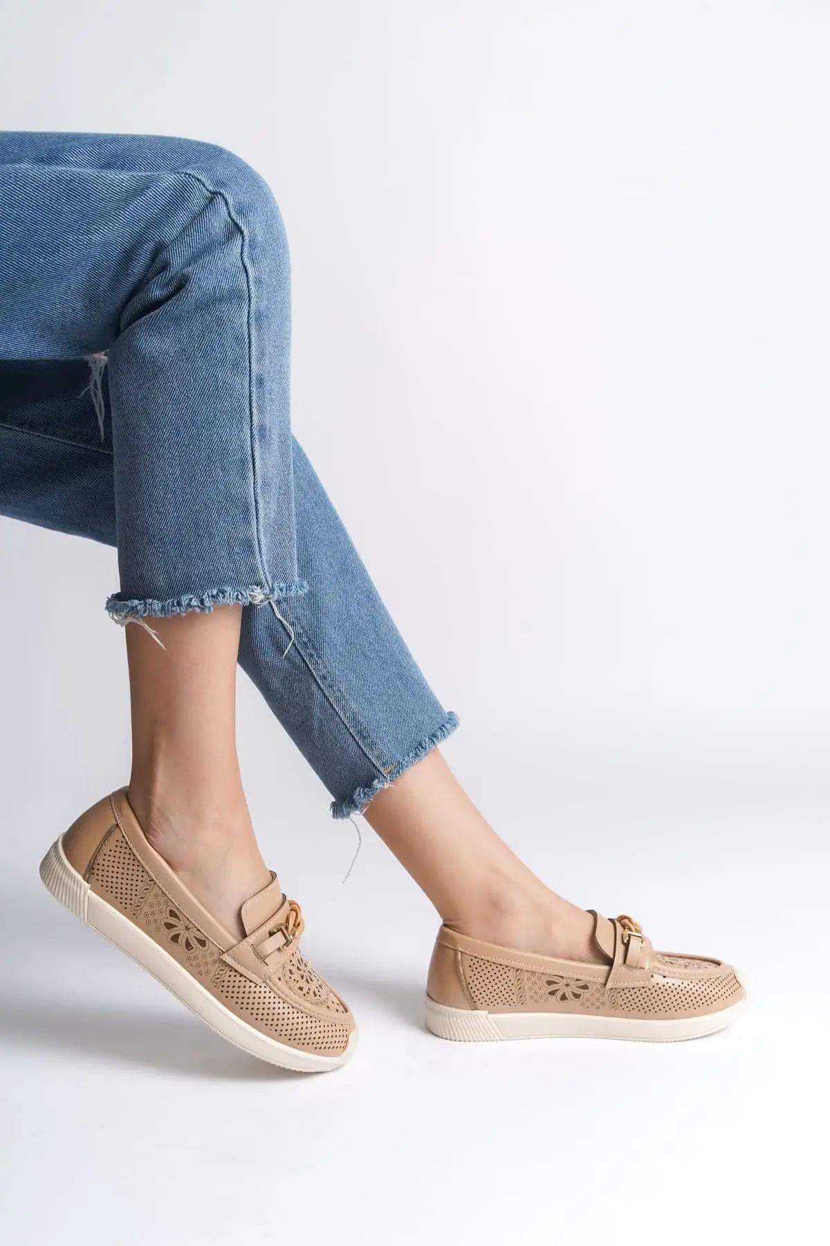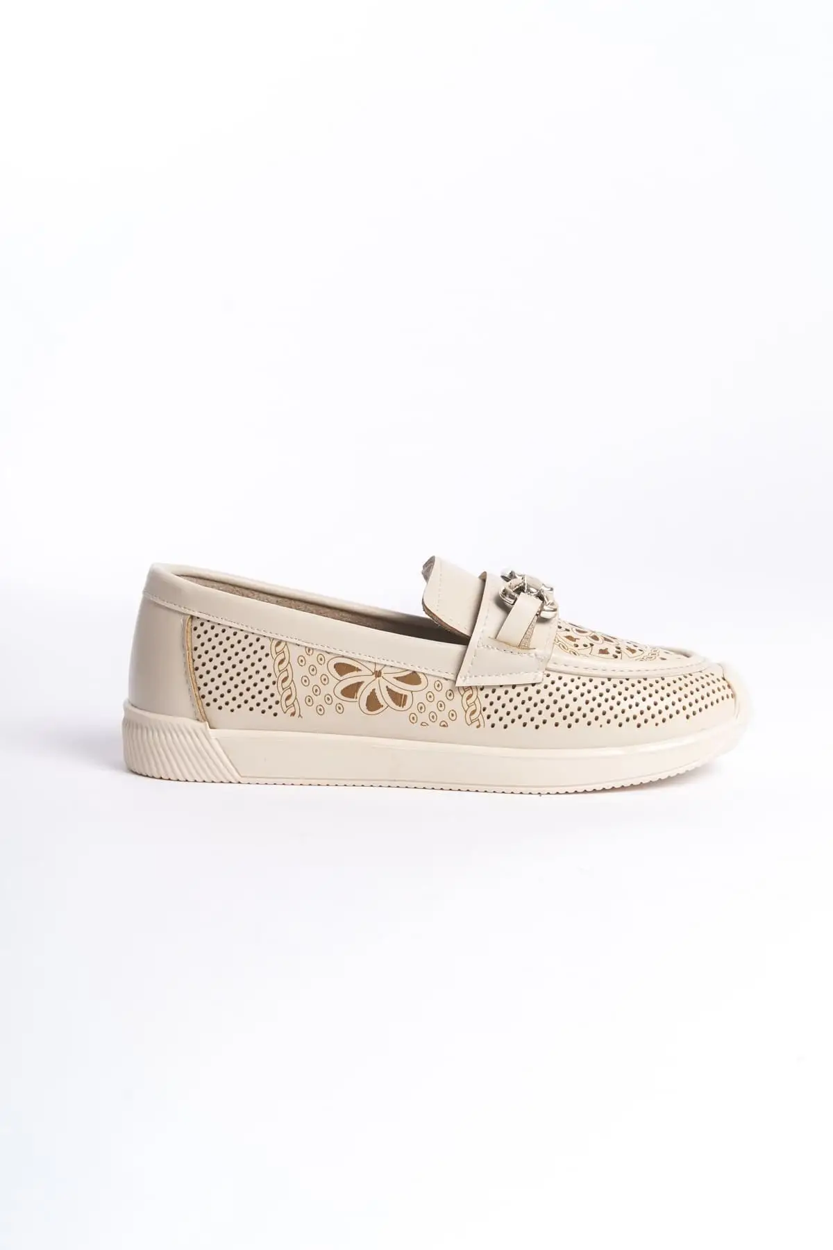 Layla Bağcıksız Ortopedik Rahat Taban Çiçek Desenli Kadın Babet Ayakkabı Kt - Ten
