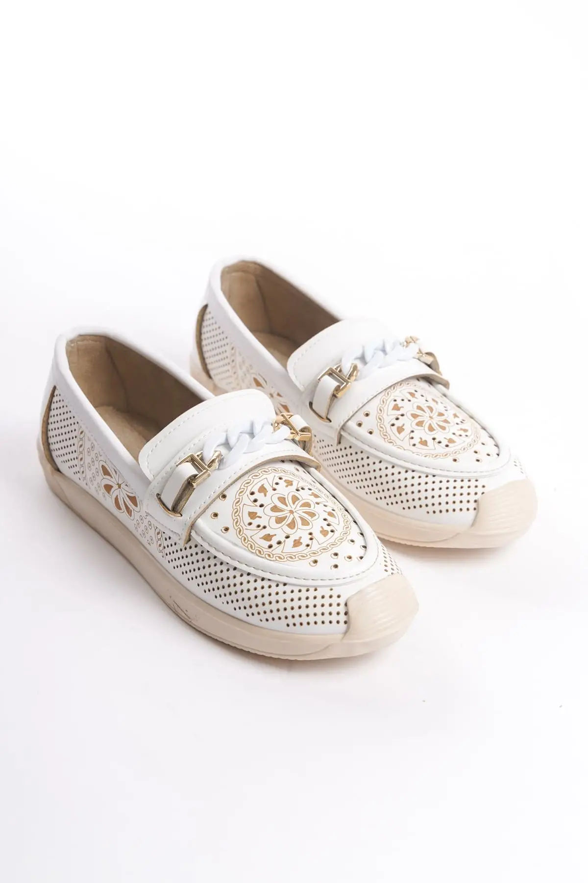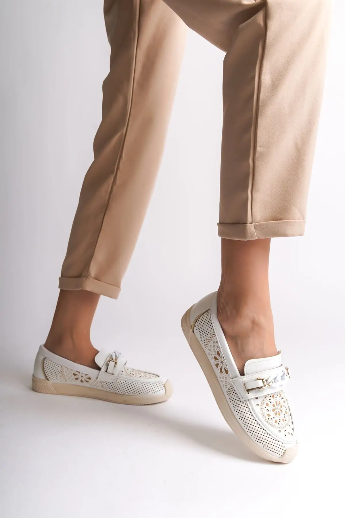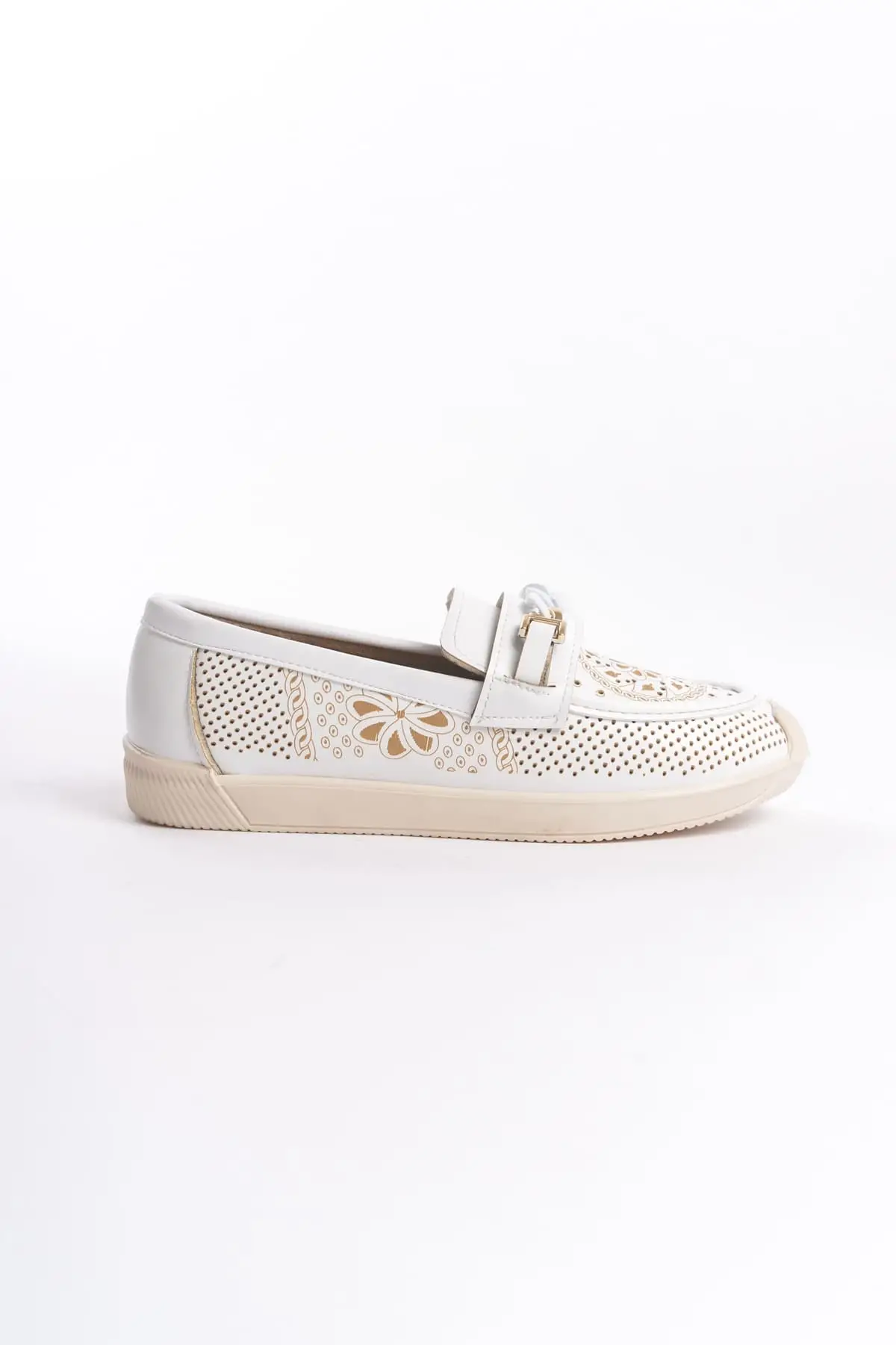 Layla Bağcıksız Ortopedik Rahat Taban Çiçek Desenli Kadın Babet Ayakkabı Kt - Beyaz