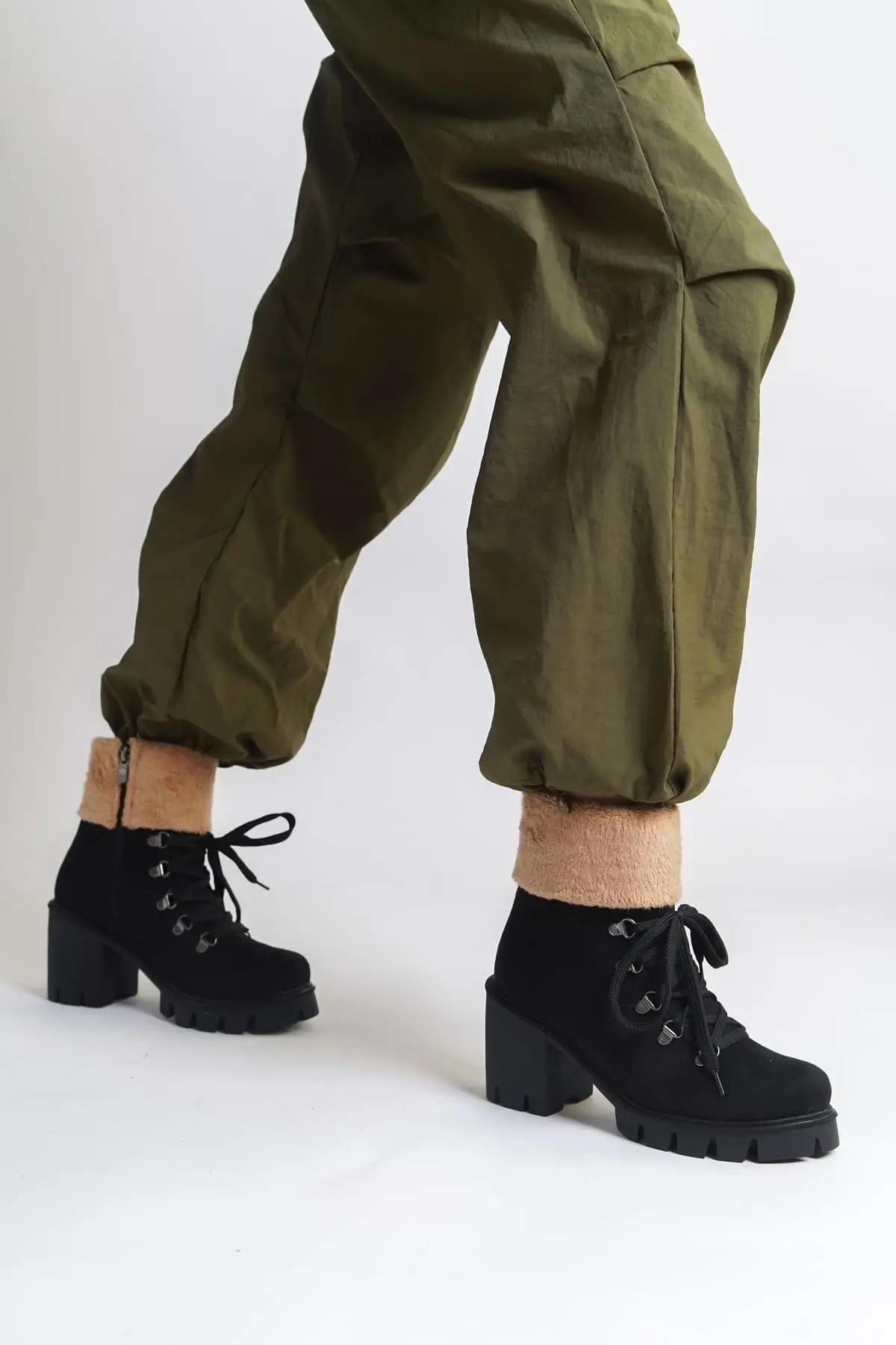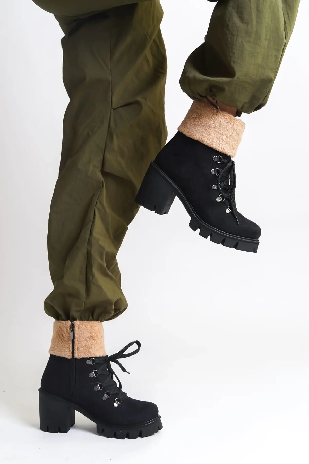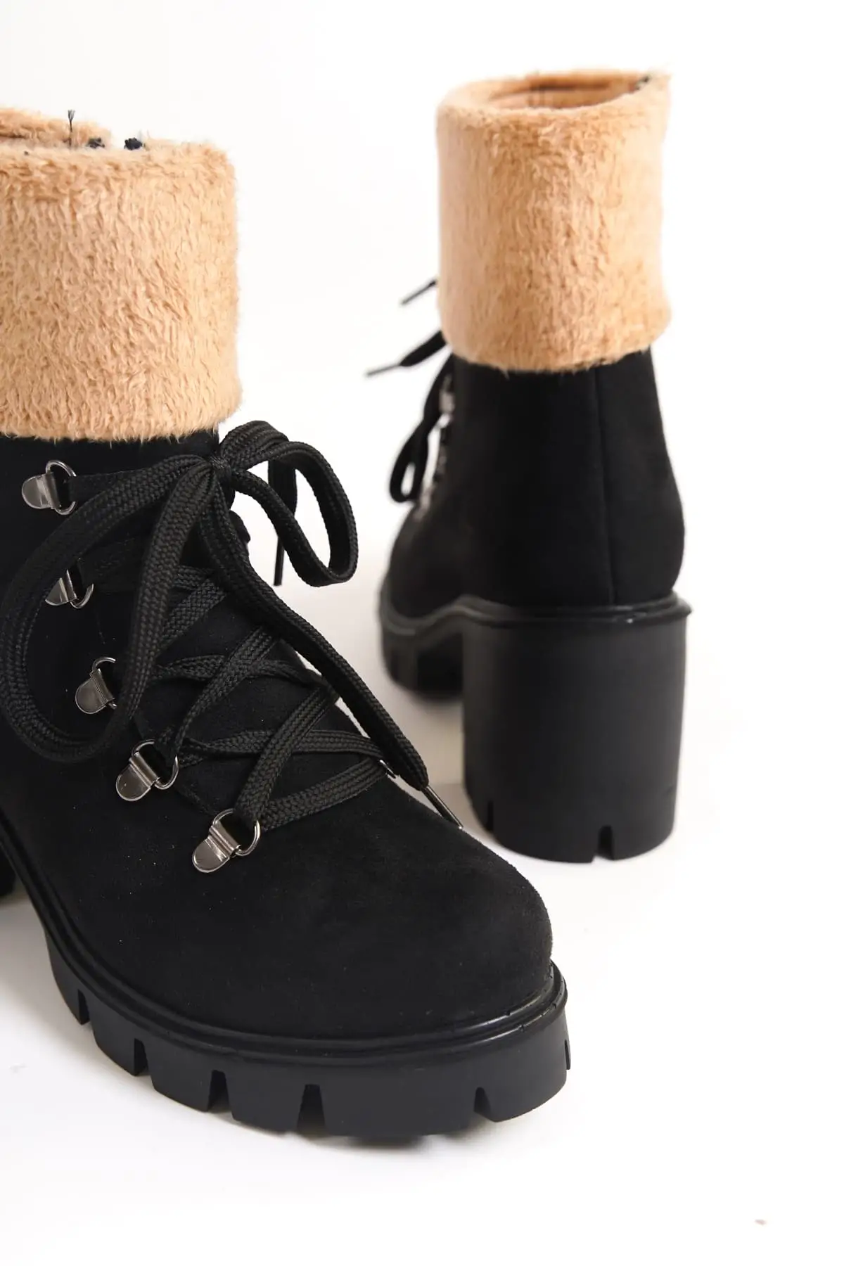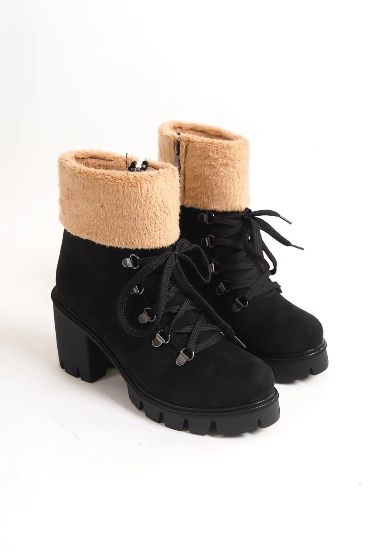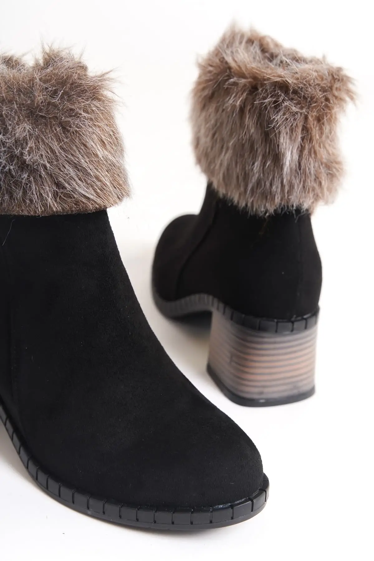 Emma Bağcıklı Fermuarlı Ortopedik Taban Topuklu Kürk Detaylı Süet Kadın Bot St - Siyah