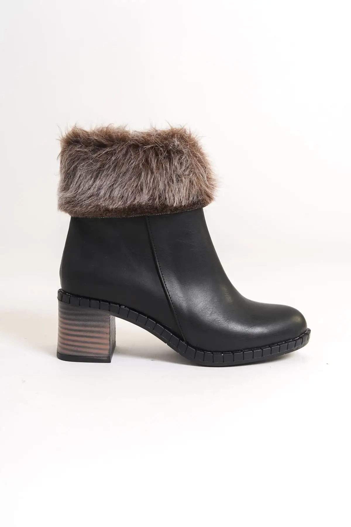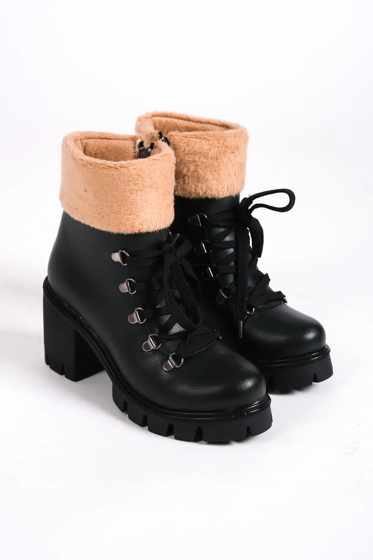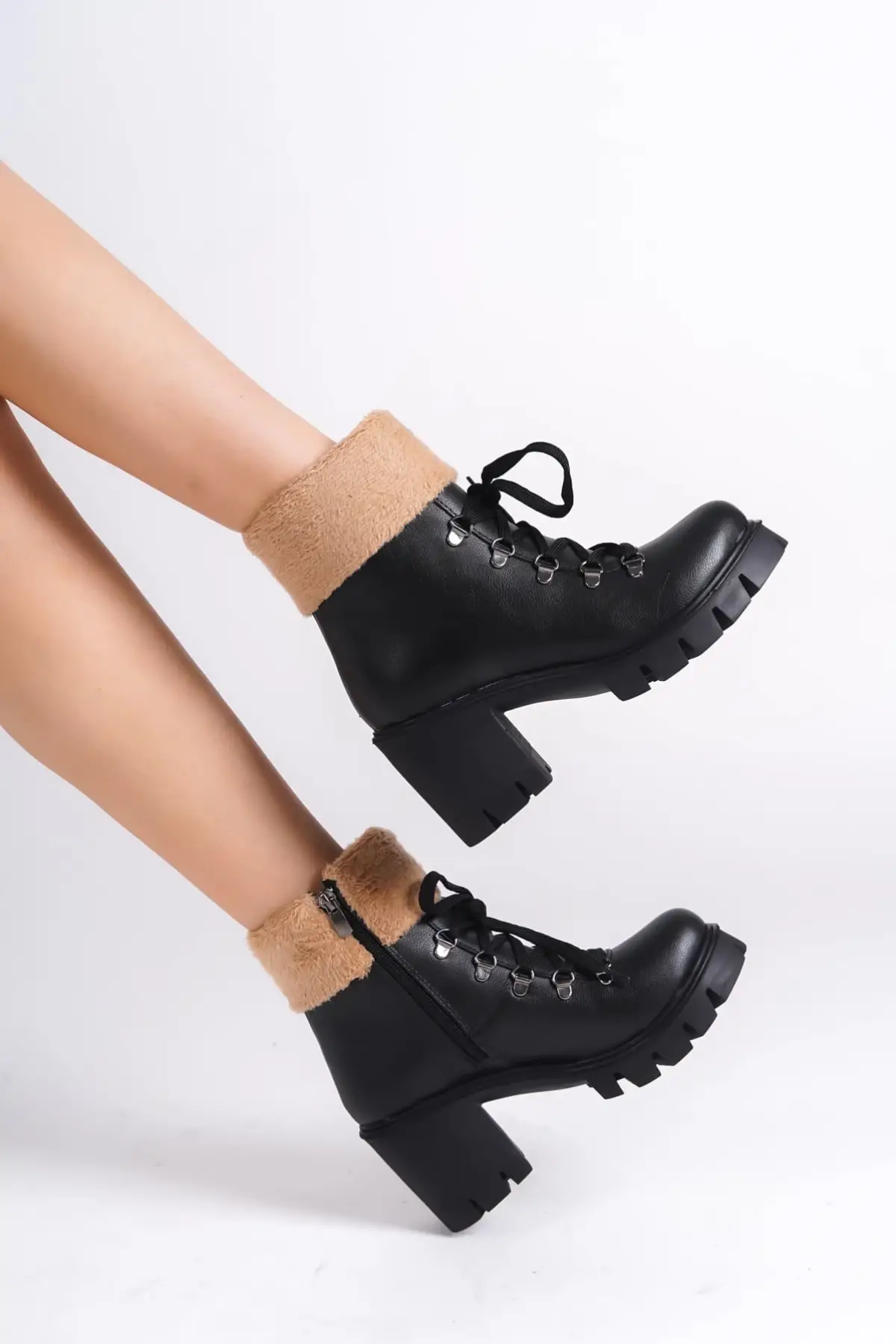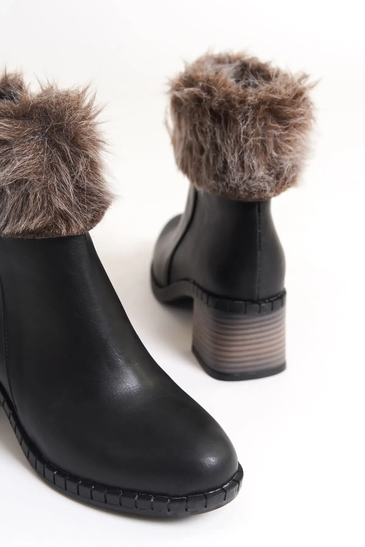 Emma Bağcıklı Fermuarlı Ortopedik Taban Topuklu Kürk Detaylıkadın Bot St - Siyah