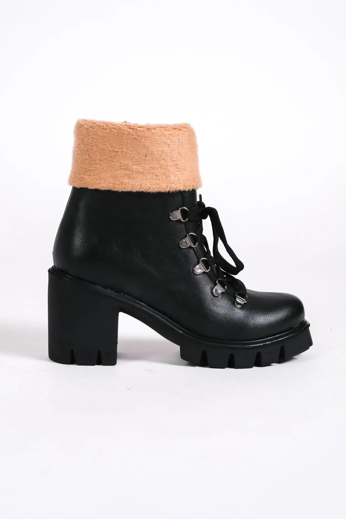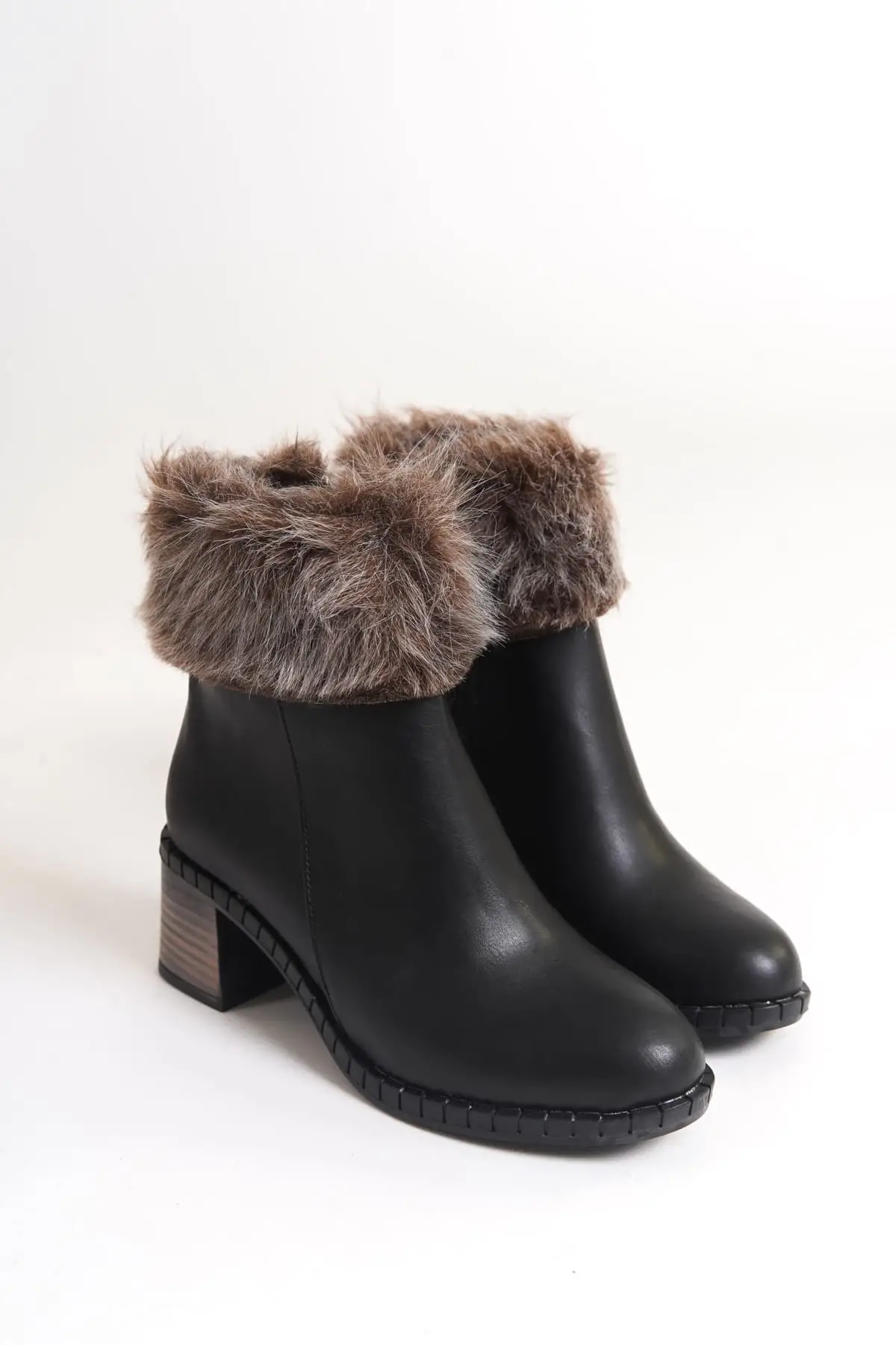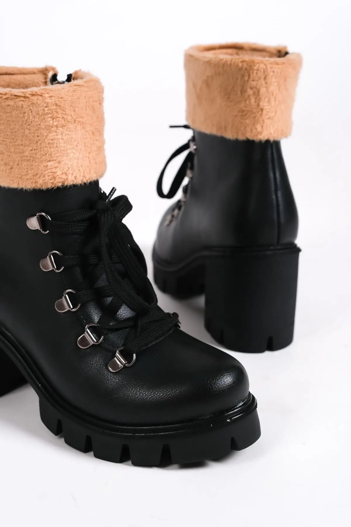 Emma Bağcıklı Fermuarlı Ortopedik Taban Topuklu Kürk Detaylıkadın Bot St - Siyah
