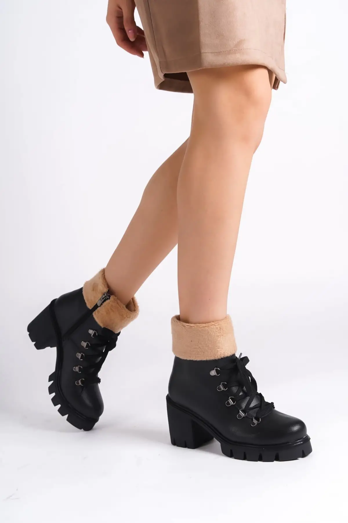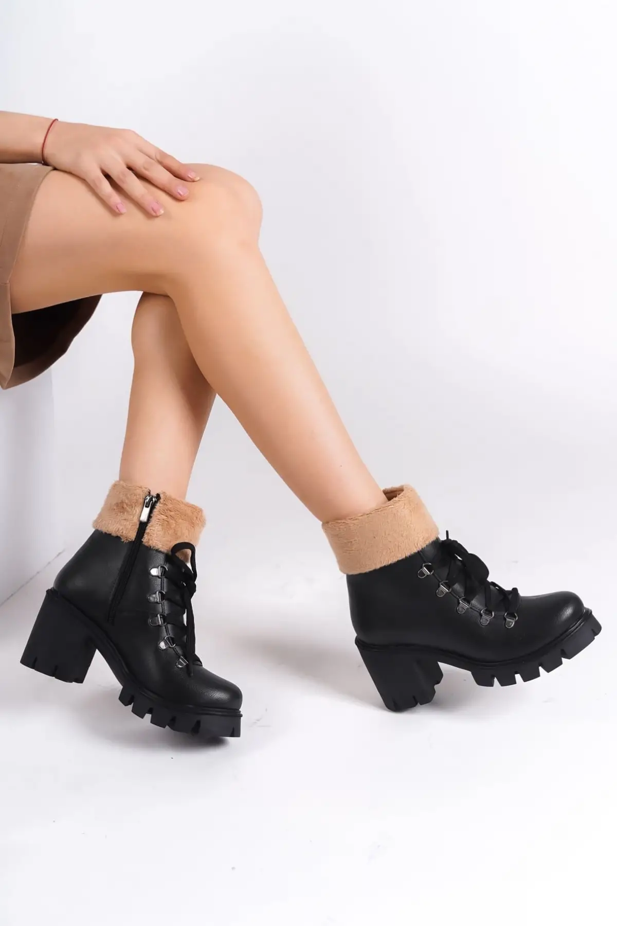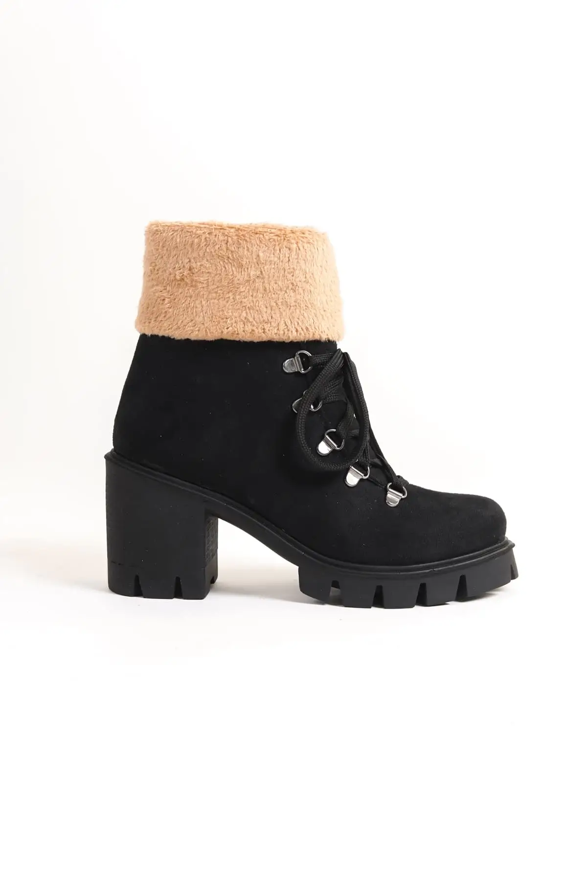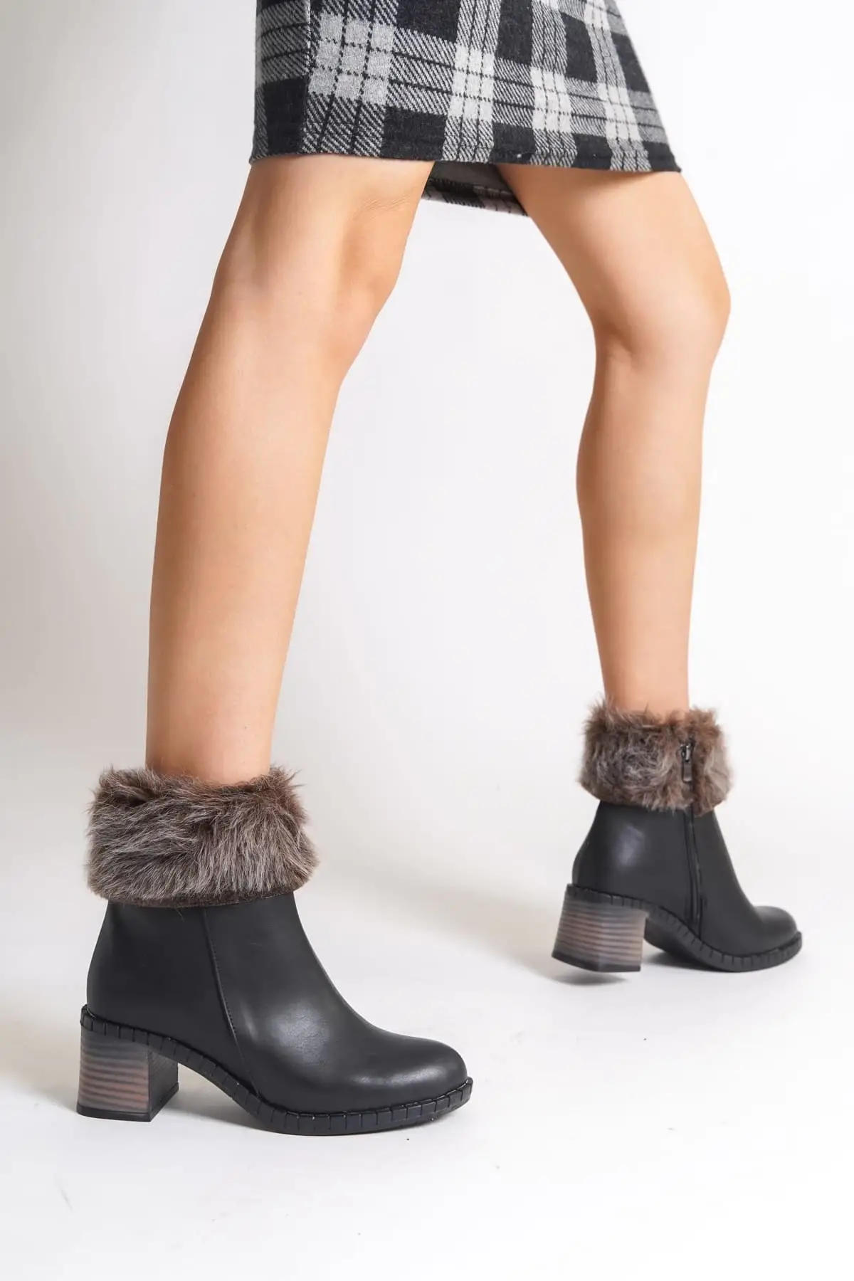 Emma Bağcıklı Fermuarlı Ortopedik Taban Topuklu Kürk Detaylıkadın Bot St - Siyah