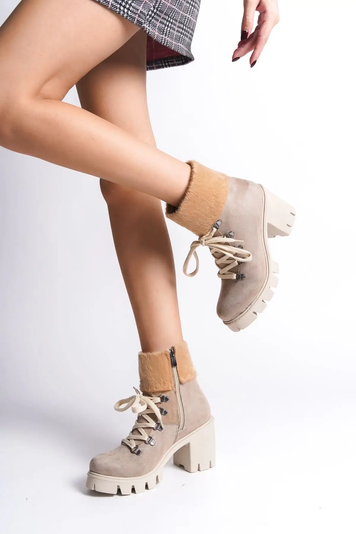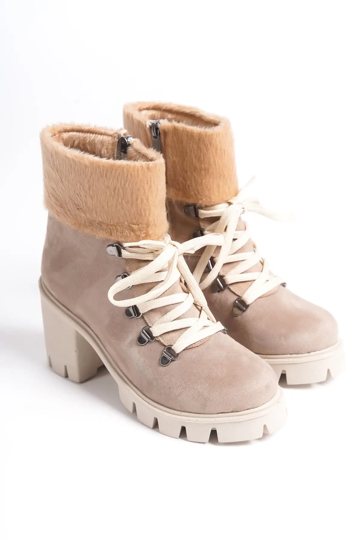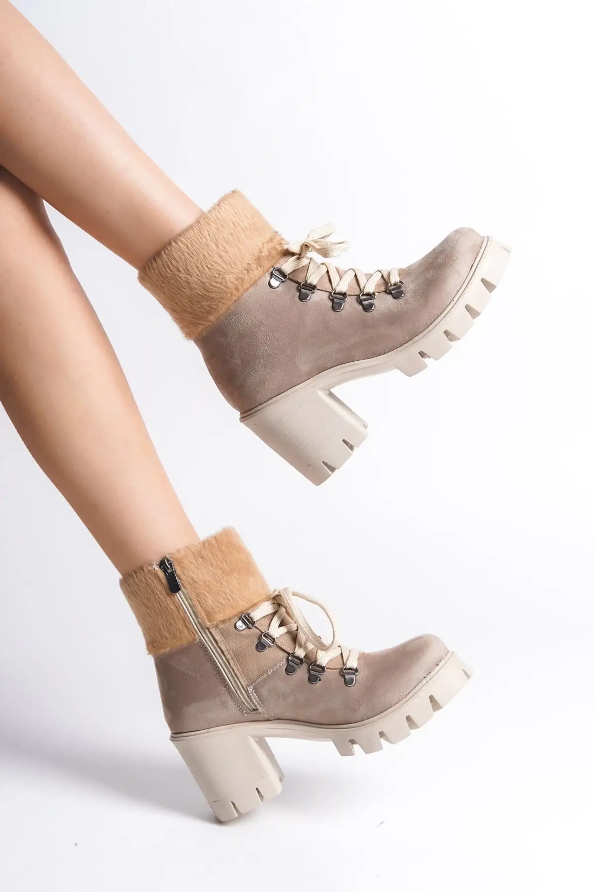 Emma Bağcıklı Fermuarlı Ortopedik Taban Topuklu Kürk Detaylı Süet Kadın Bot Tt - Ten