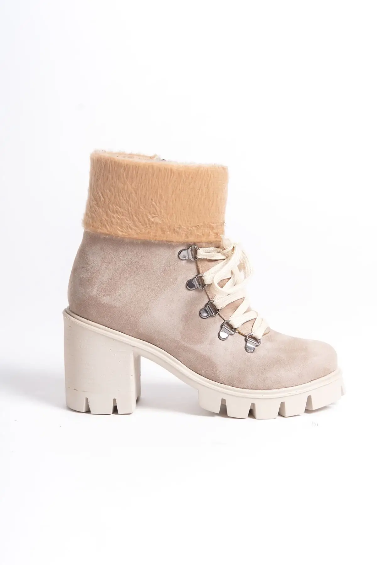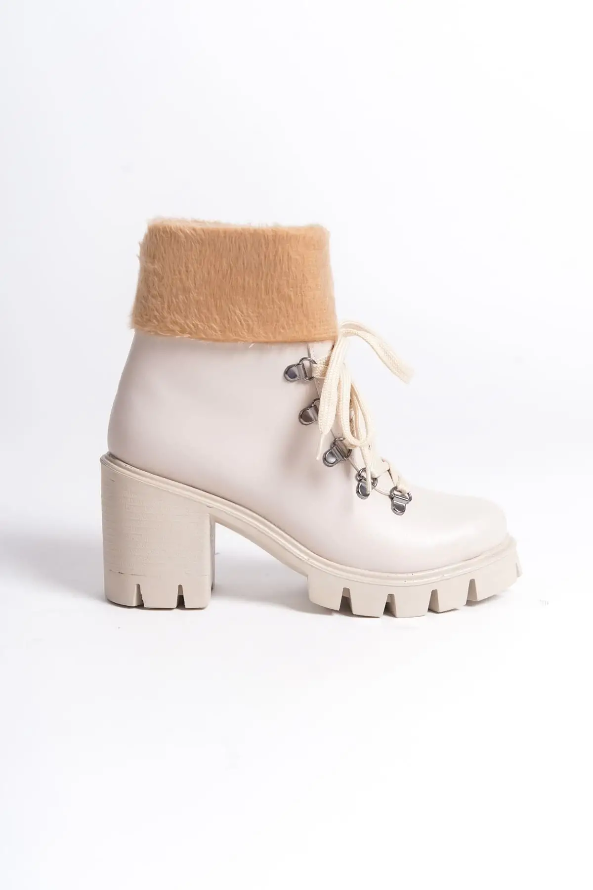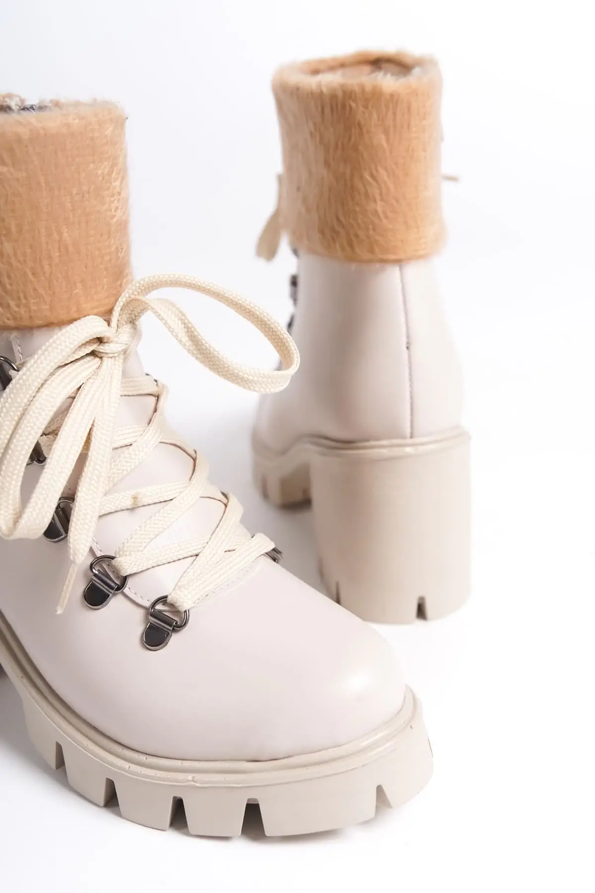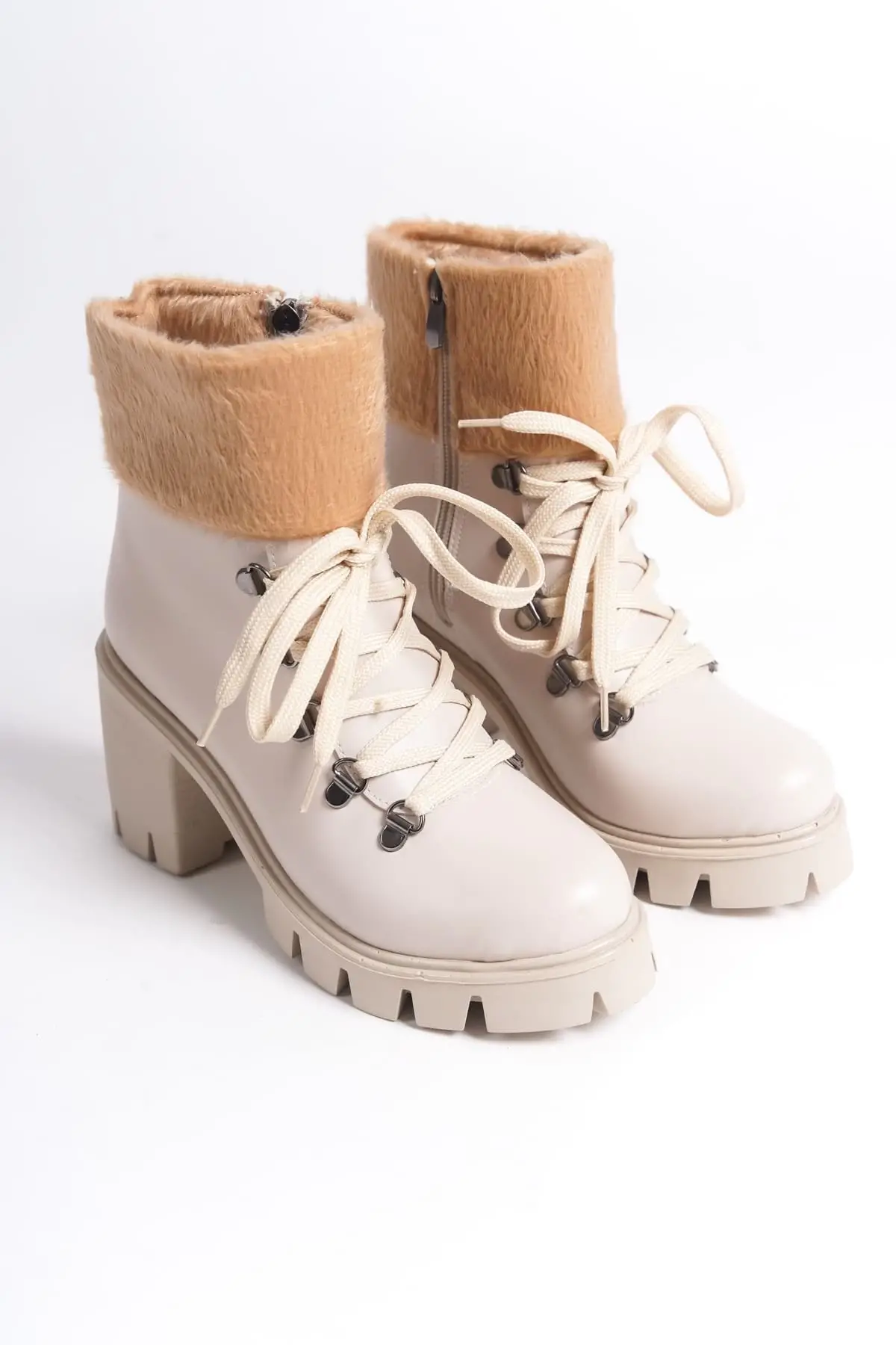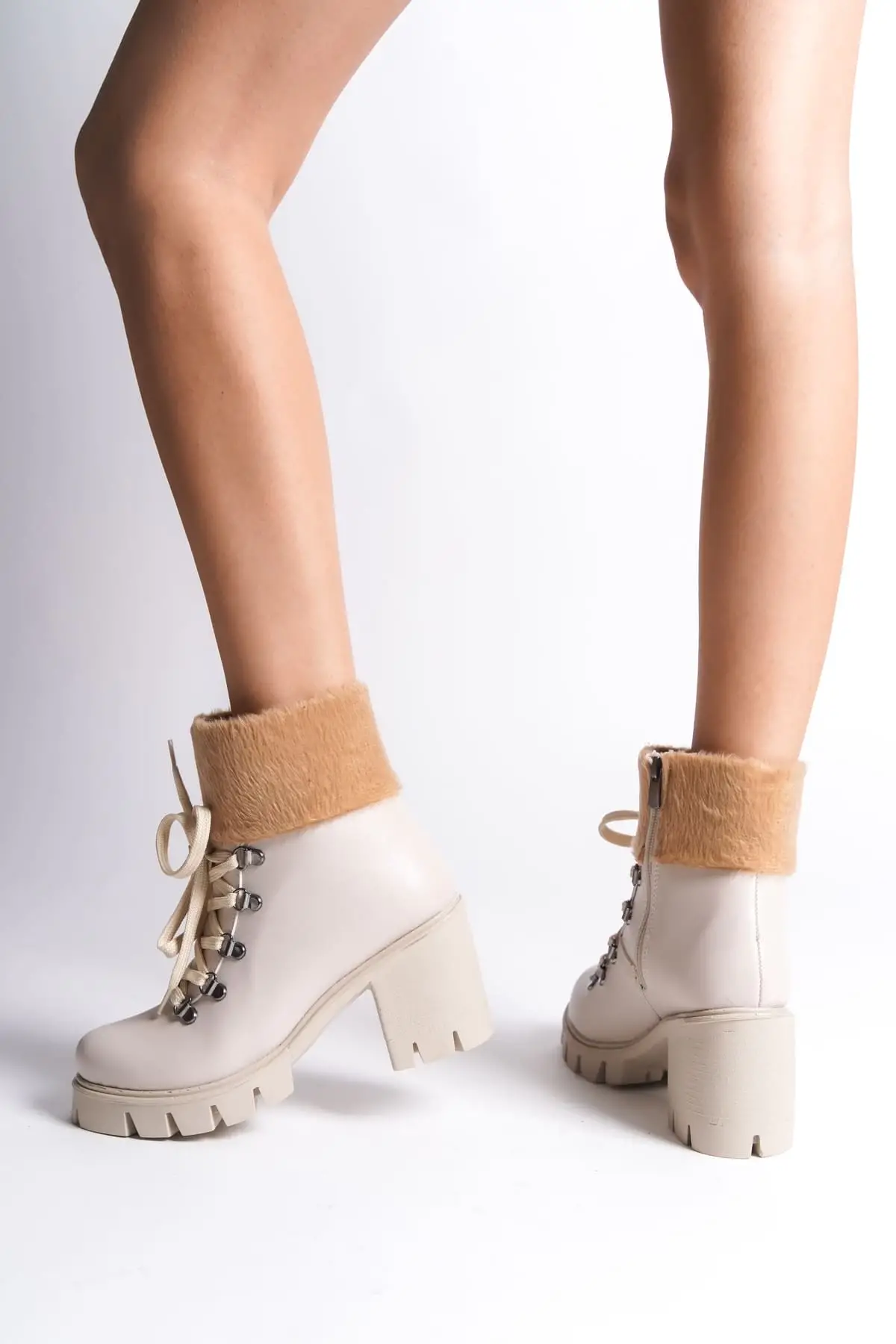 Emma Bağcıklı Fermuarlı Ortopedik Taban Topuklu Kürk Detaylıkadın Bot Kt - Krem