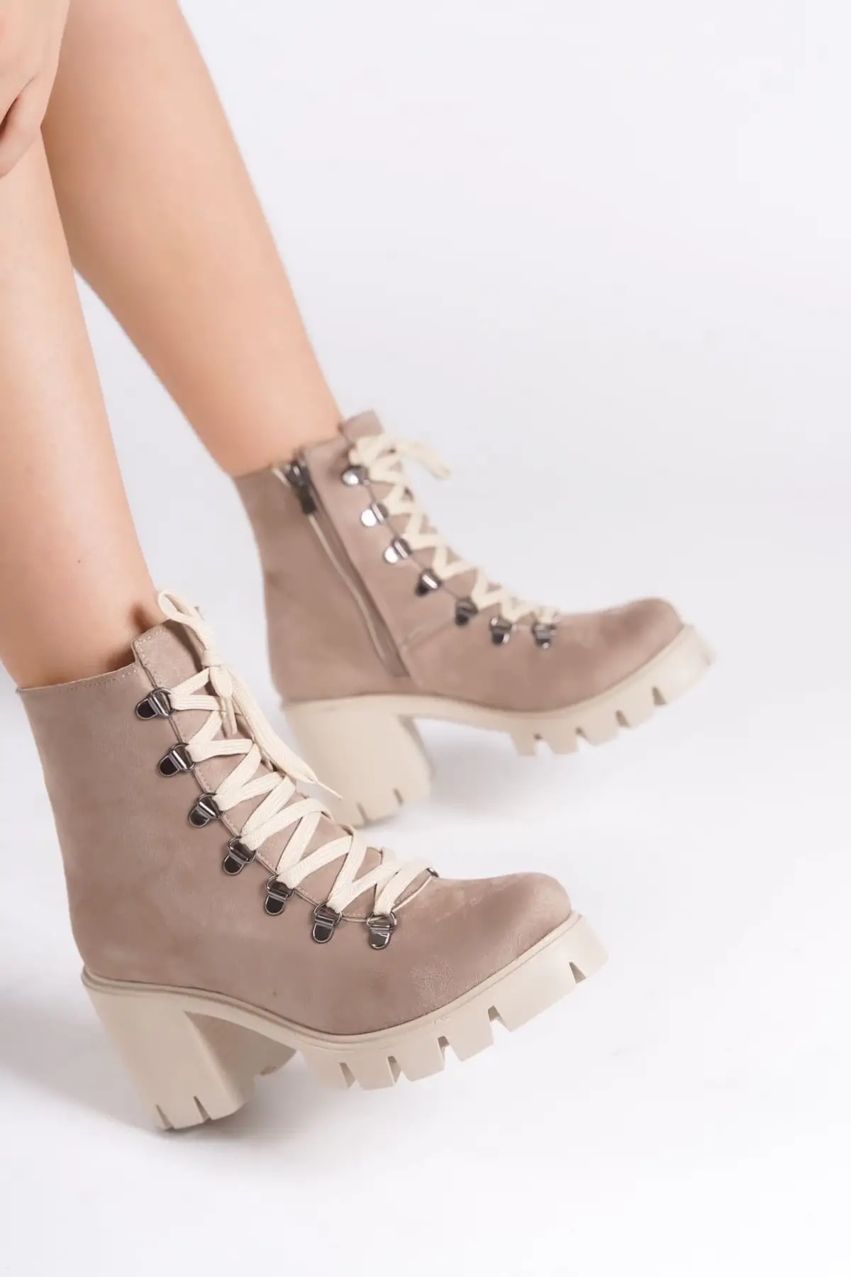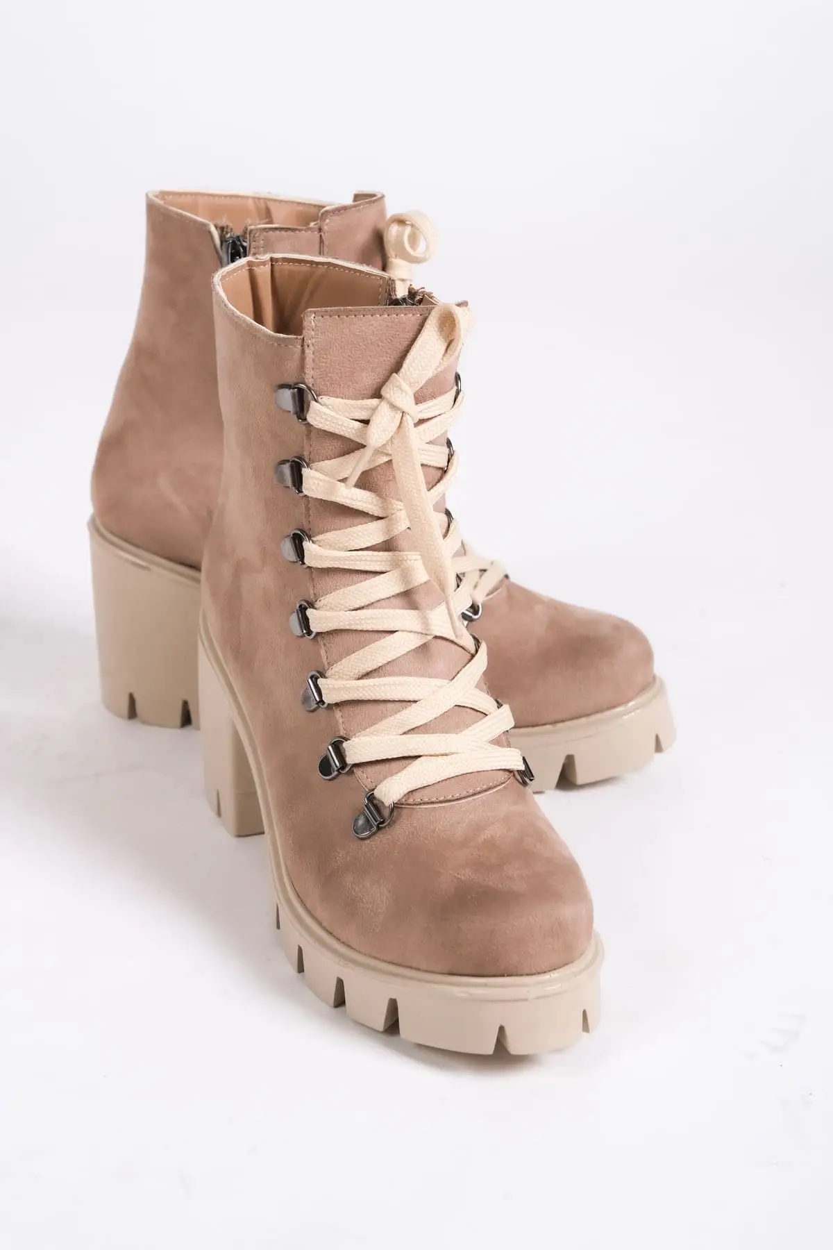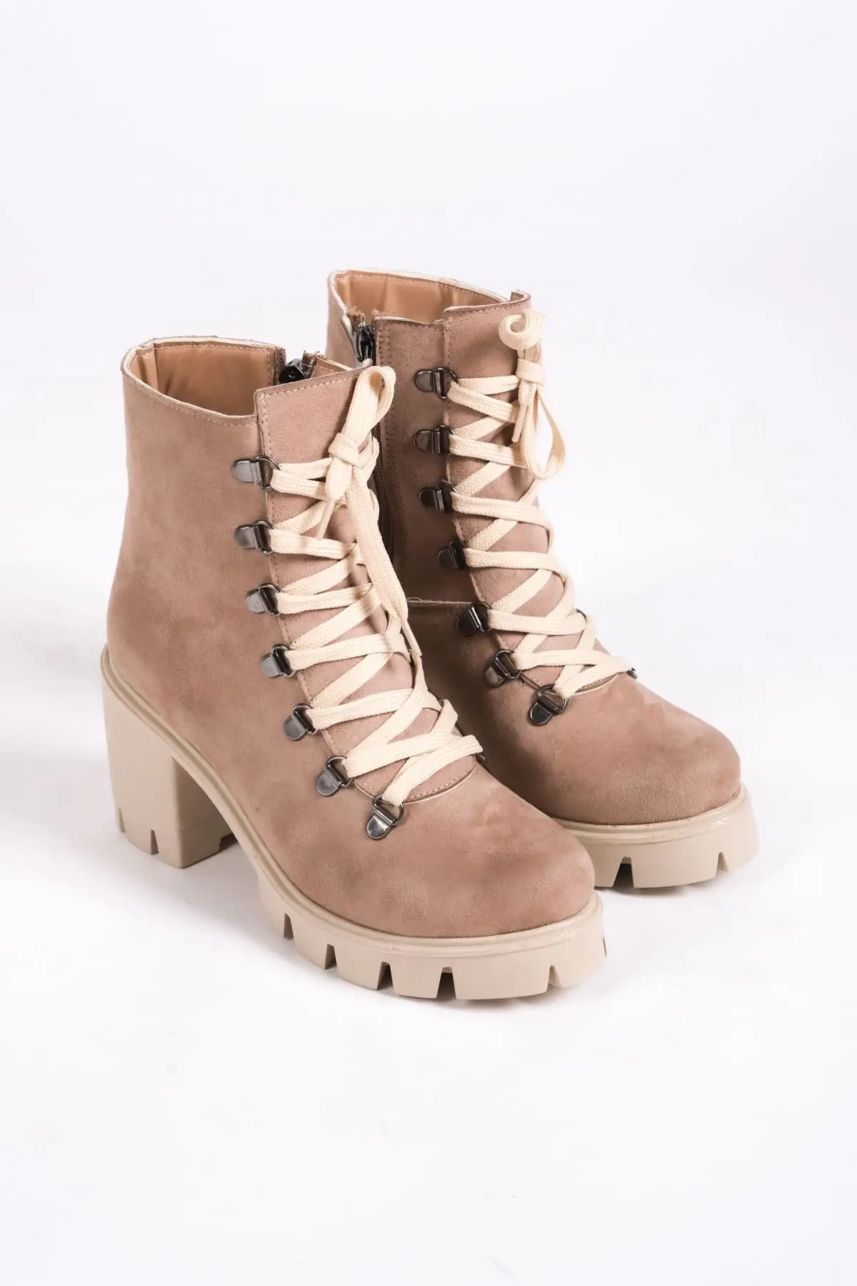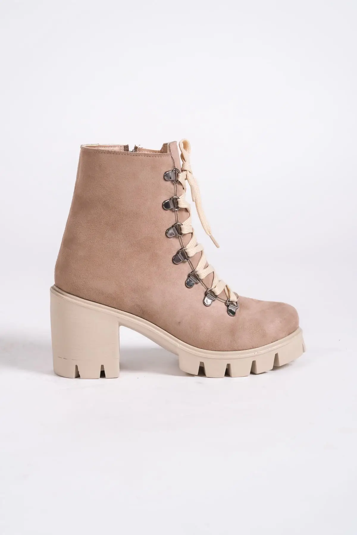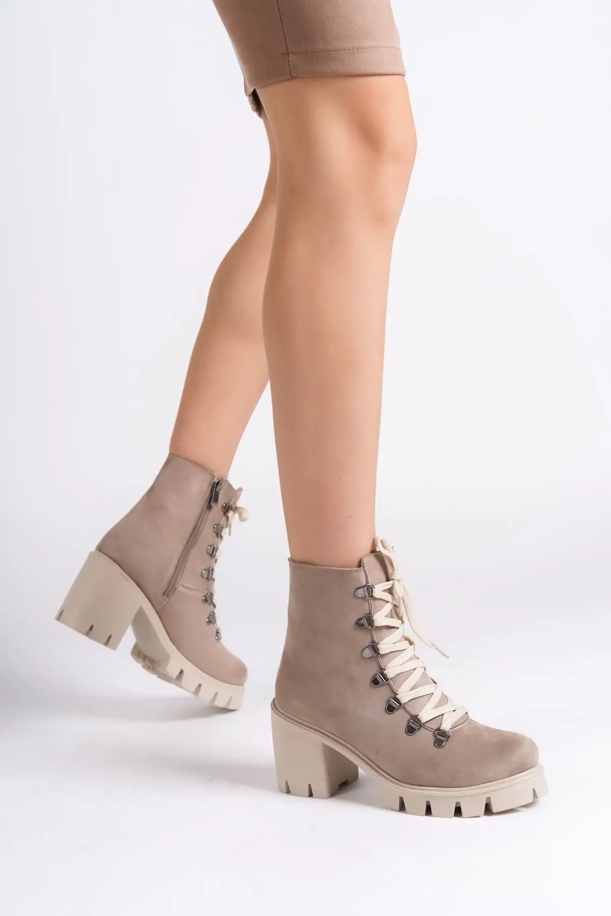 Emma Bağcıklı Fermuarlı Ortopedik Taban Topuklu Süet Kadın Bot Tt - Ten