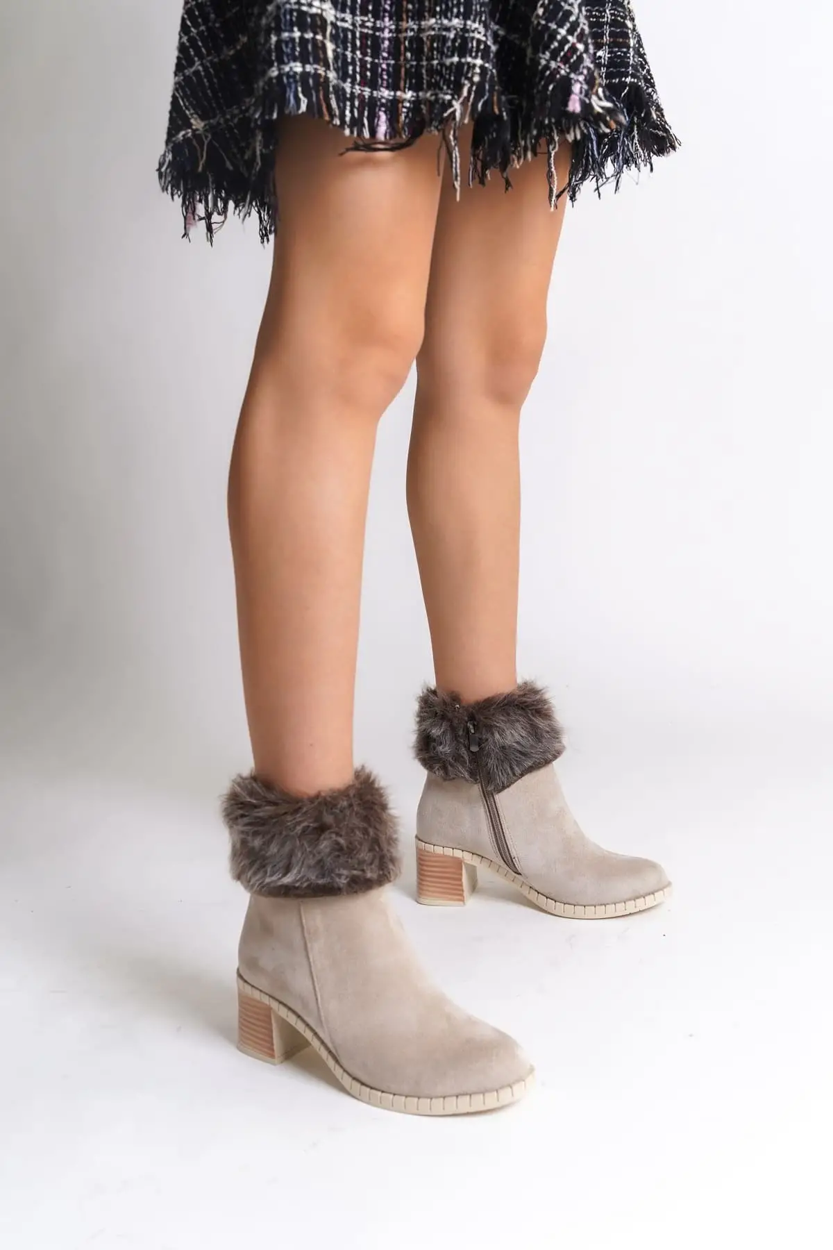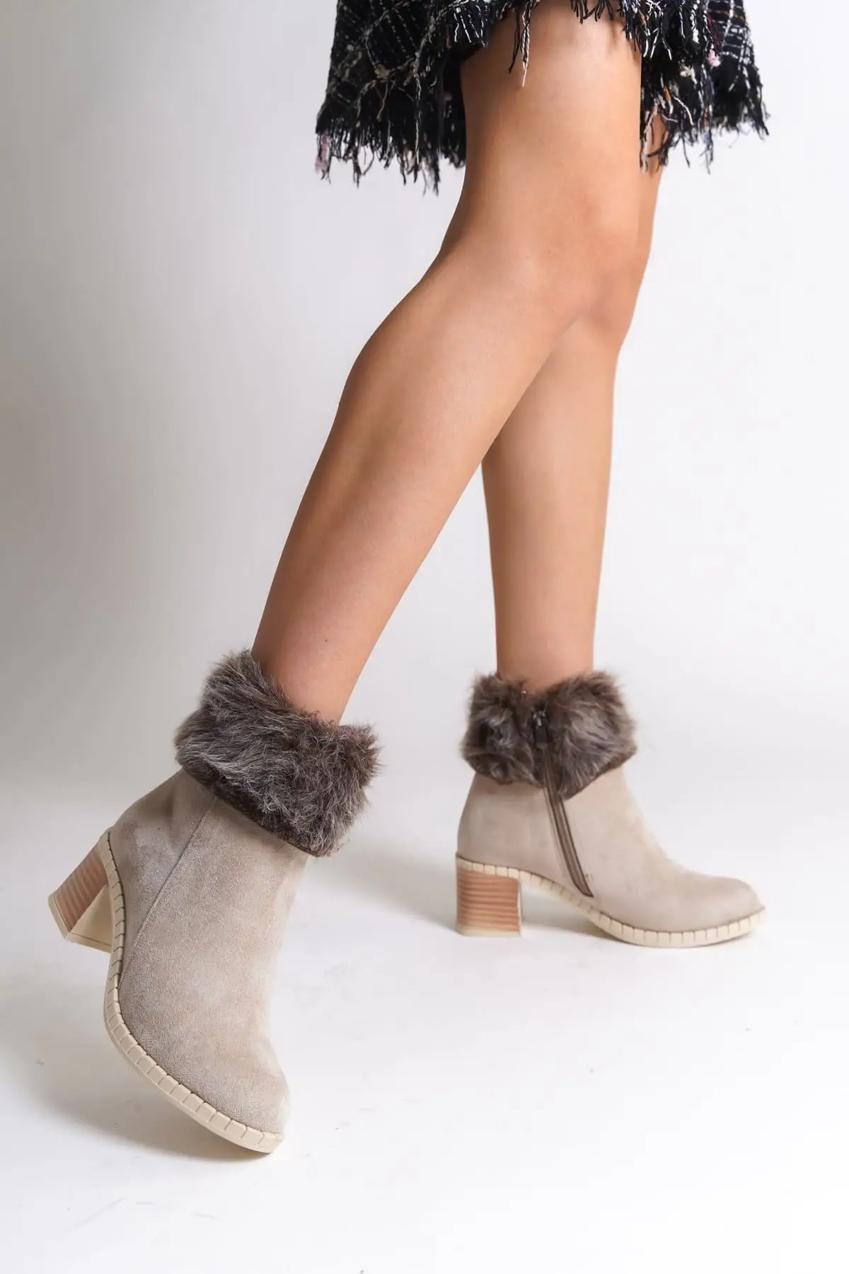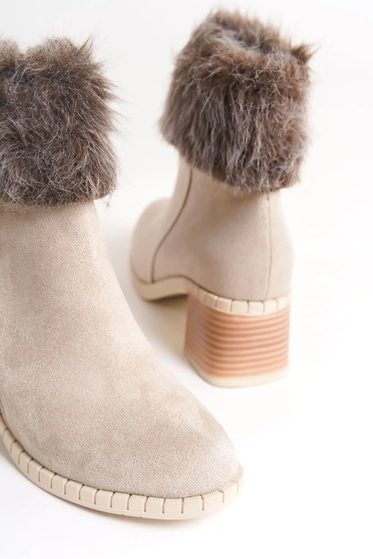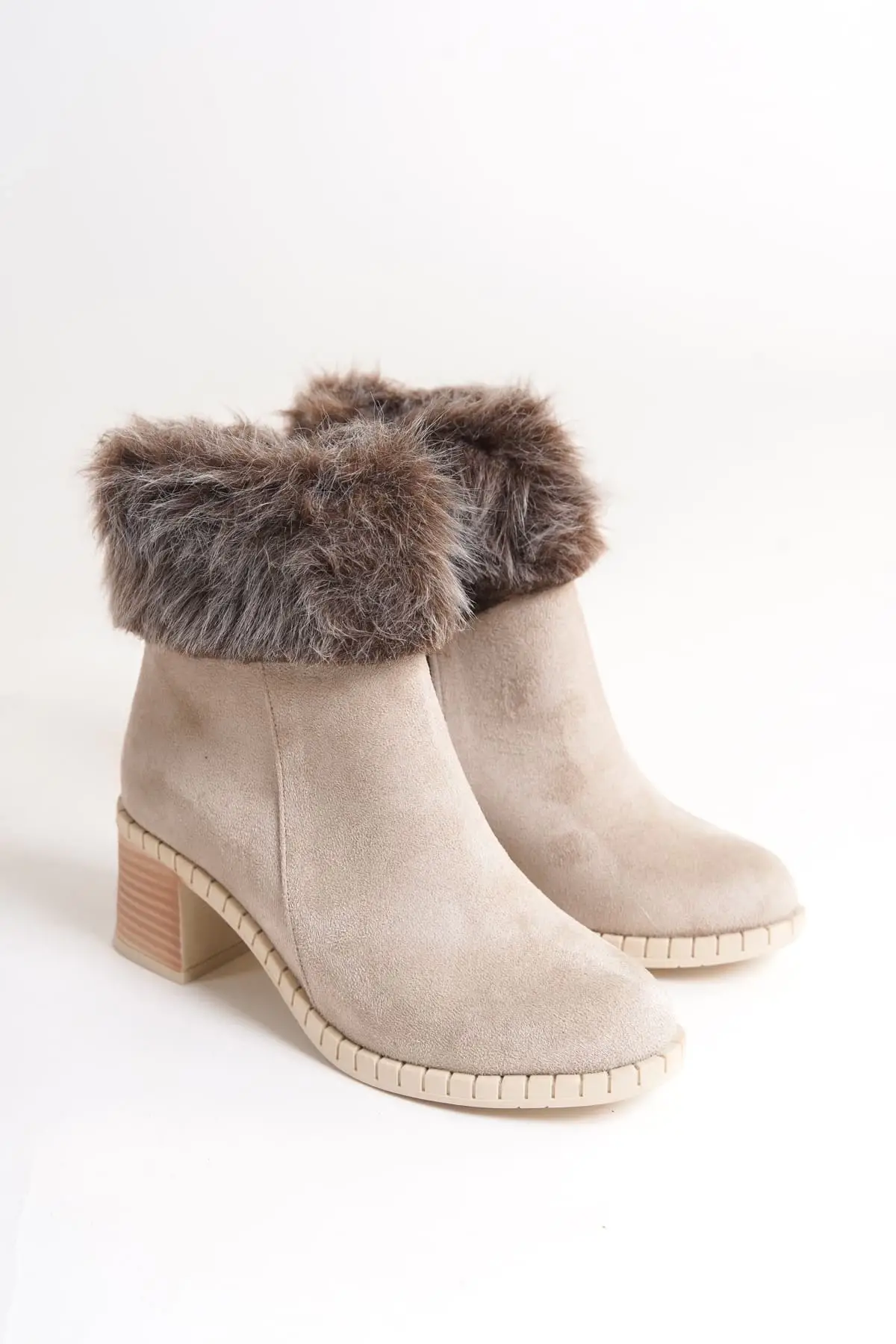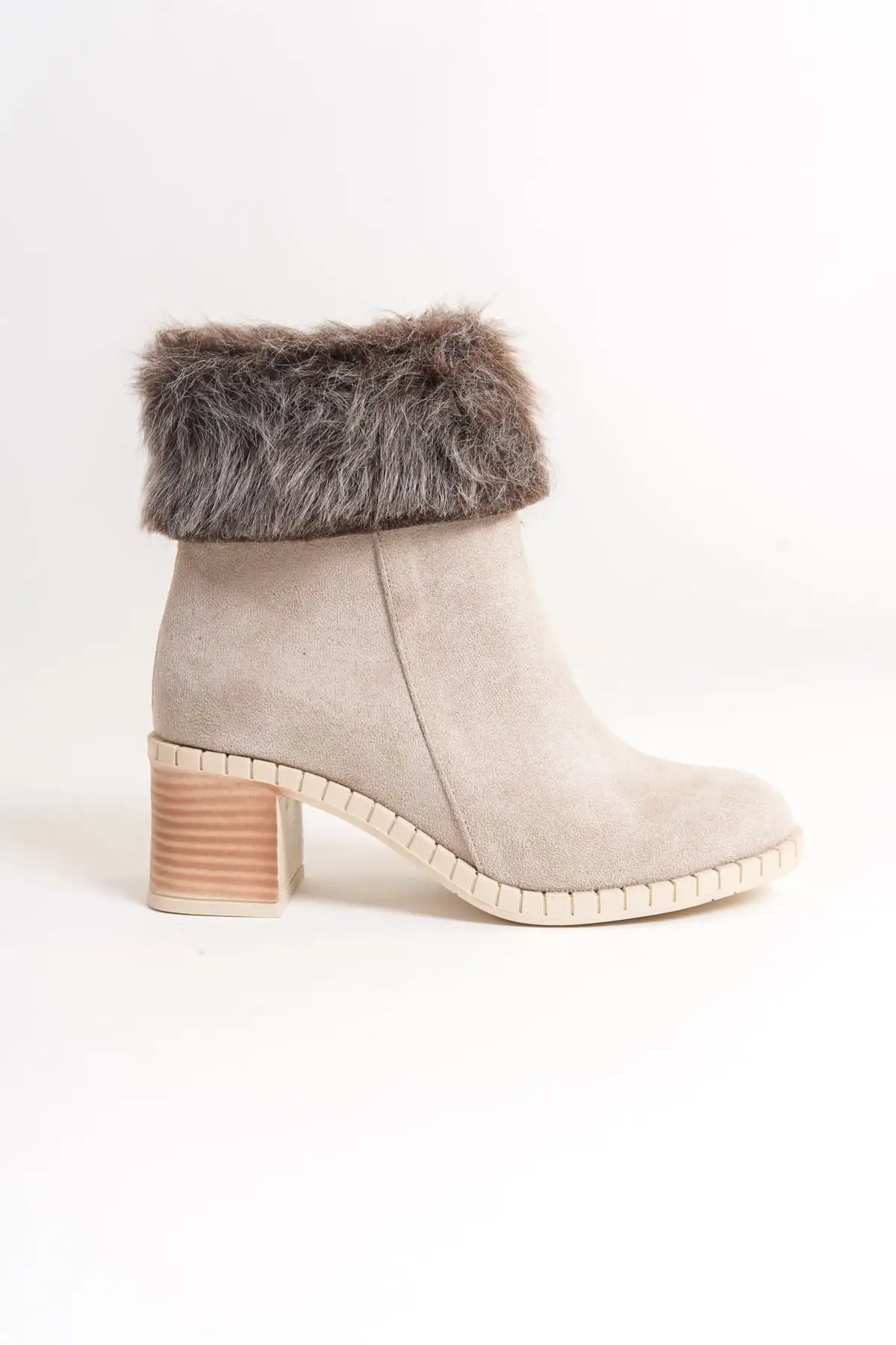 Julıa Fermuarlı Ortopedik Taban Tüylü Topuklu Süet Kadın Bot Kt - Krem