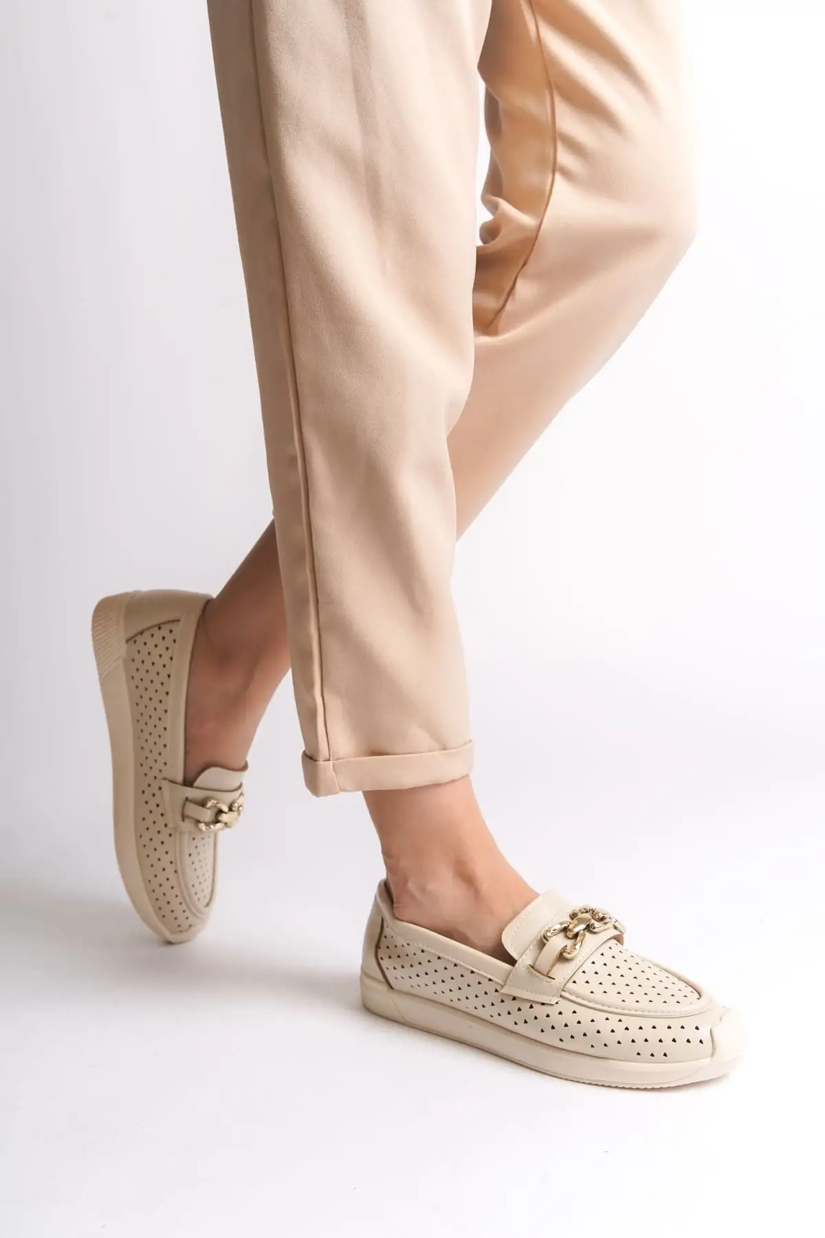 Layla Bağcıksız Ortopedik Rahat Taban Kalp Desenli Kadın Babet Ayakkabı Kt - Krem