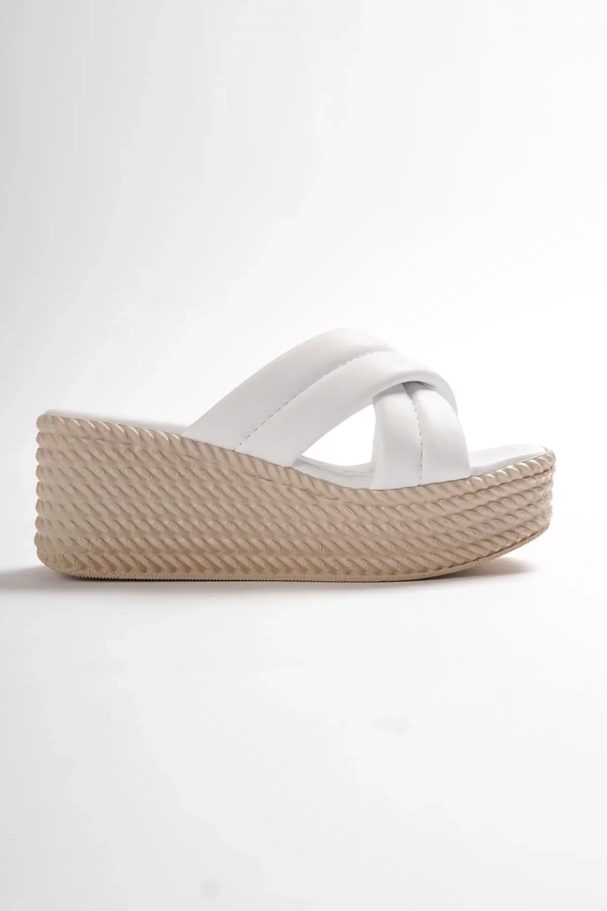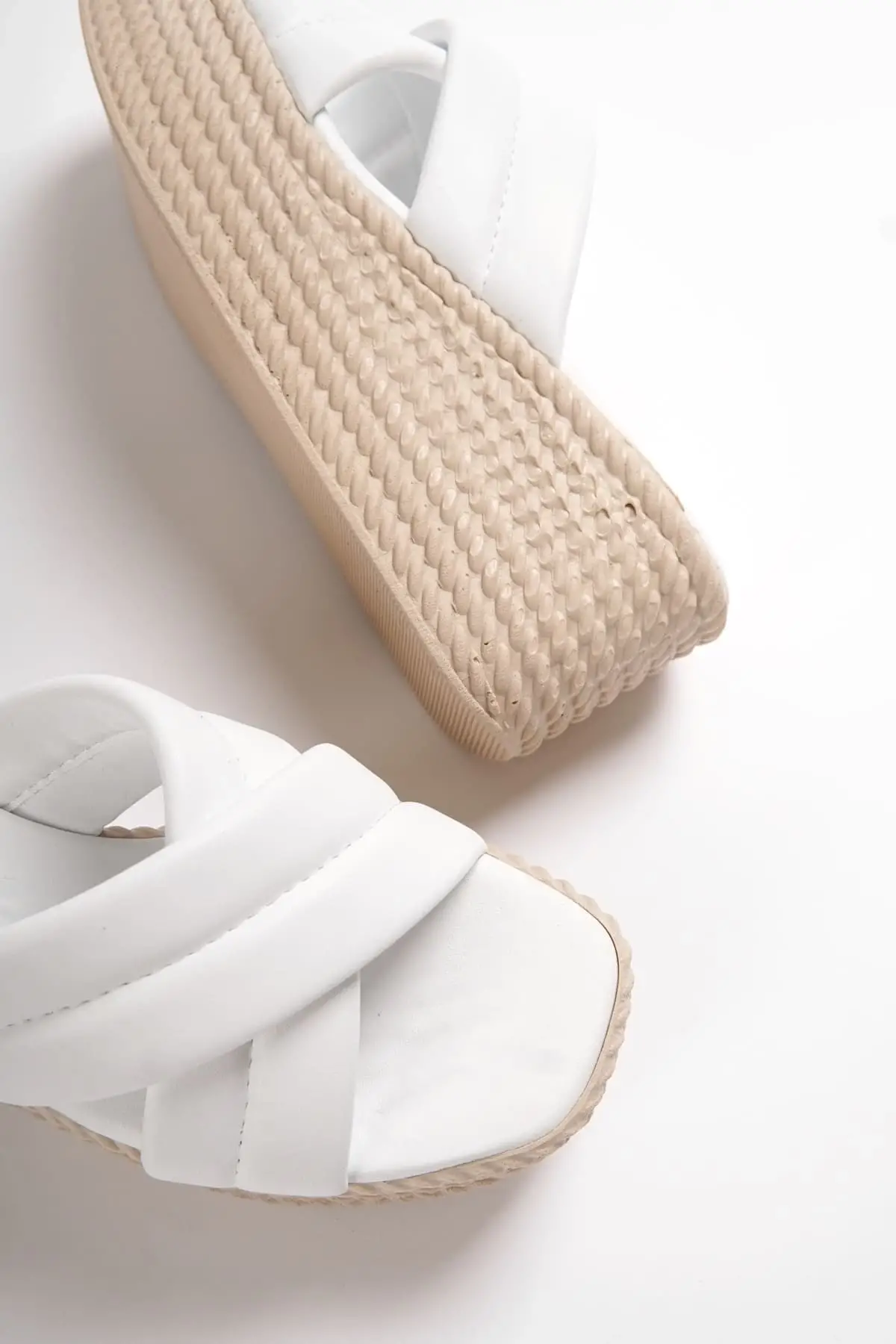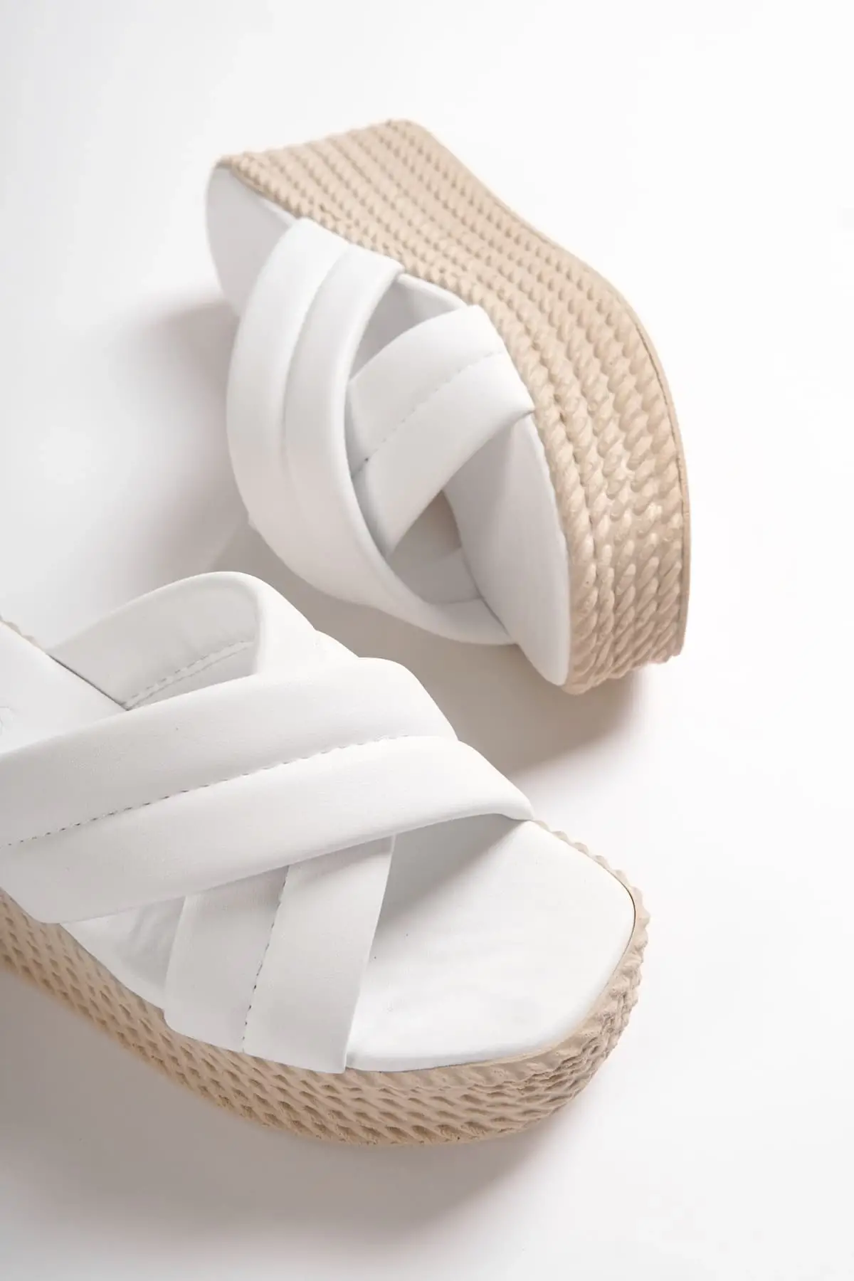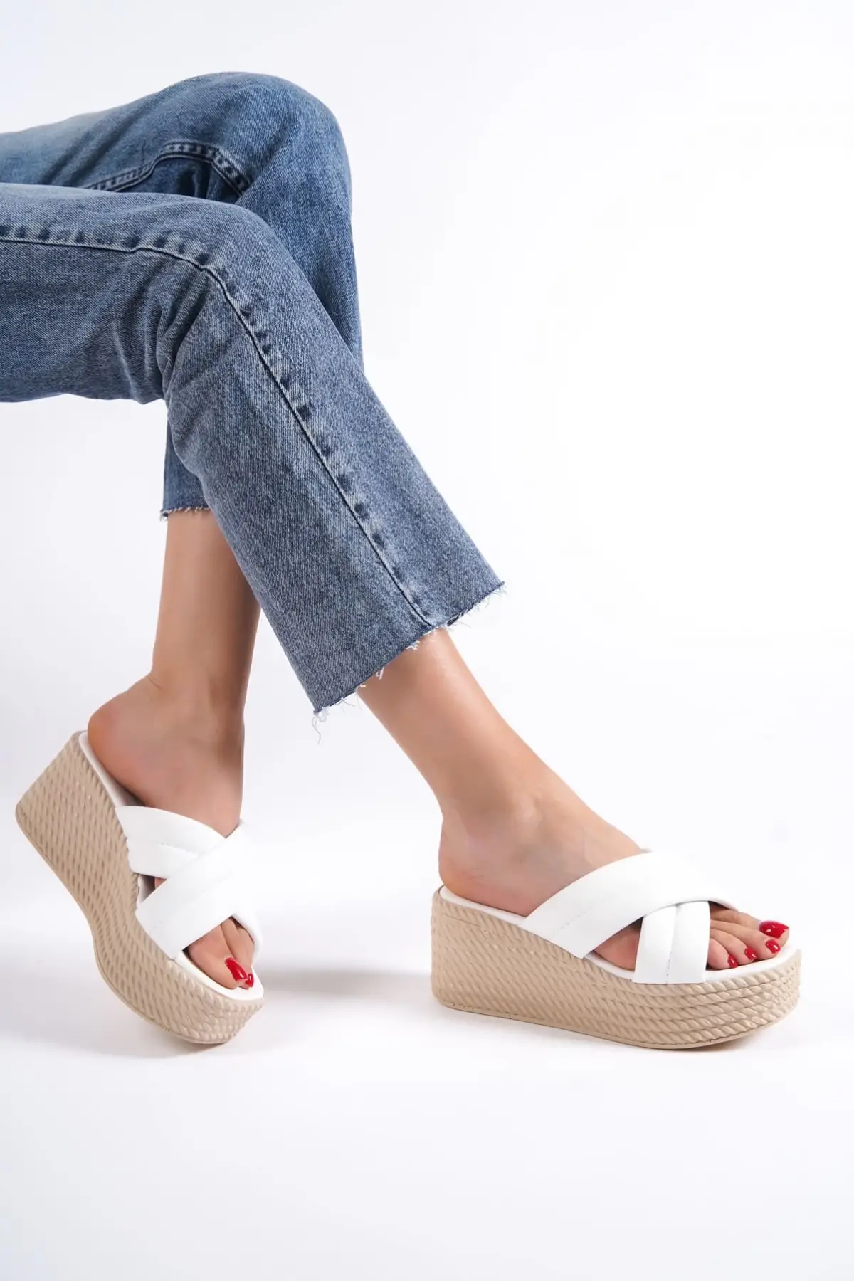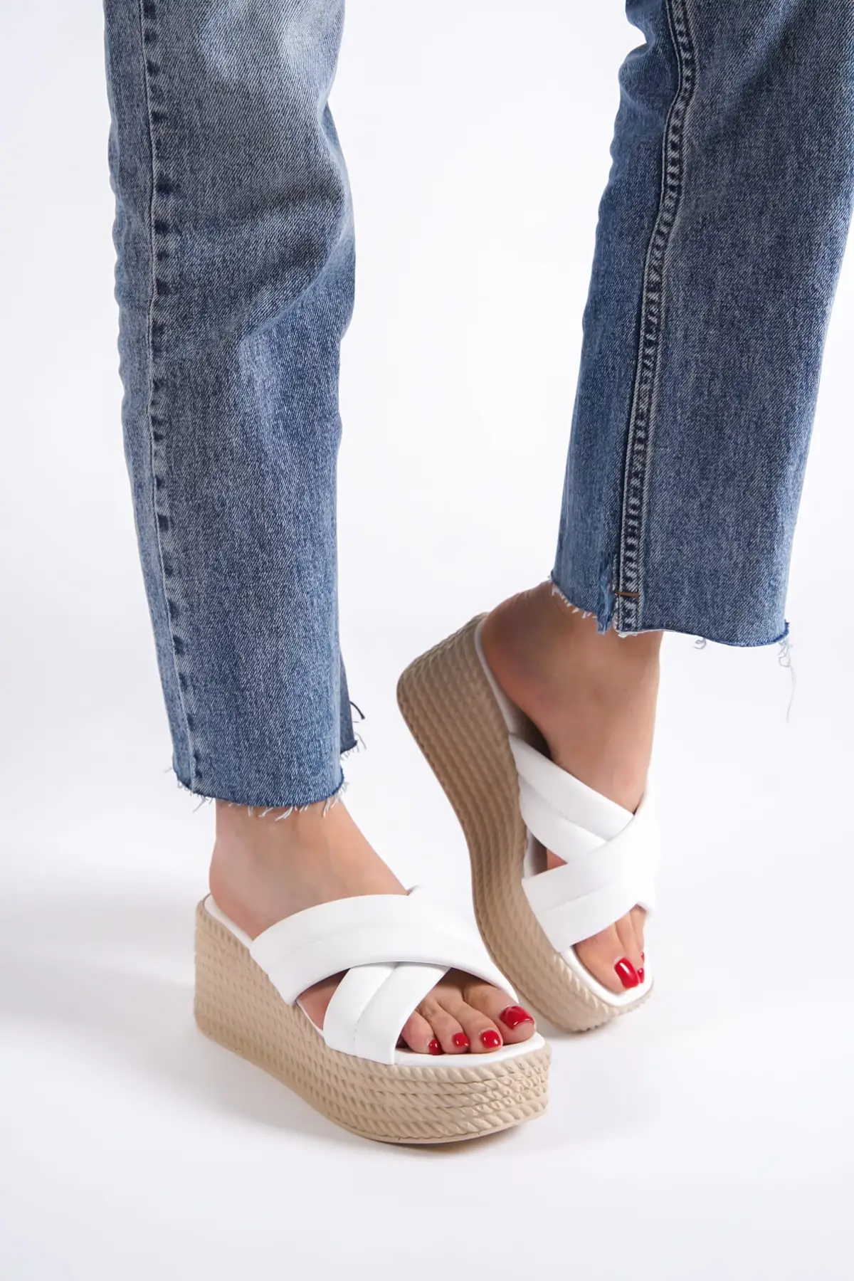 Joymıx Dolgu Topuklu Ortopedik Taban Hasır Görünümlü Kadın Terlik Kt - Beyaz