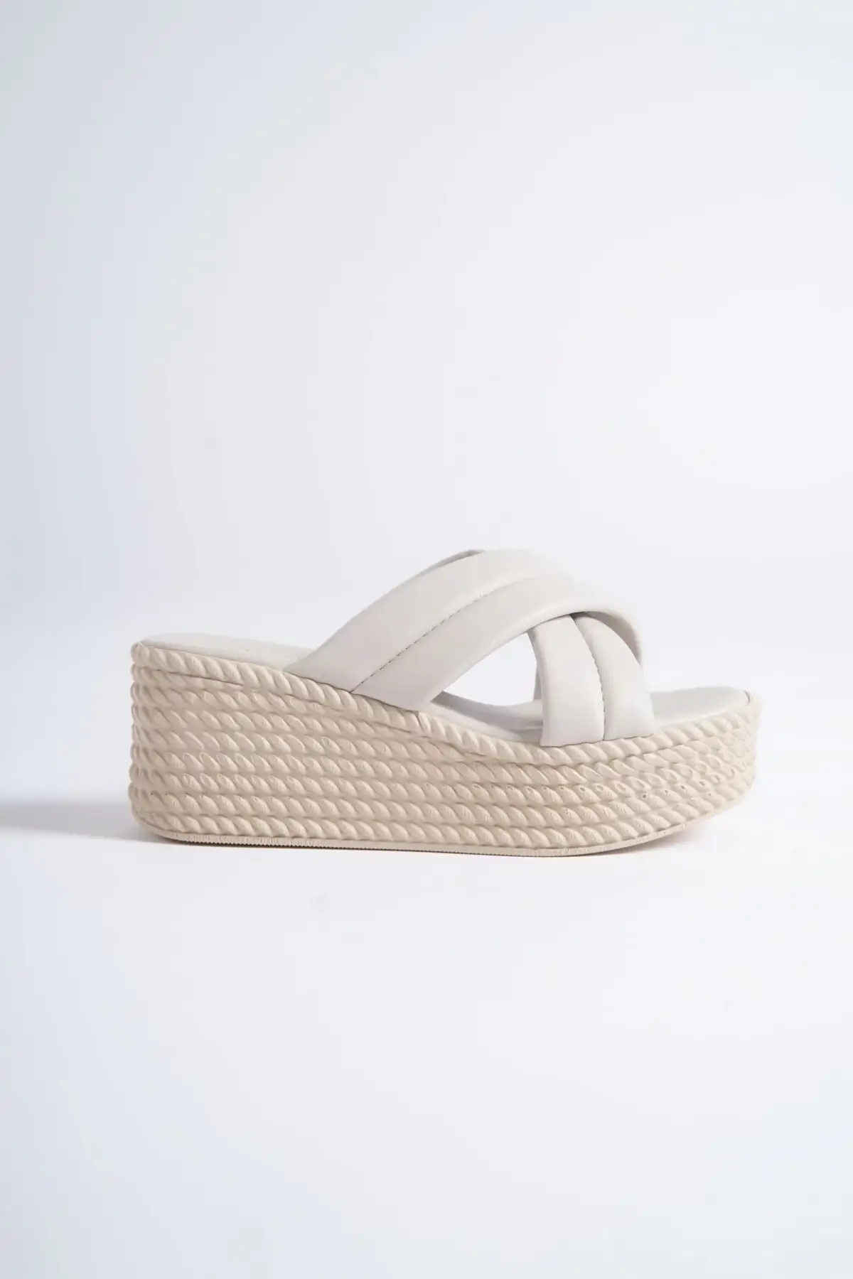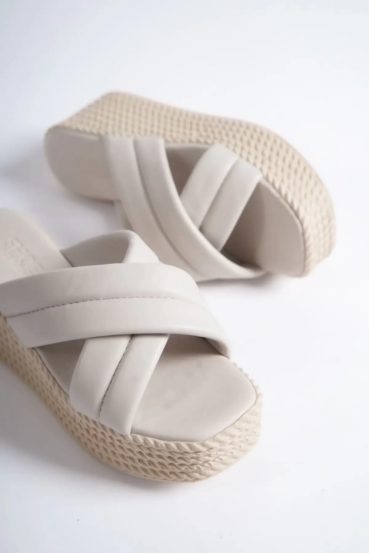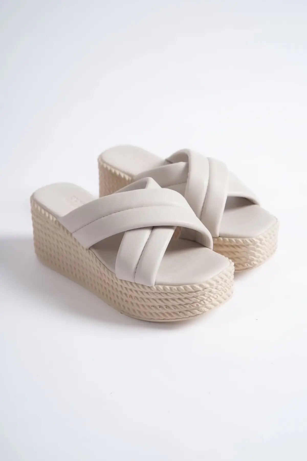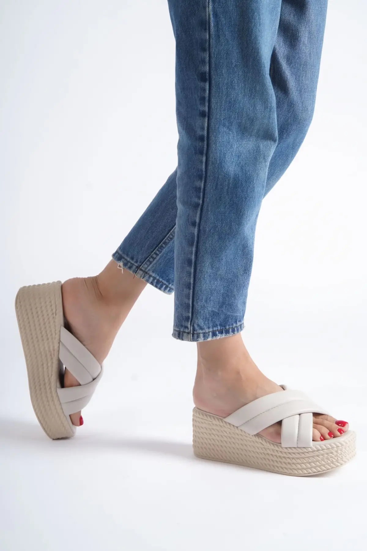 Joymıx Dolgu Topuklu Ortopedik Taban Hasır Görünümlü Kadın Terlik Kt - Krem