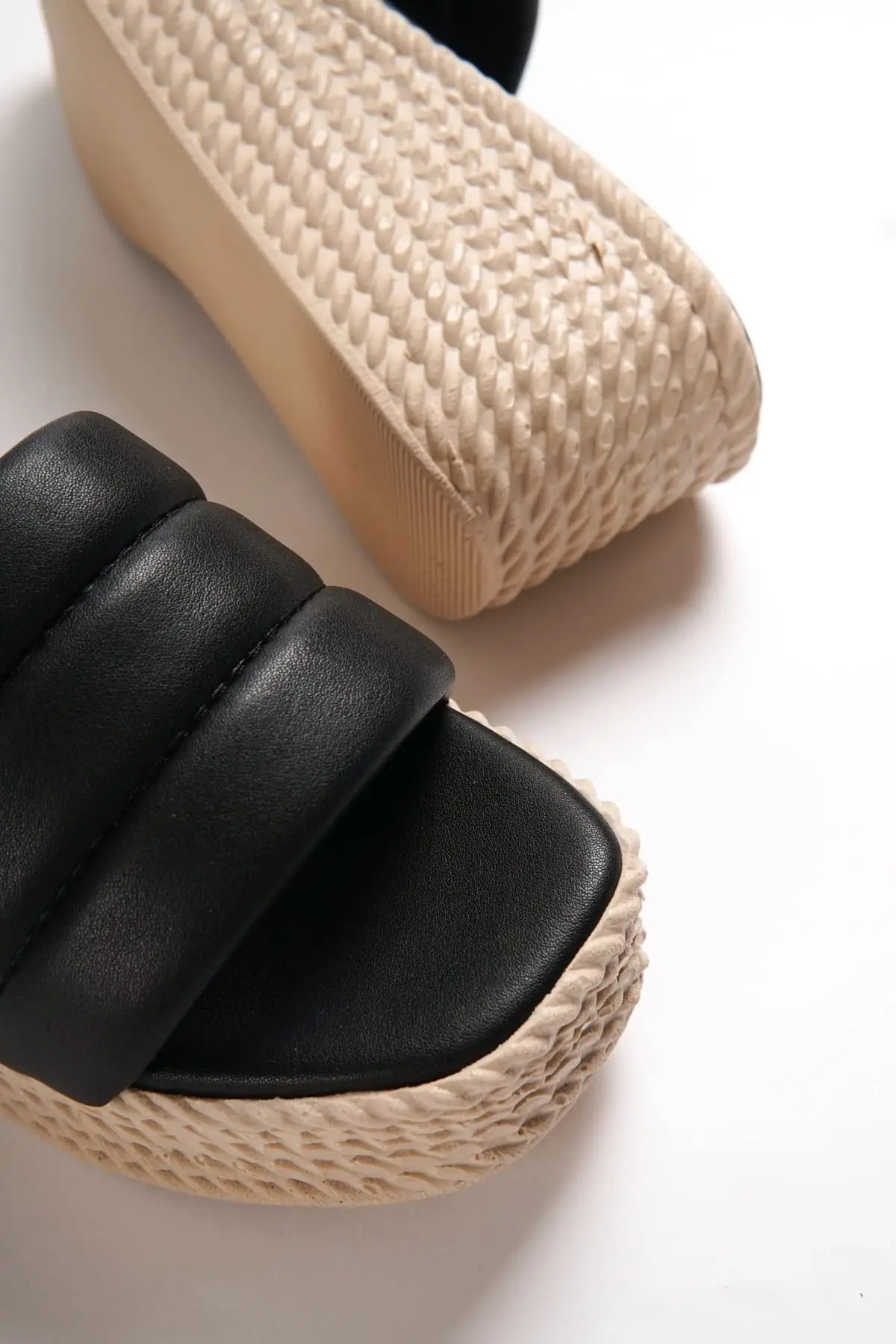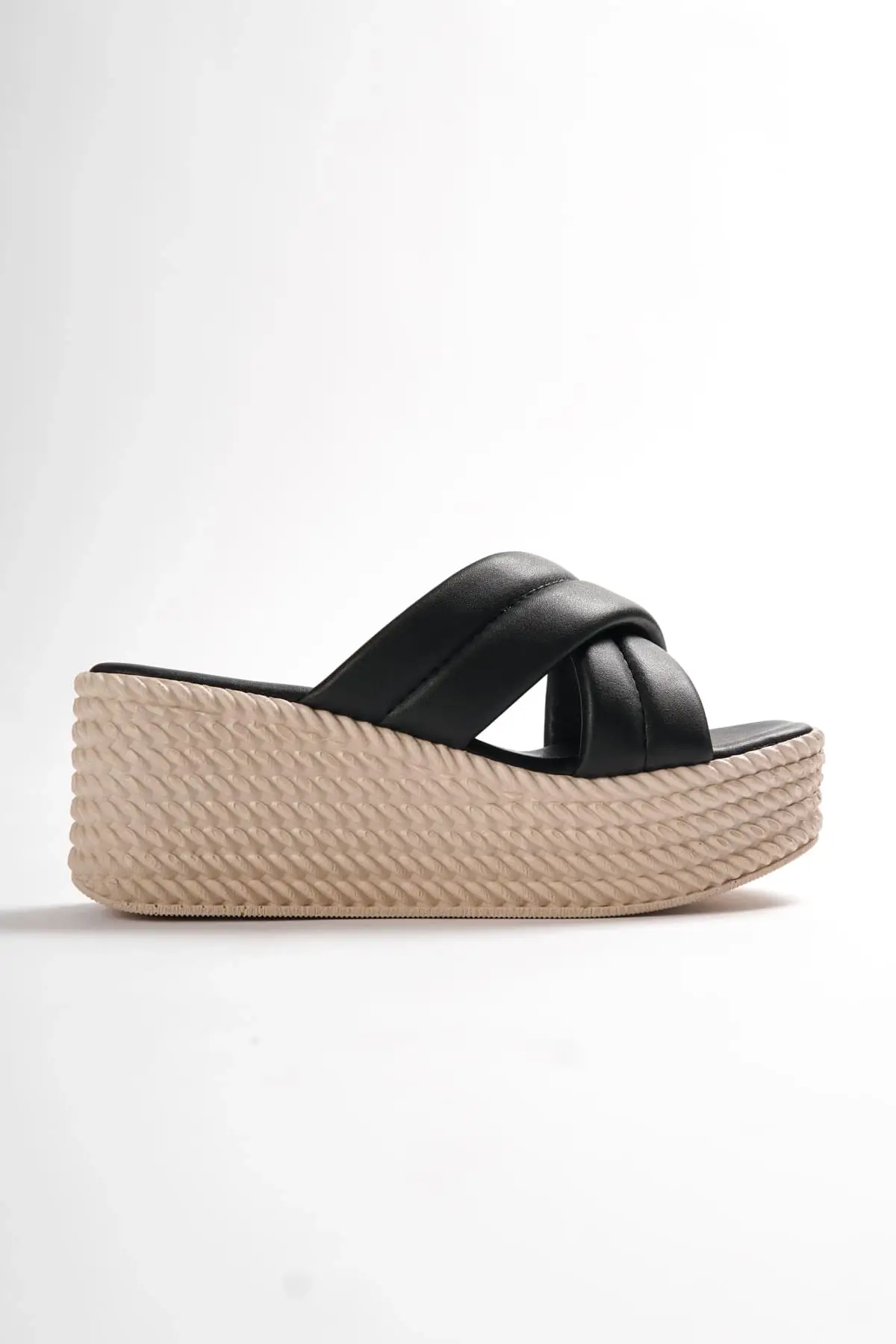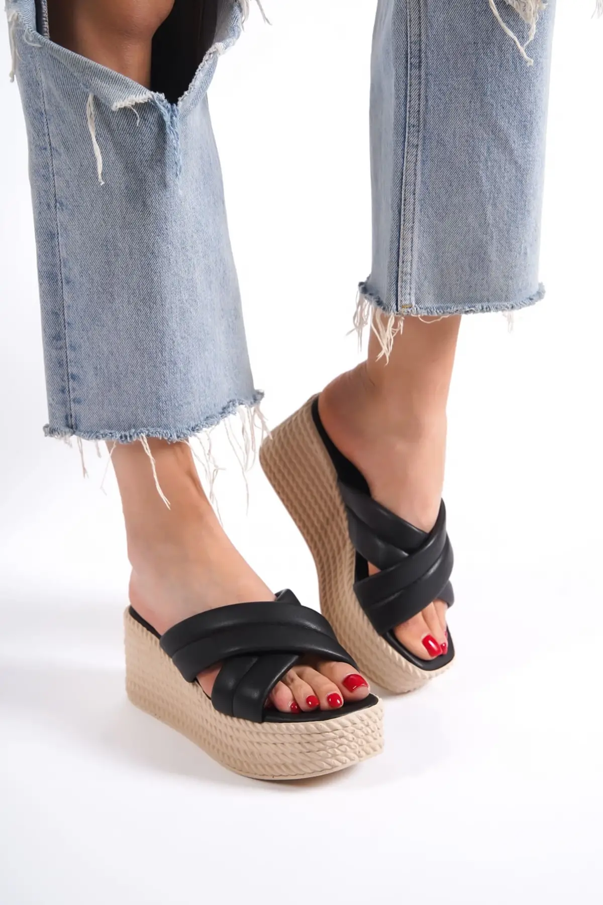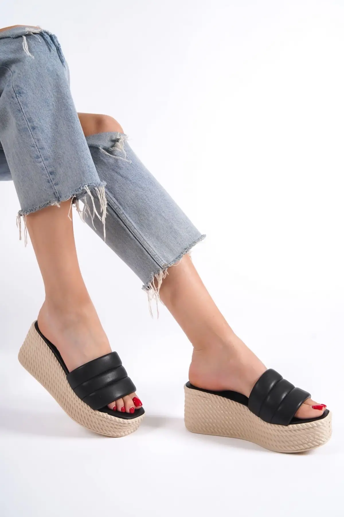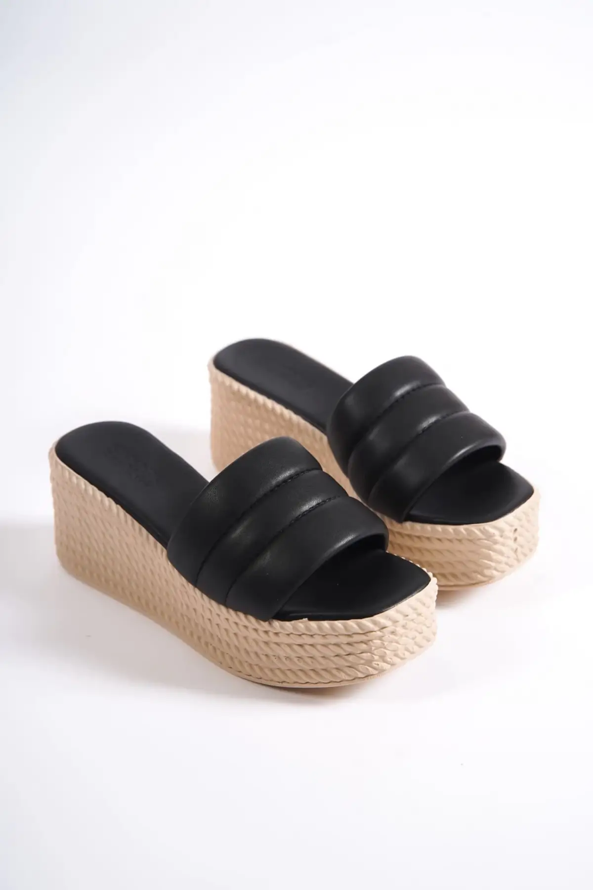 Reına Dolgu Topuklu Ortopedik Taban Hasır Görünümlü Kadın Terlik Kt - Siyah