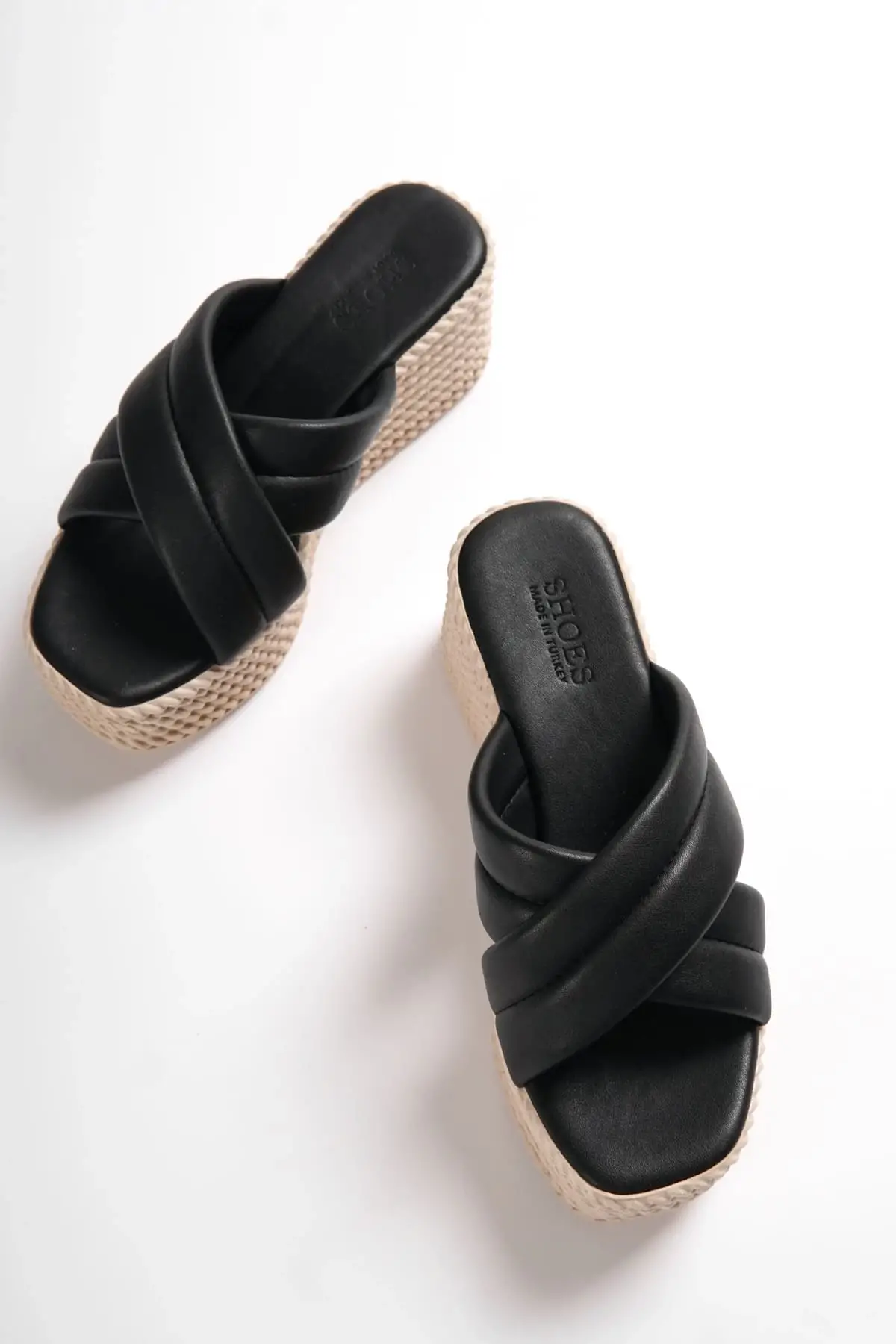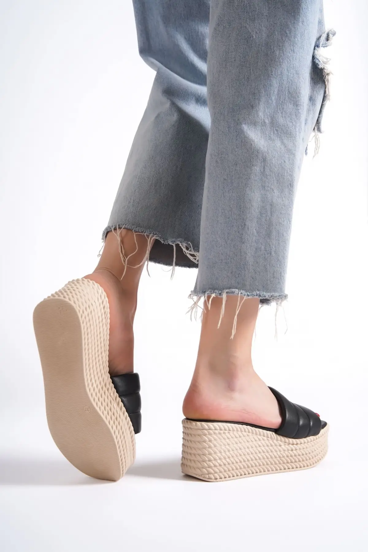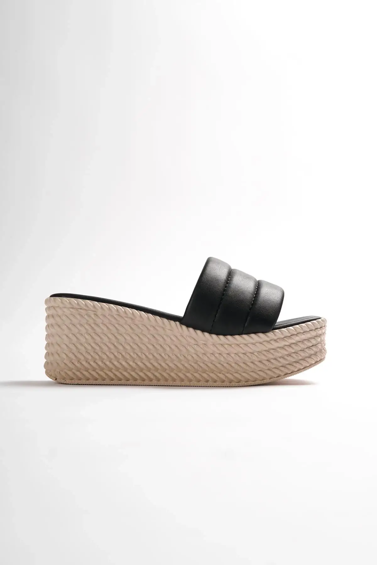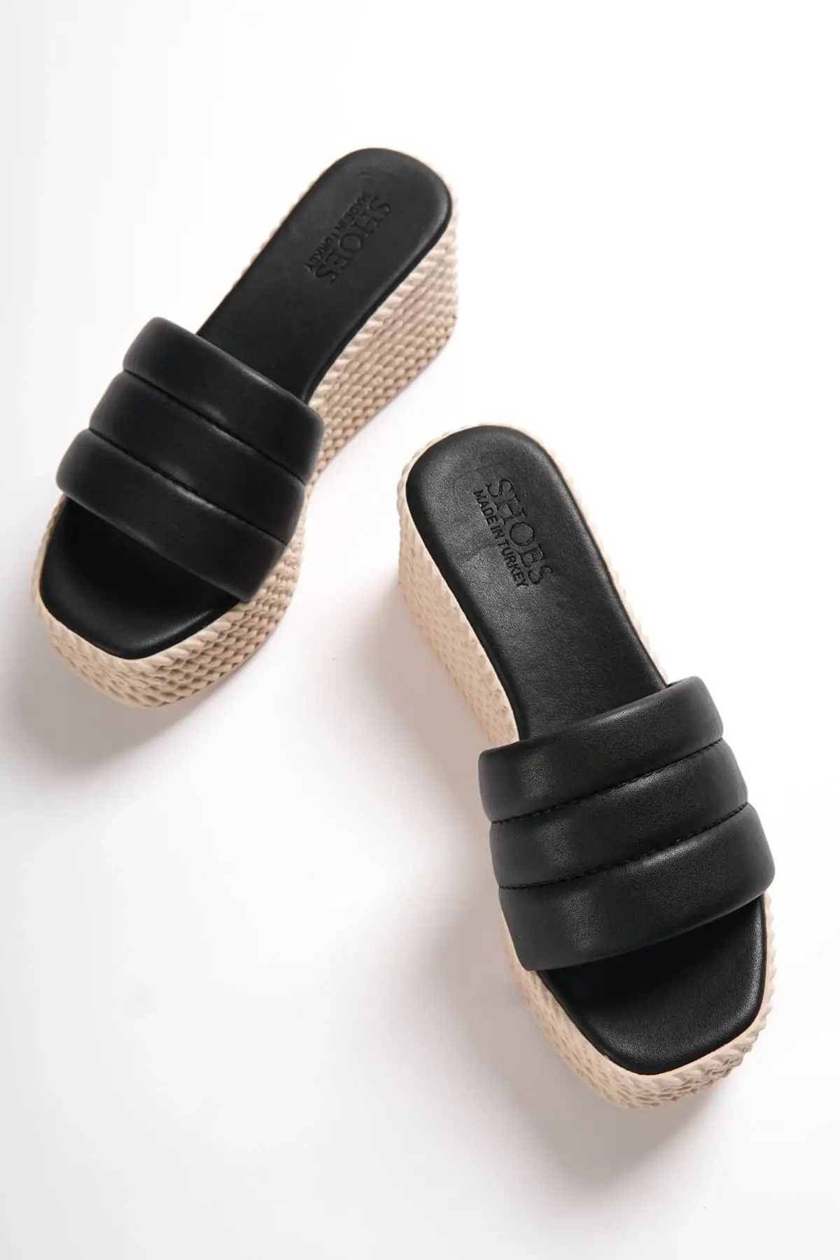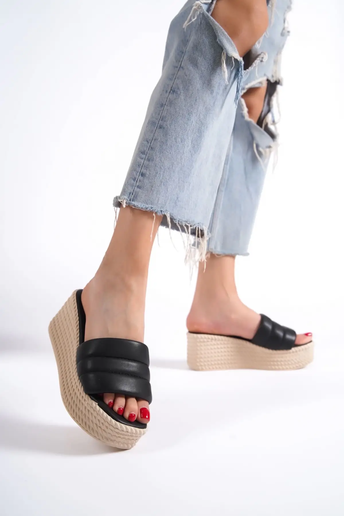 Reına Dolgu Topuklu Ortopedik Taban Hasır Görünümlü Kadın Terlik Kt - Siyah