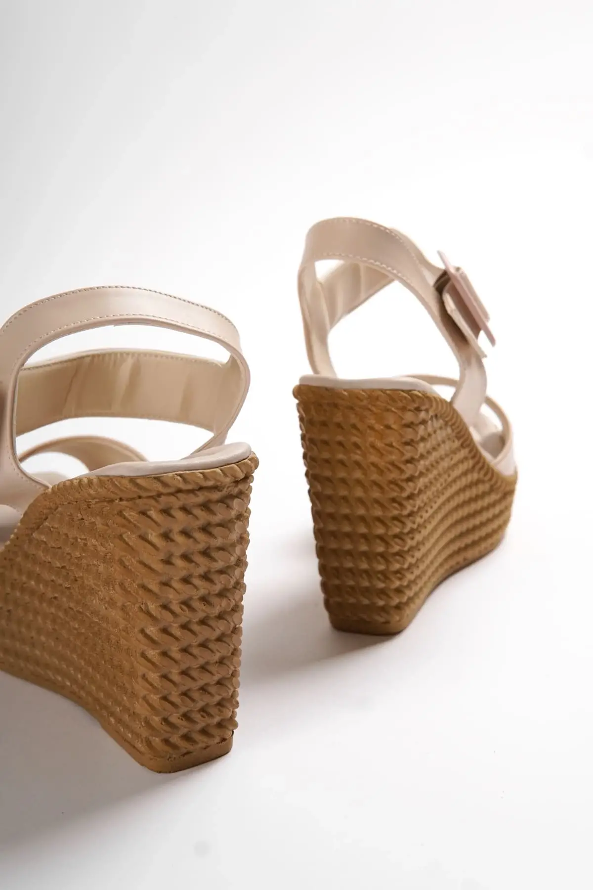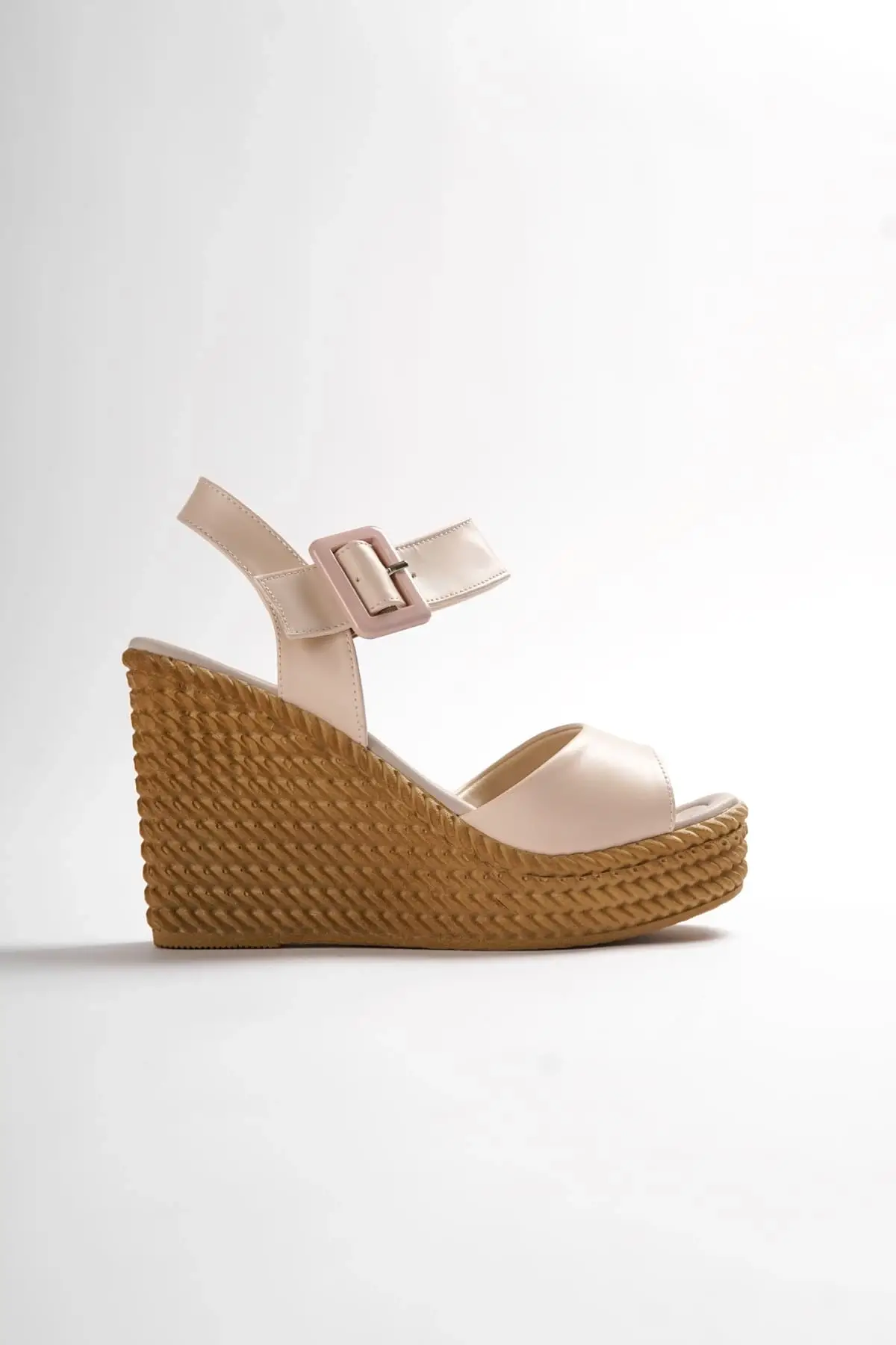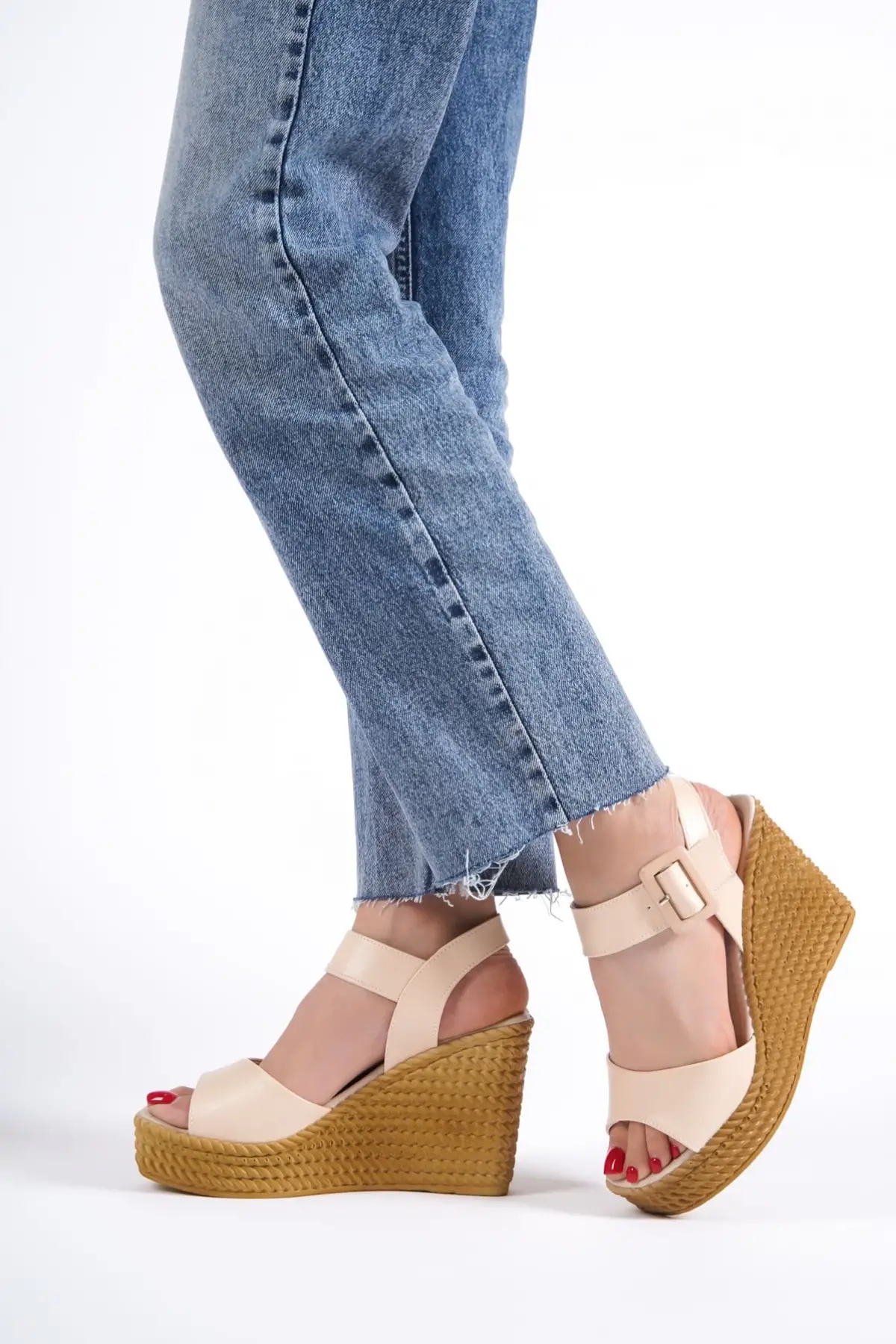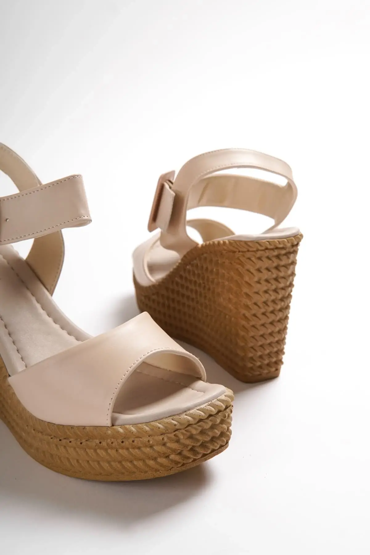 Perla Tokalı Lastikli Dolgu Topuklu Ortopedik Taban Hasır Görünümlü Kadın Sandalet Kt - Ten
