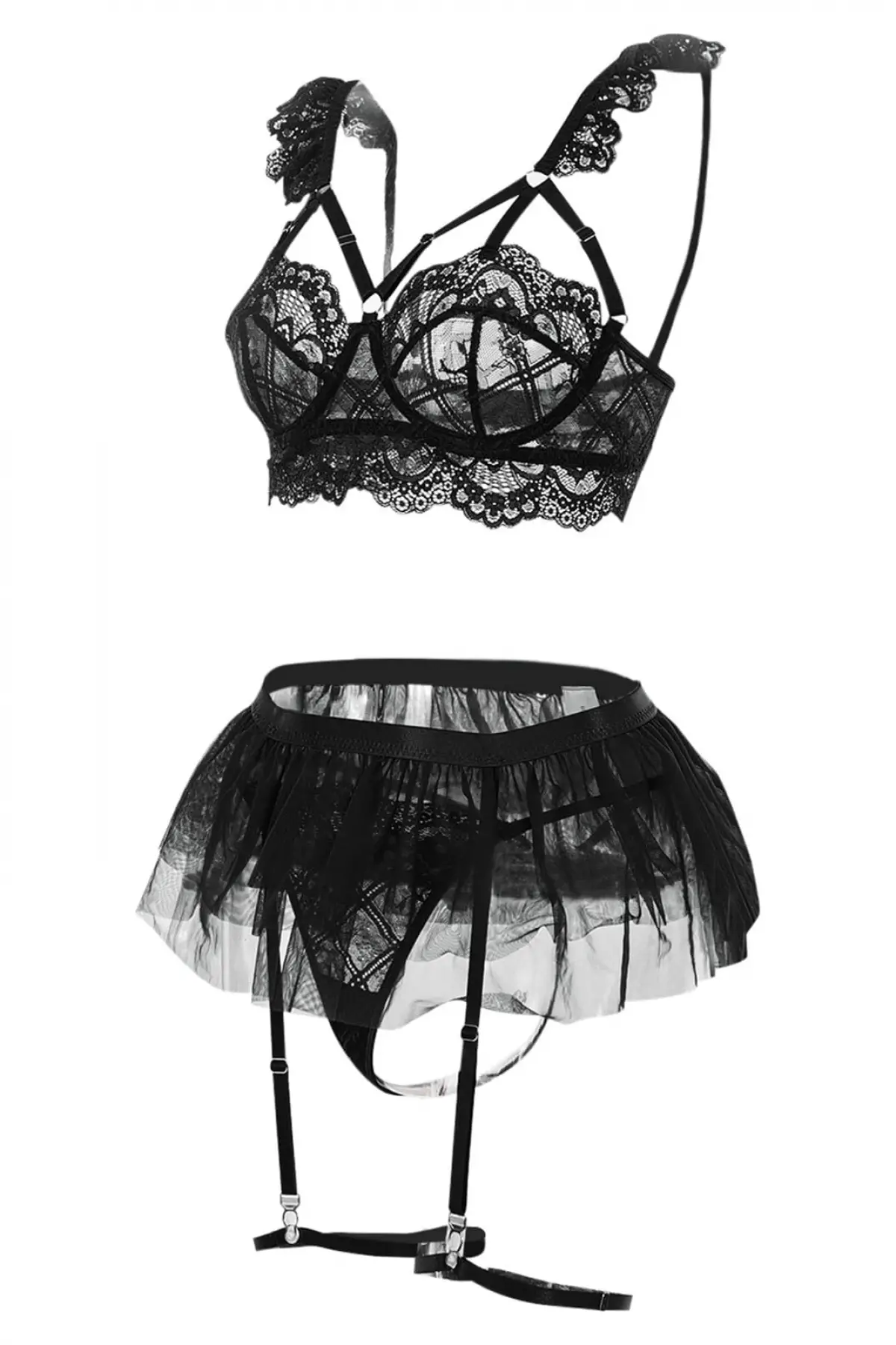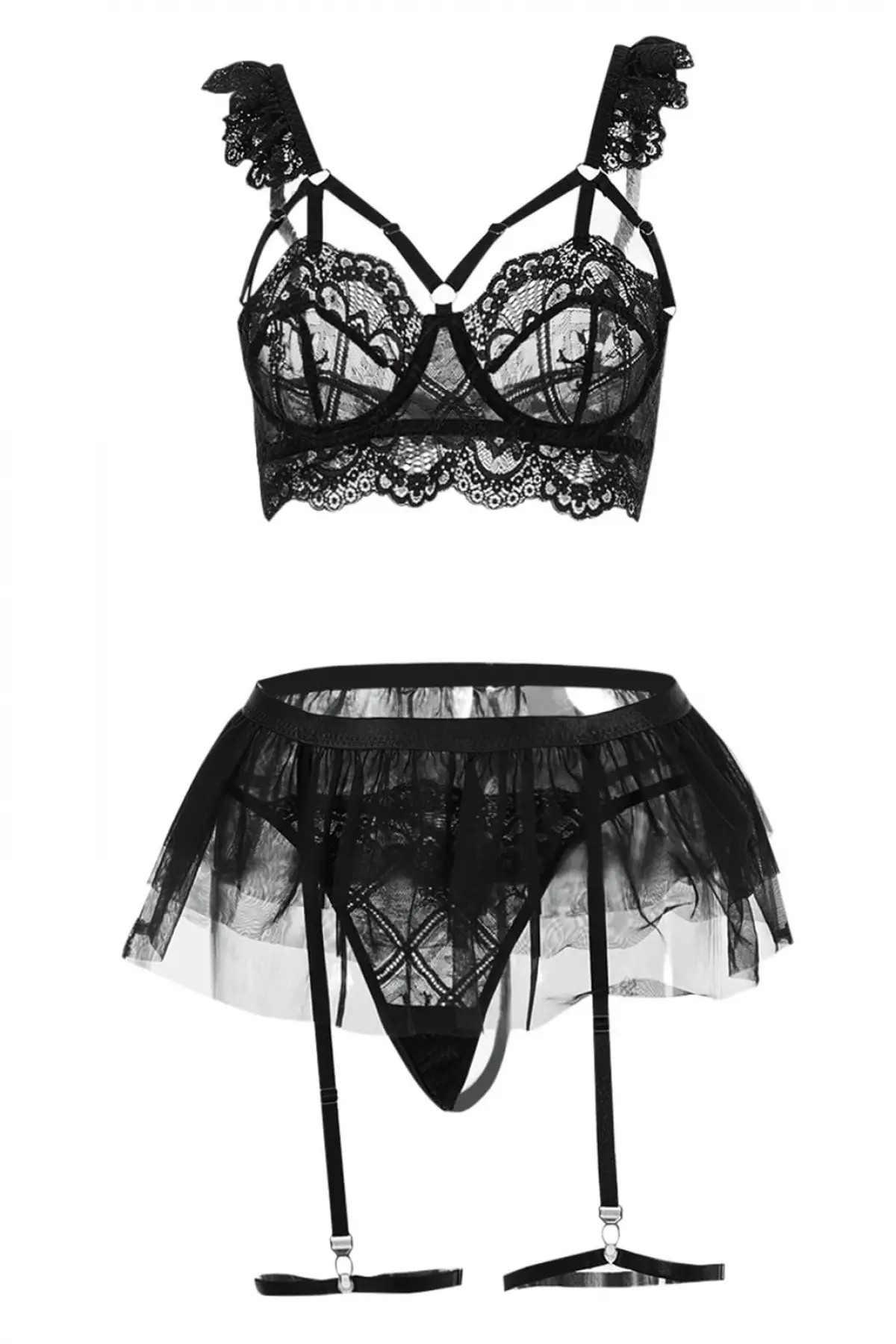 Siyah Göğüs Balenli, Tül Etekli,bel Şeritli Seksi Jartiyer Takım