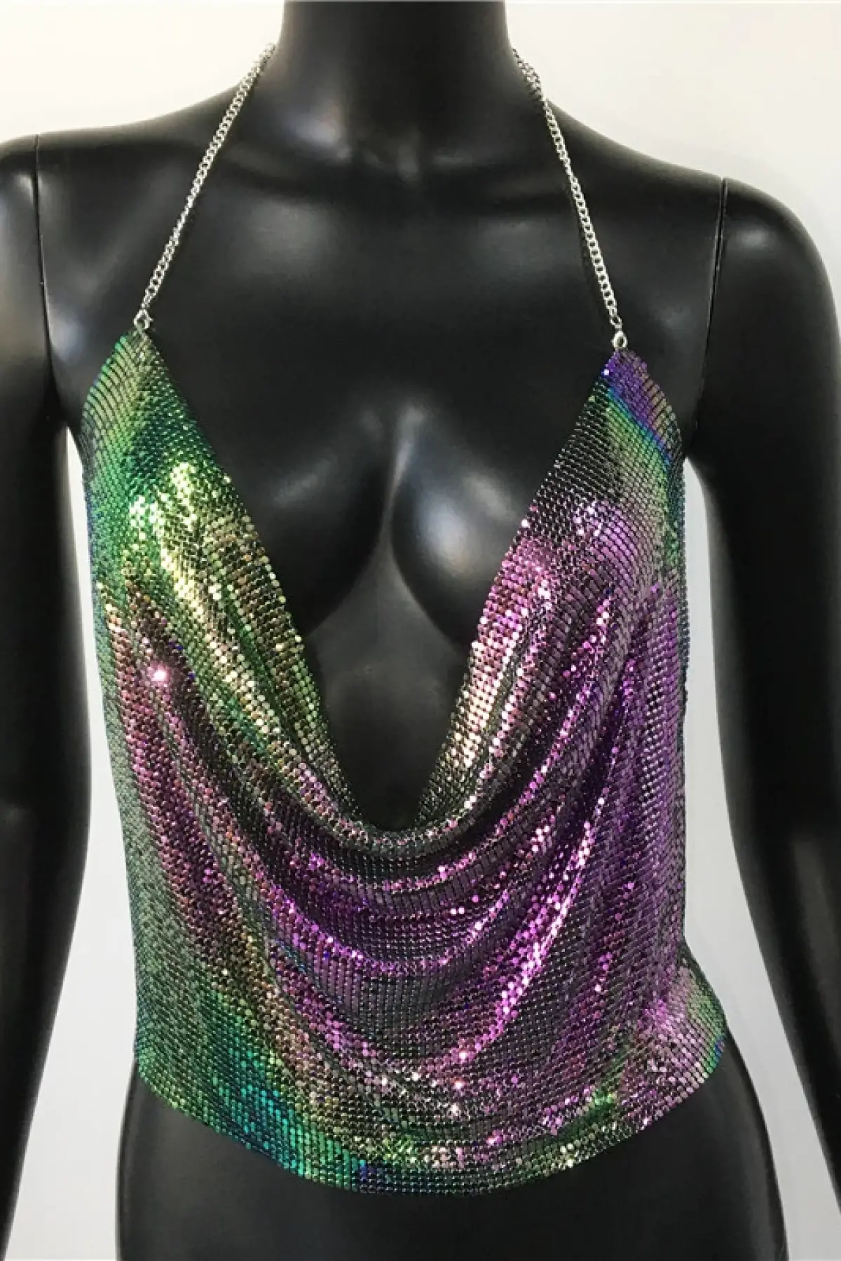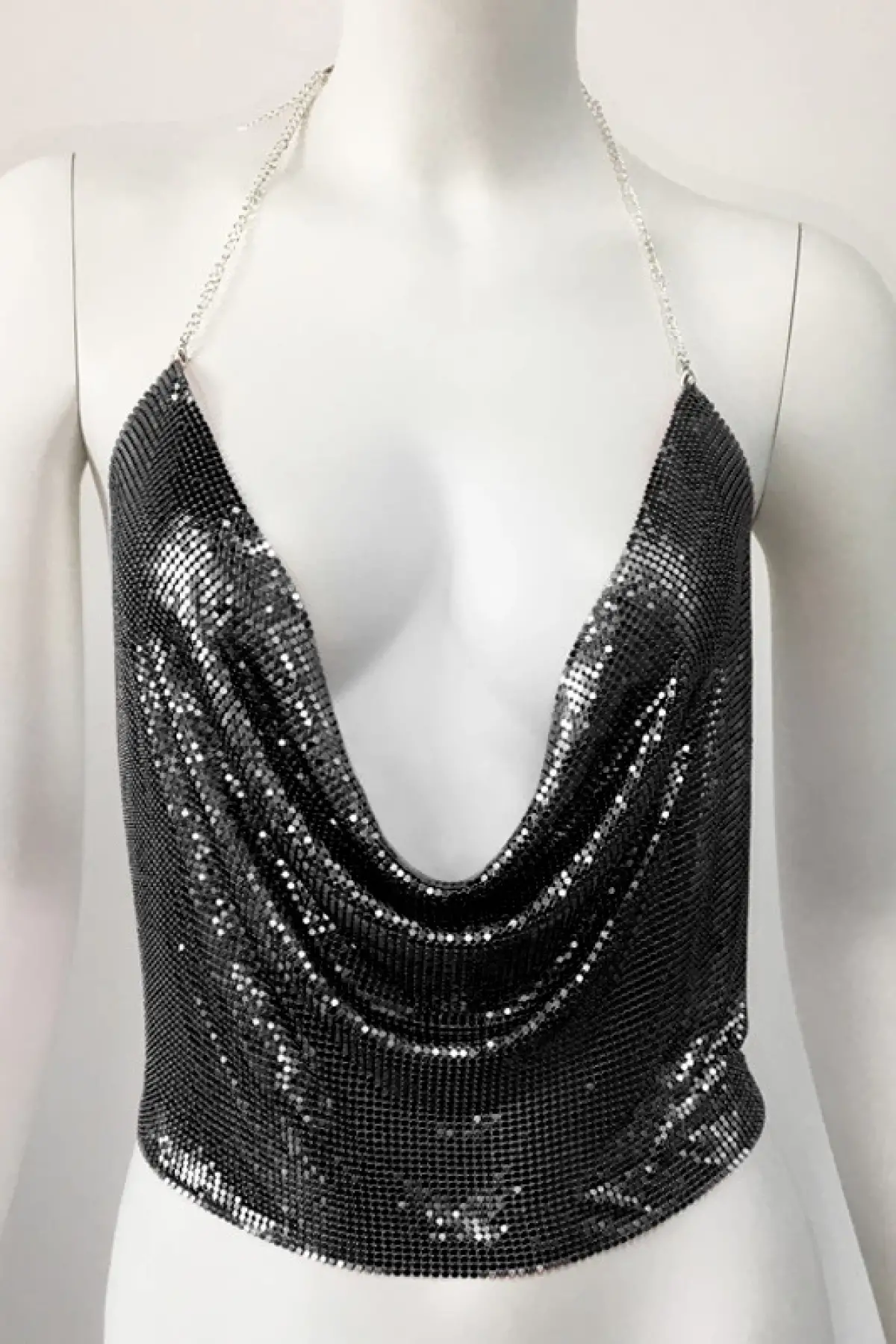 Parlak Gümüş Crop & Bluz Kolsuz Kayık Yaka Zırh Büstiyer