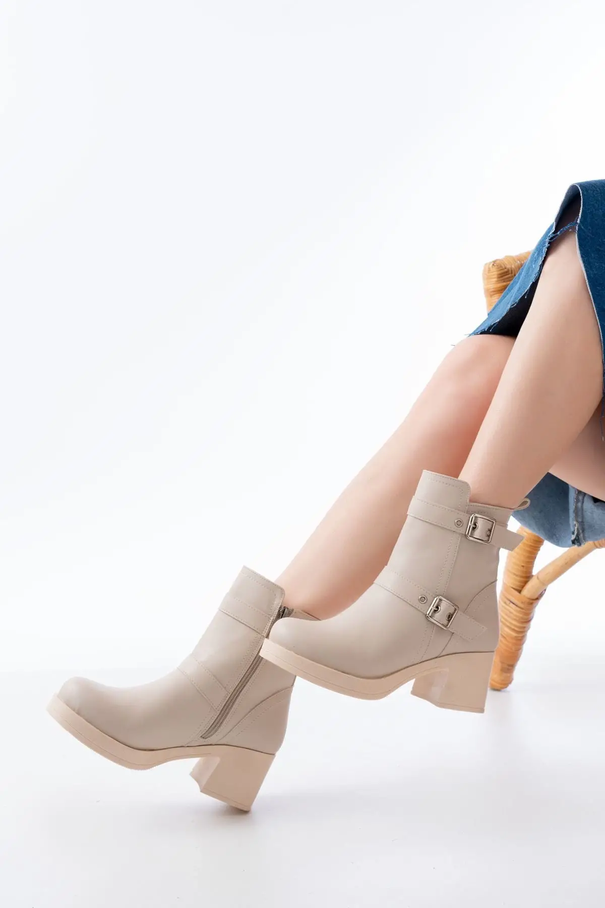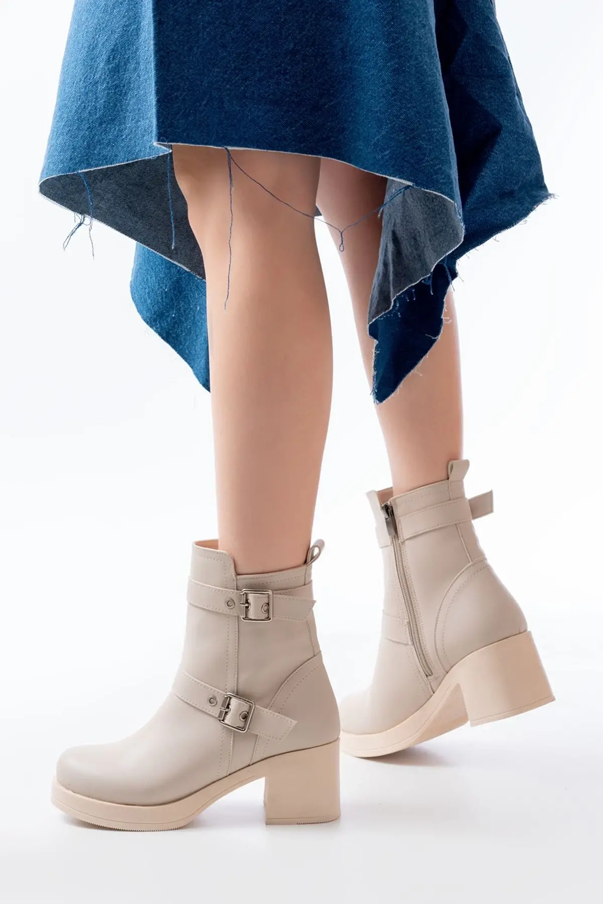 5109-3027 Bej Topuklu Fermuarlı Günlük Kadın Bot