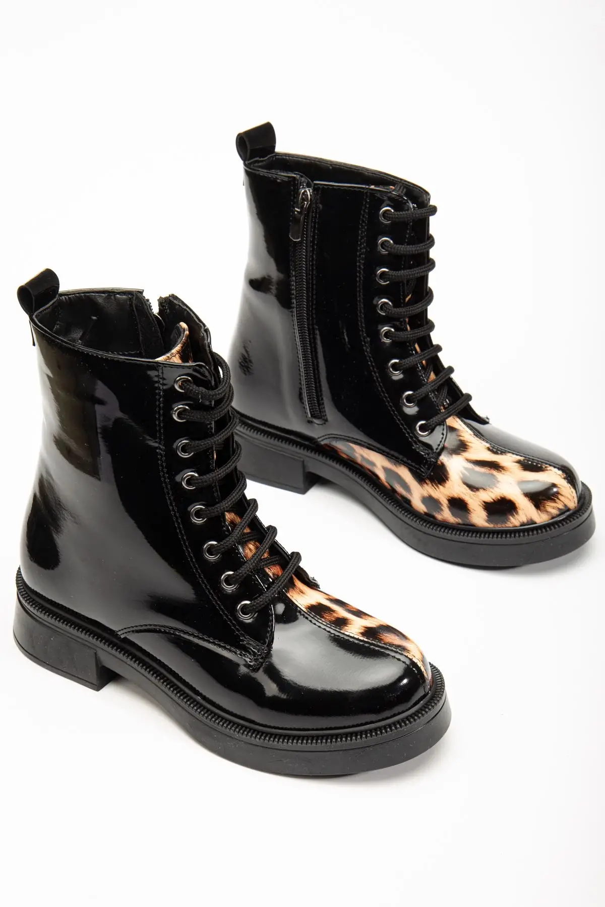 Siyah Rugan Leopar Bağcıklı Fermuarlı Günlük Kadın Bot