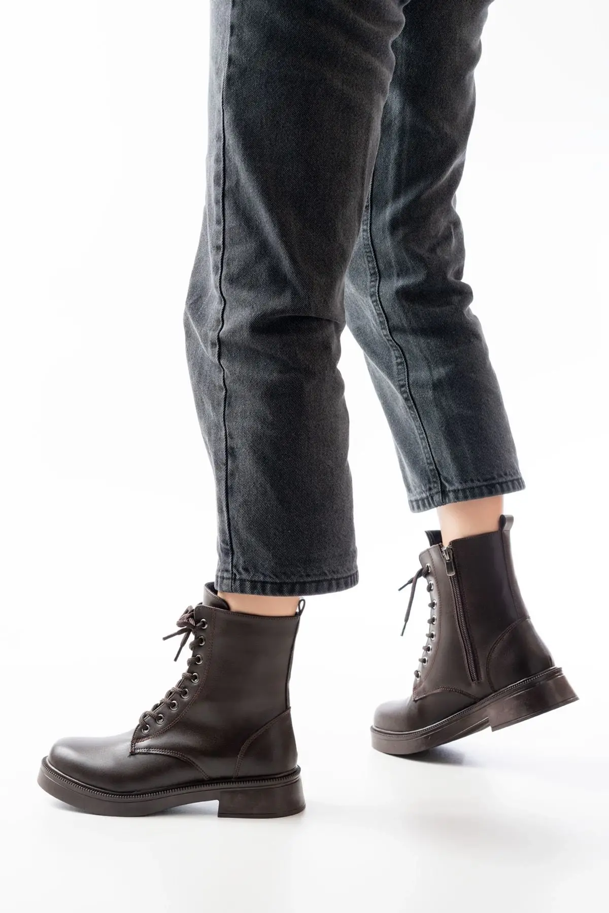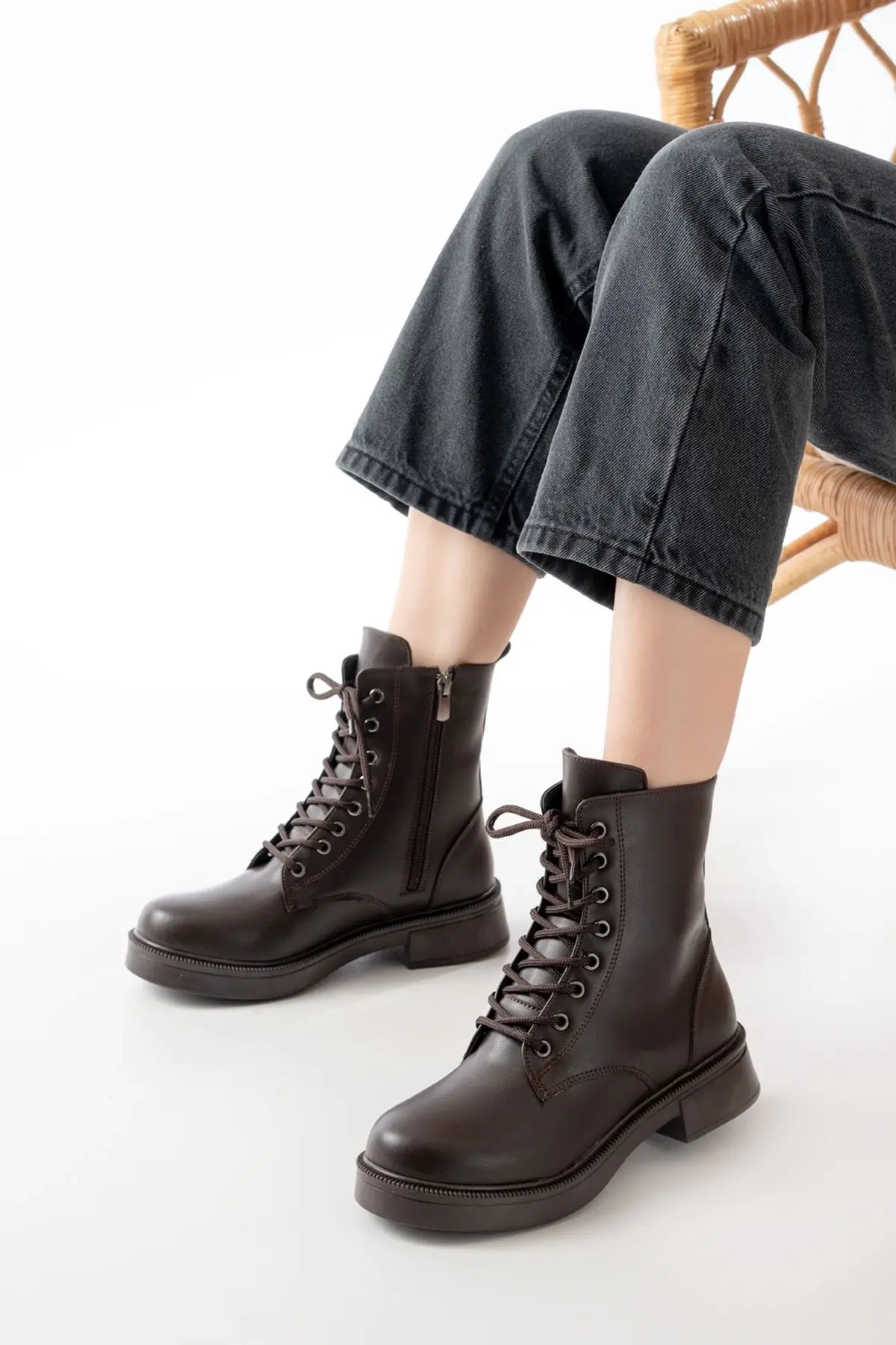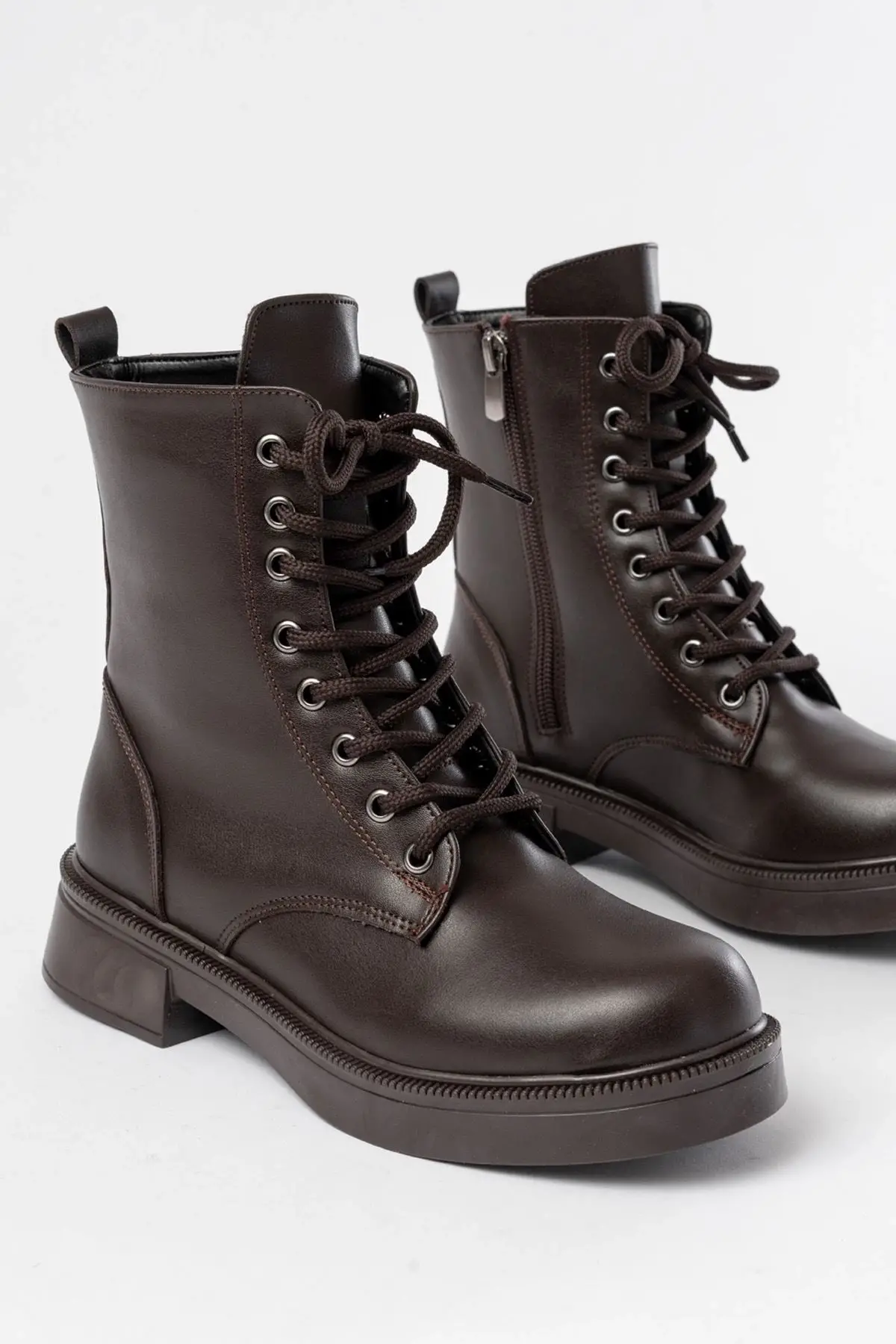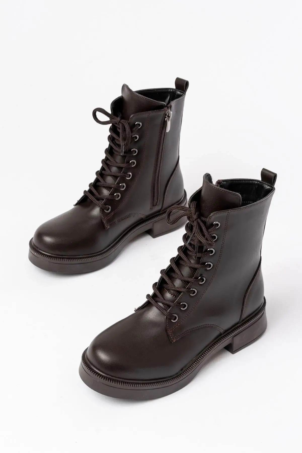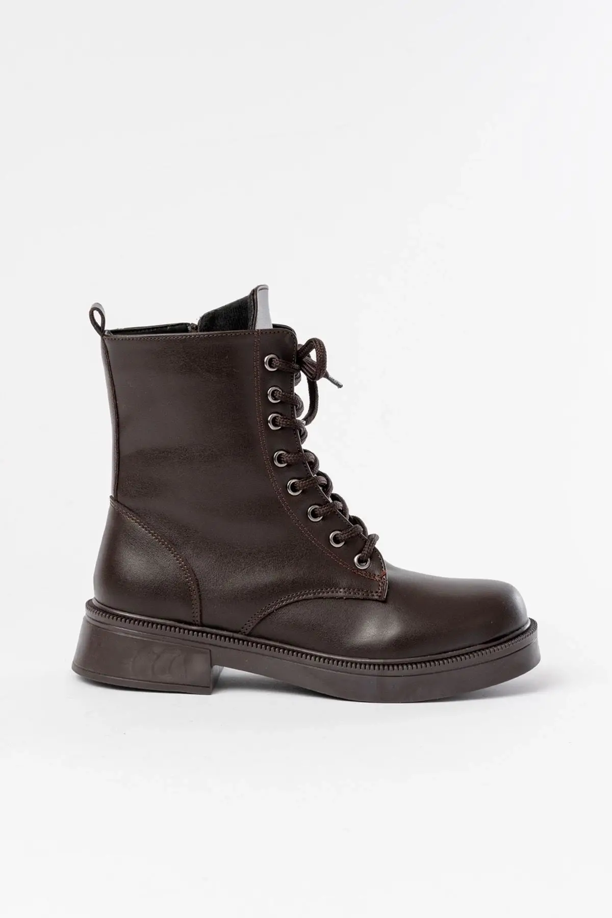 Kahve Düz Topuklu Bağcıklı Fermuarlı Günlük Kadın Bot