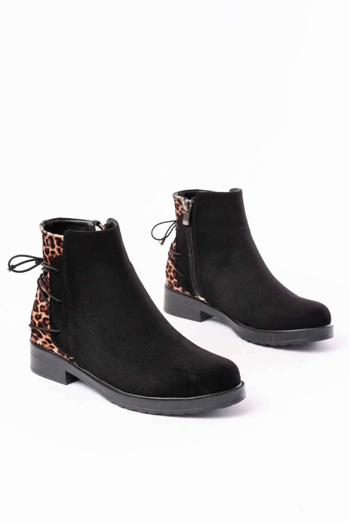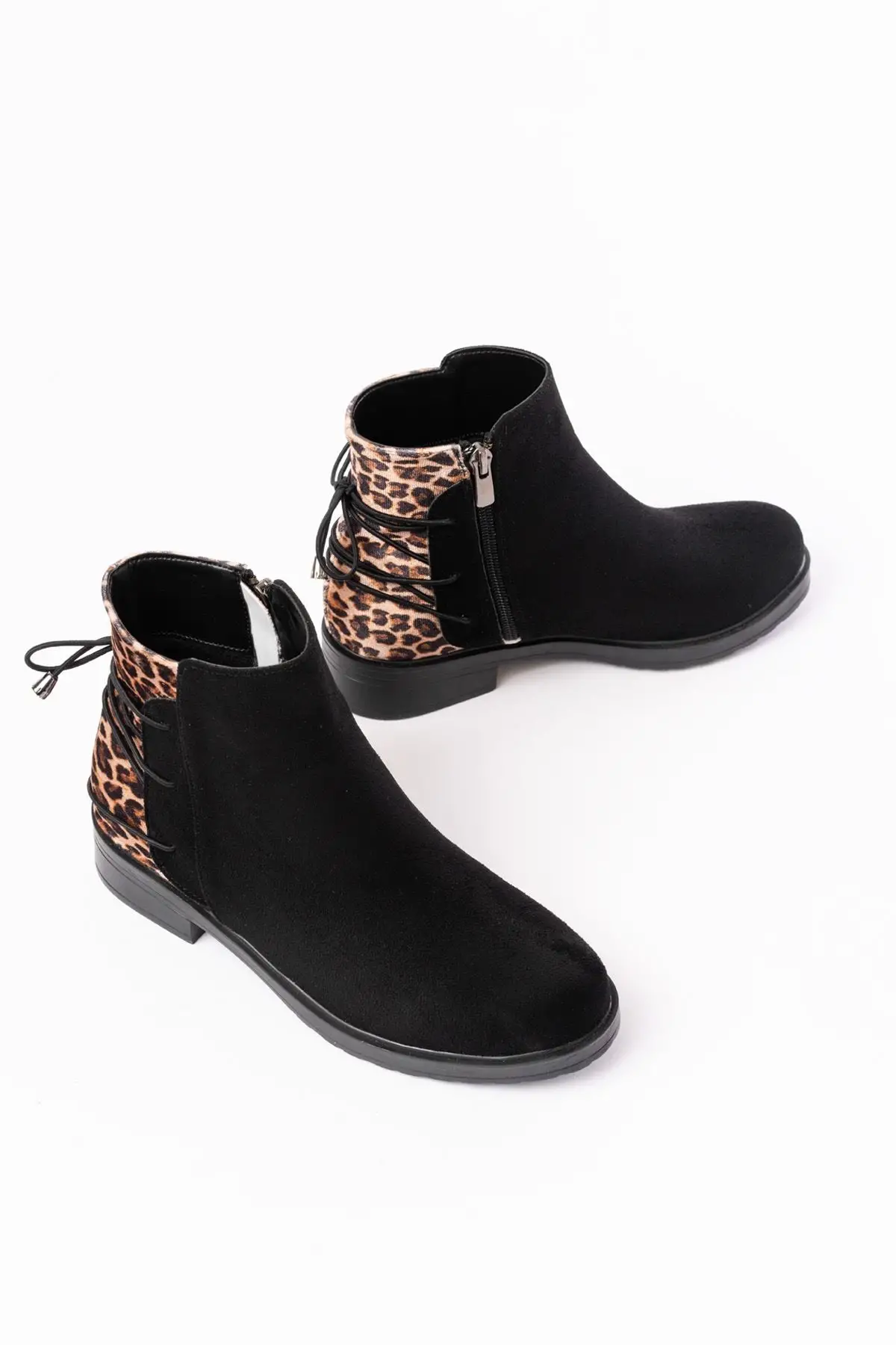 Siyah Leopar Arka Bağcık Aksesuarlı Fermuarlı Günlük Kadın Bot