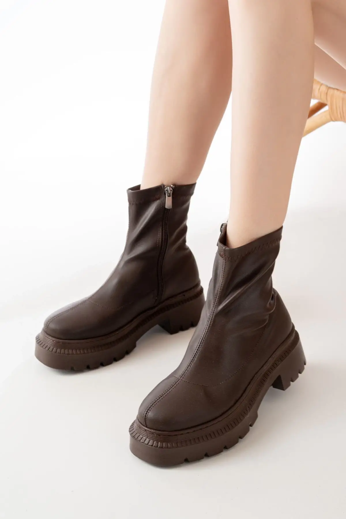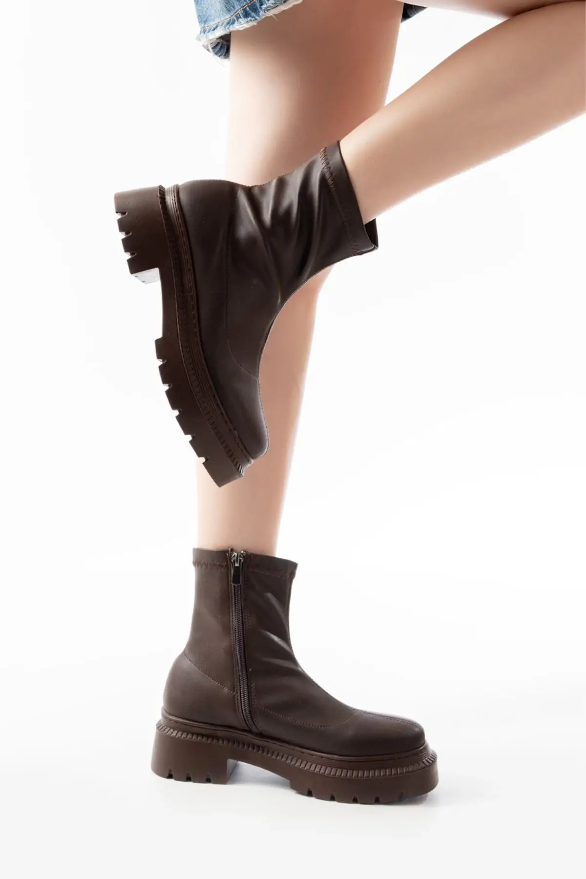 Kahve Streç Fermuarlı Günlük Kadın Bot