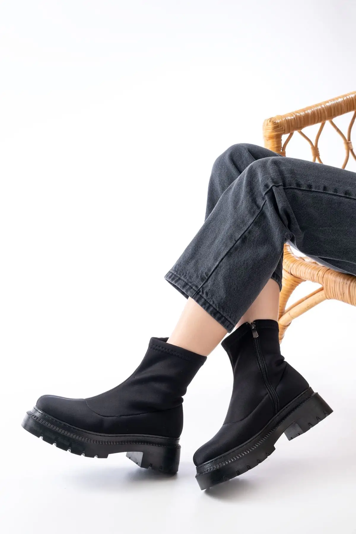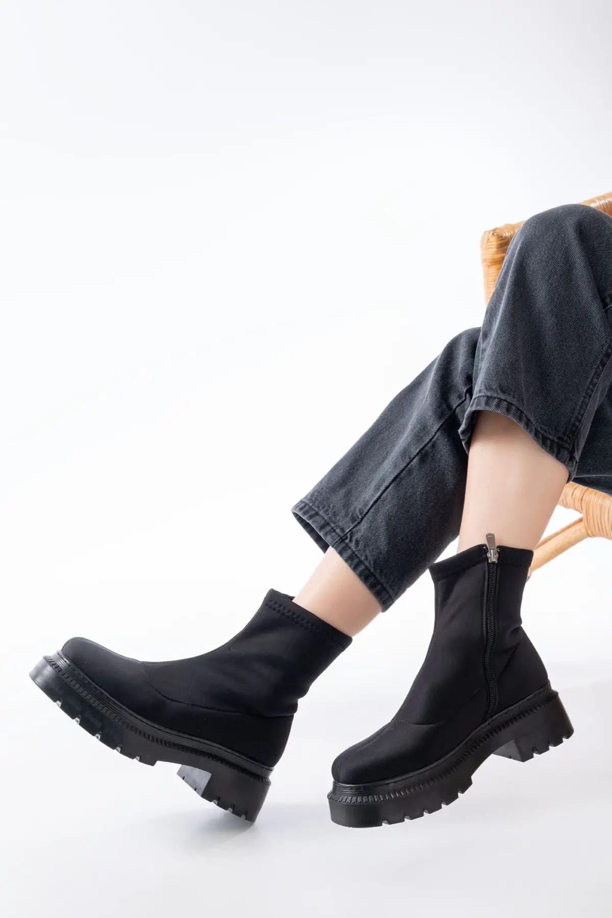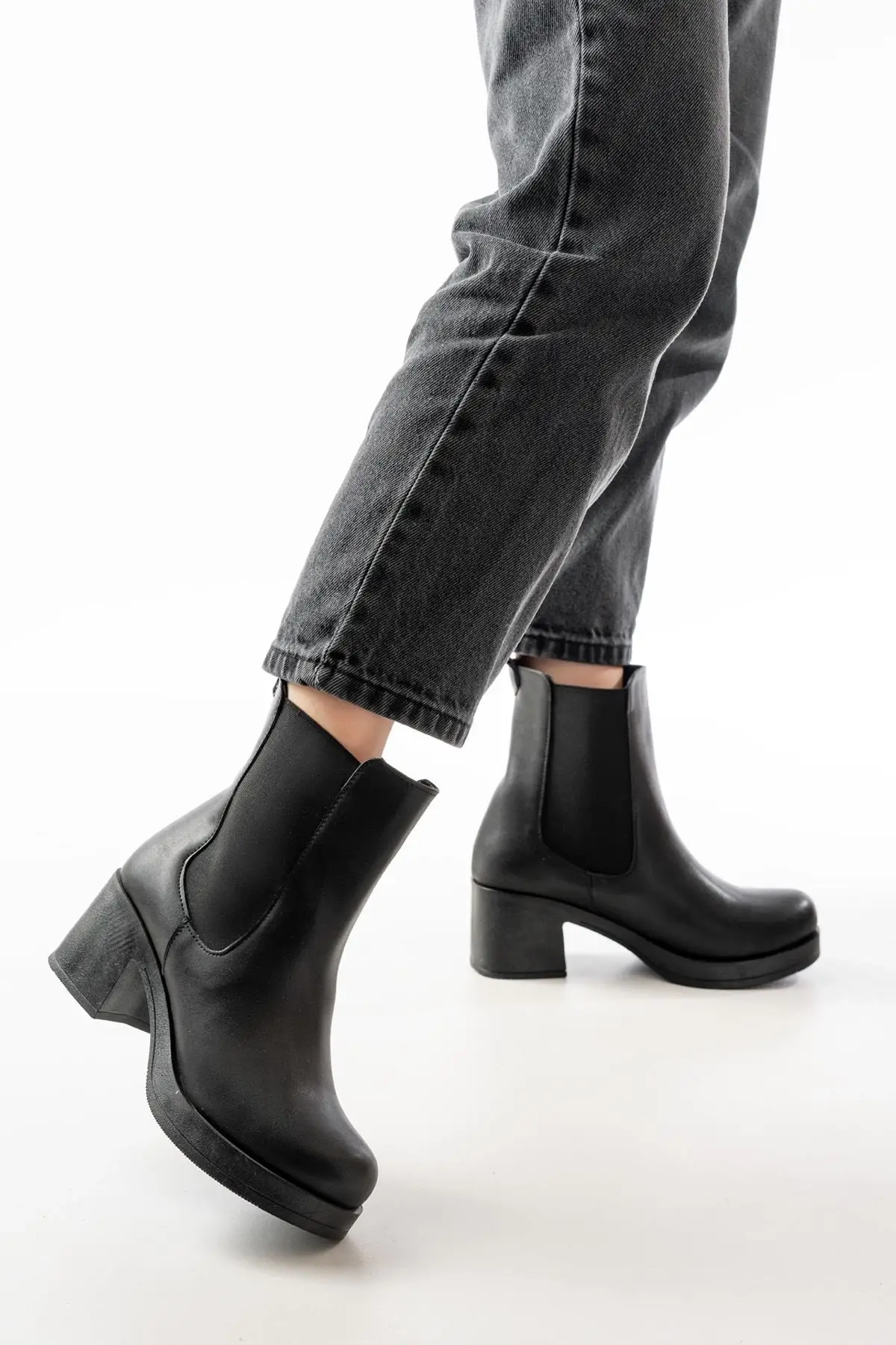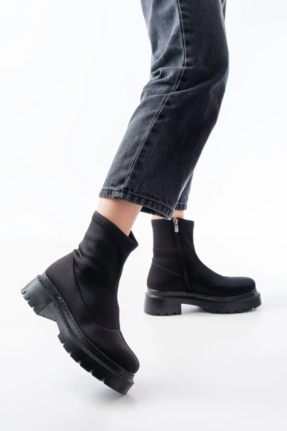 Siyah Lastikli Fermuarlı Kalın Topuklu Günlük Kadın Bot